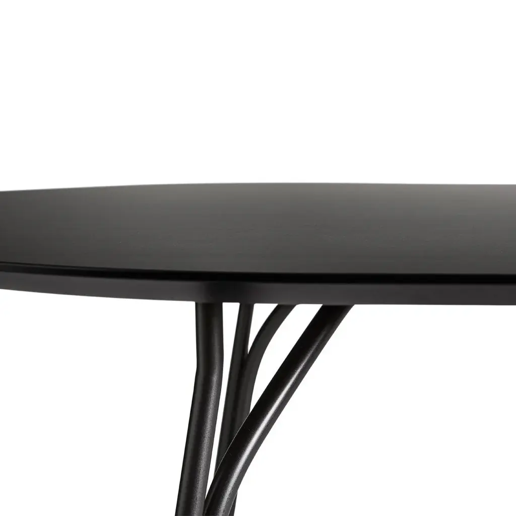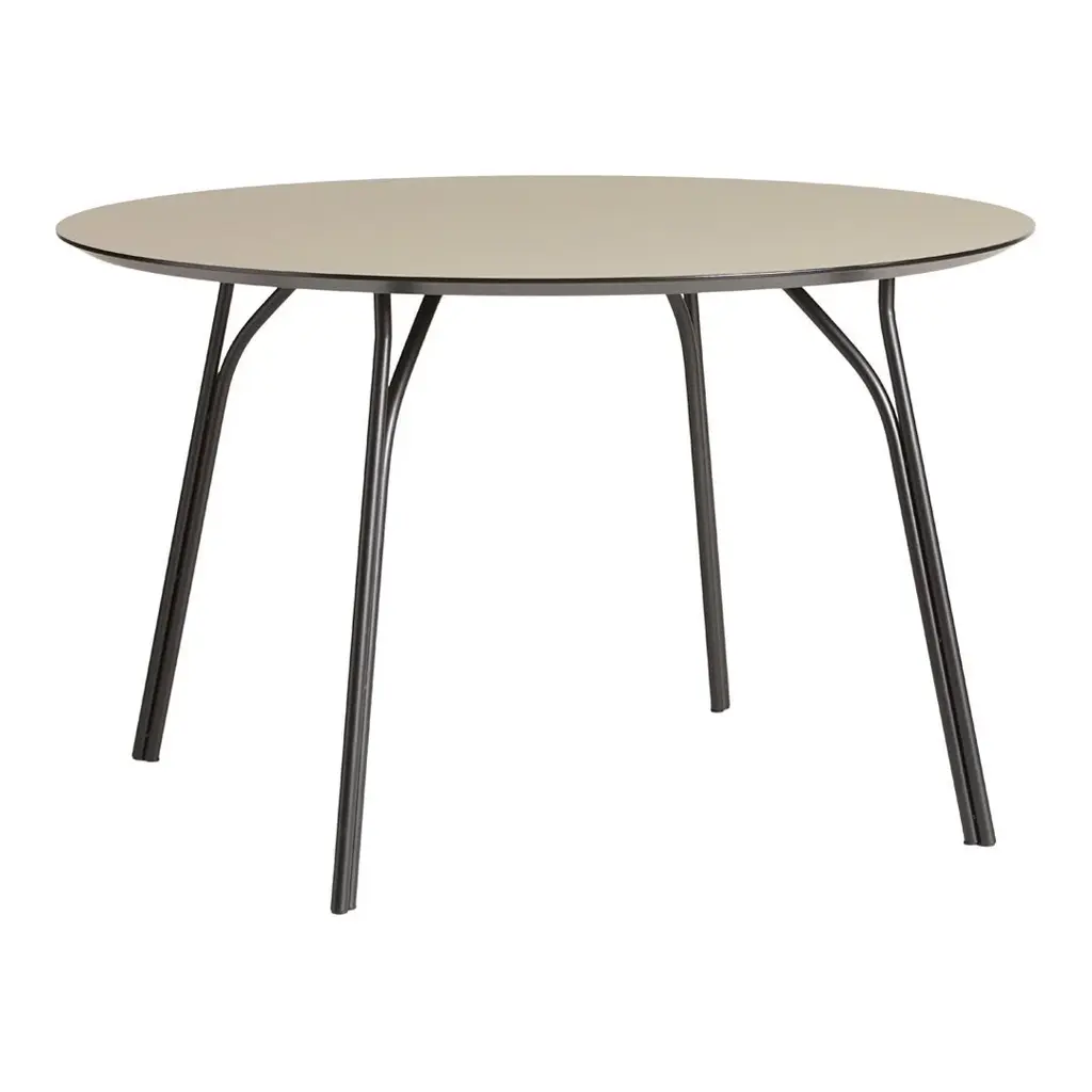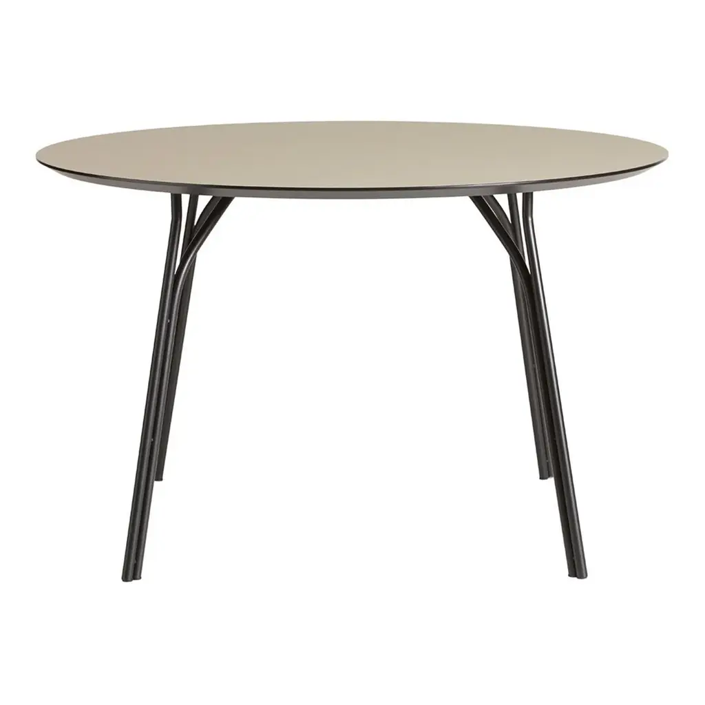 Tree's sleek metal legs call to mind branches of a tree. The two steel tubes rise from the ground side by side, before their path separates to support the tabletop in several places, while forming an arborescent pattern inspired by the lightness of trees rising. Like a bundle of stems, the legs lift the circular top illustrating the leafy canopy while the round shape invites conversation and gatherings with family and friends.