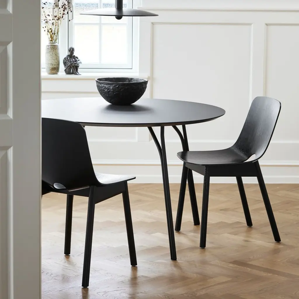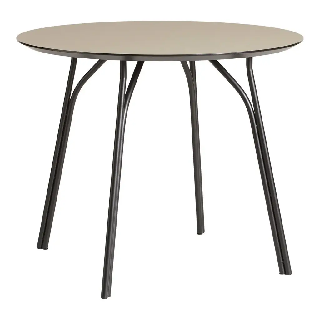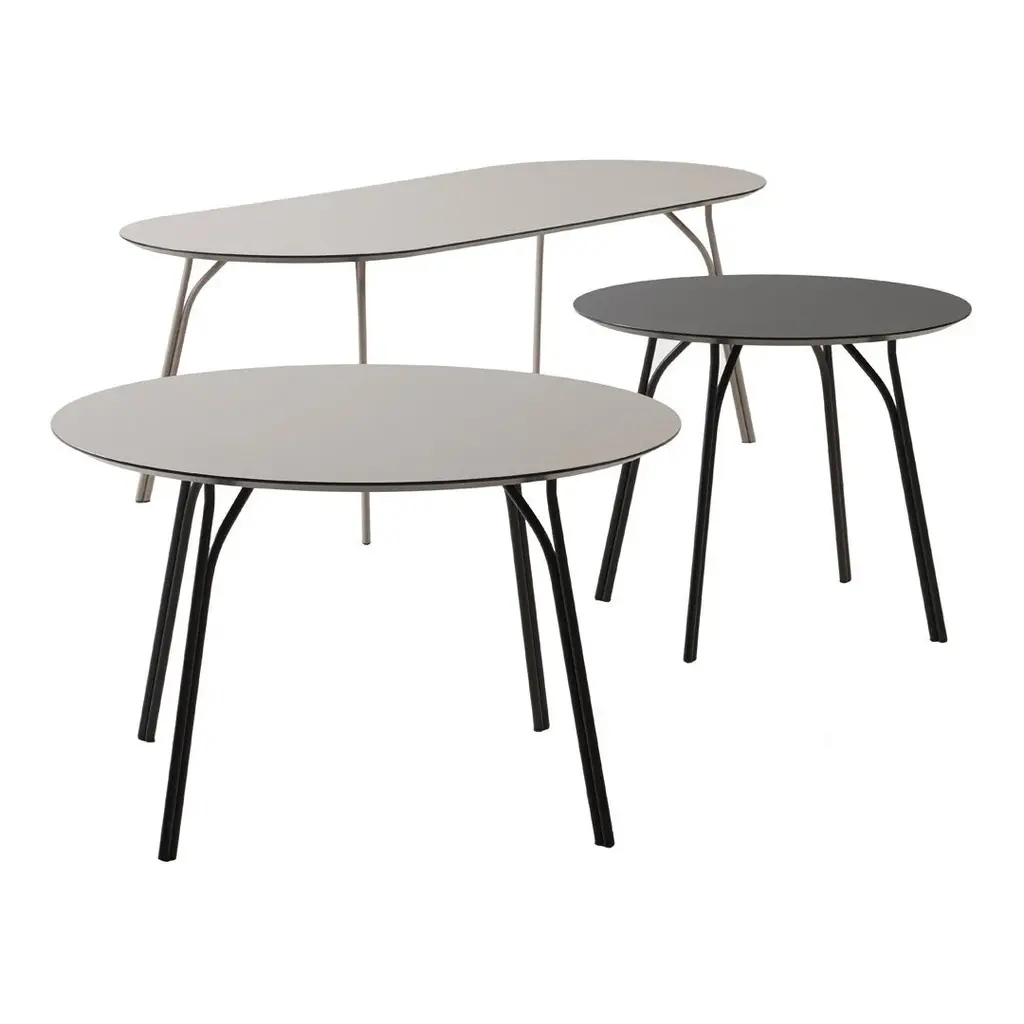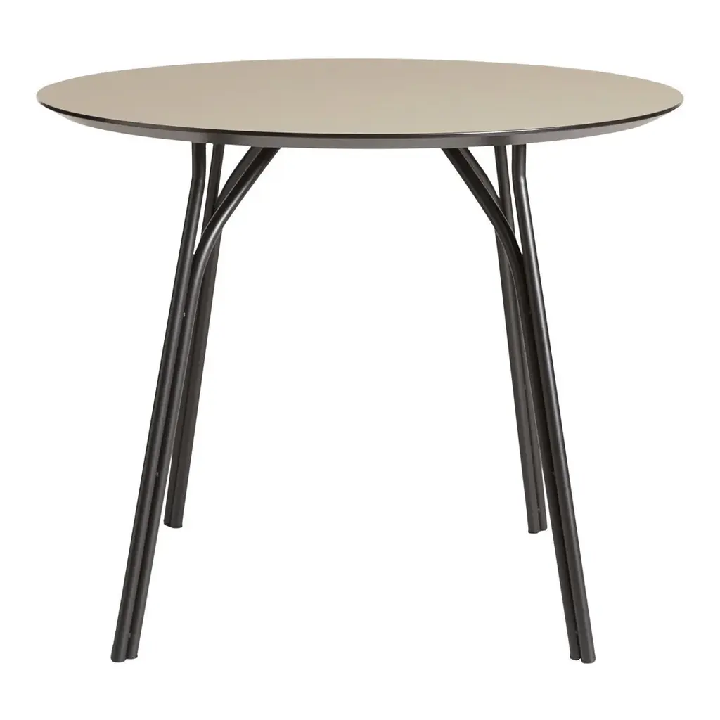 Tree's sleek metal legs call to mind branches of a tree. The two steel tubes rise from the ground side by side, before their path separates to support the tabletop in several places, while forming an arborescent pattern inspired by the lightness of trees rising. Like a bundle of stems, the legs lift the circular top illustrating the leafy canopy while the round shape invites conversation and gatherings with family and friends.