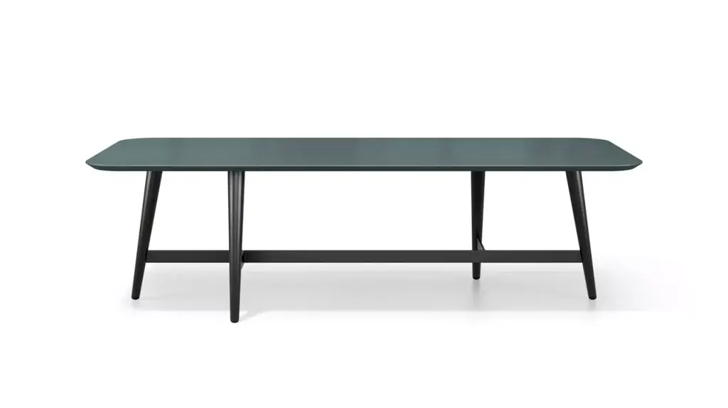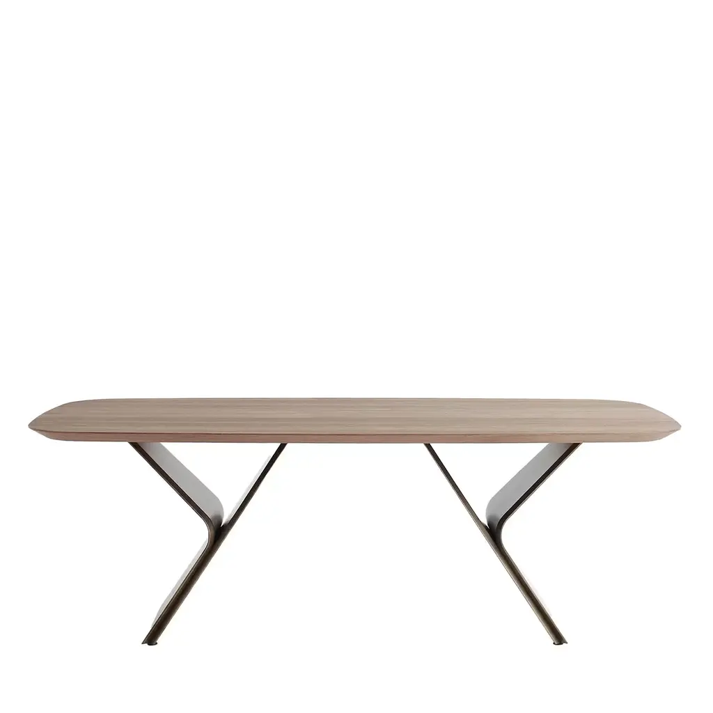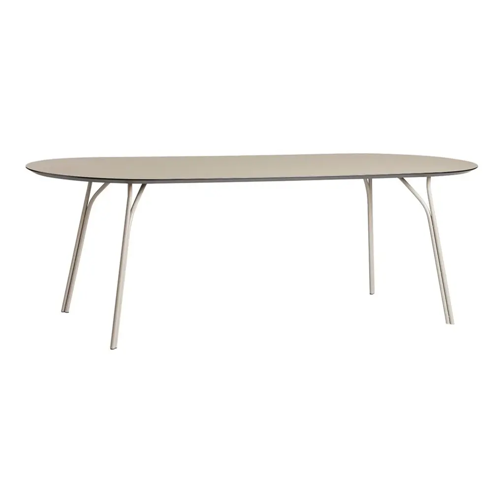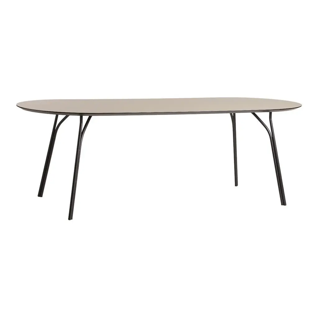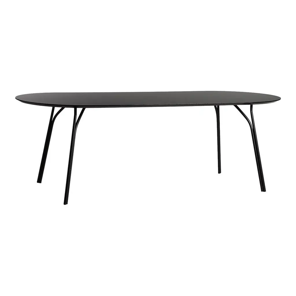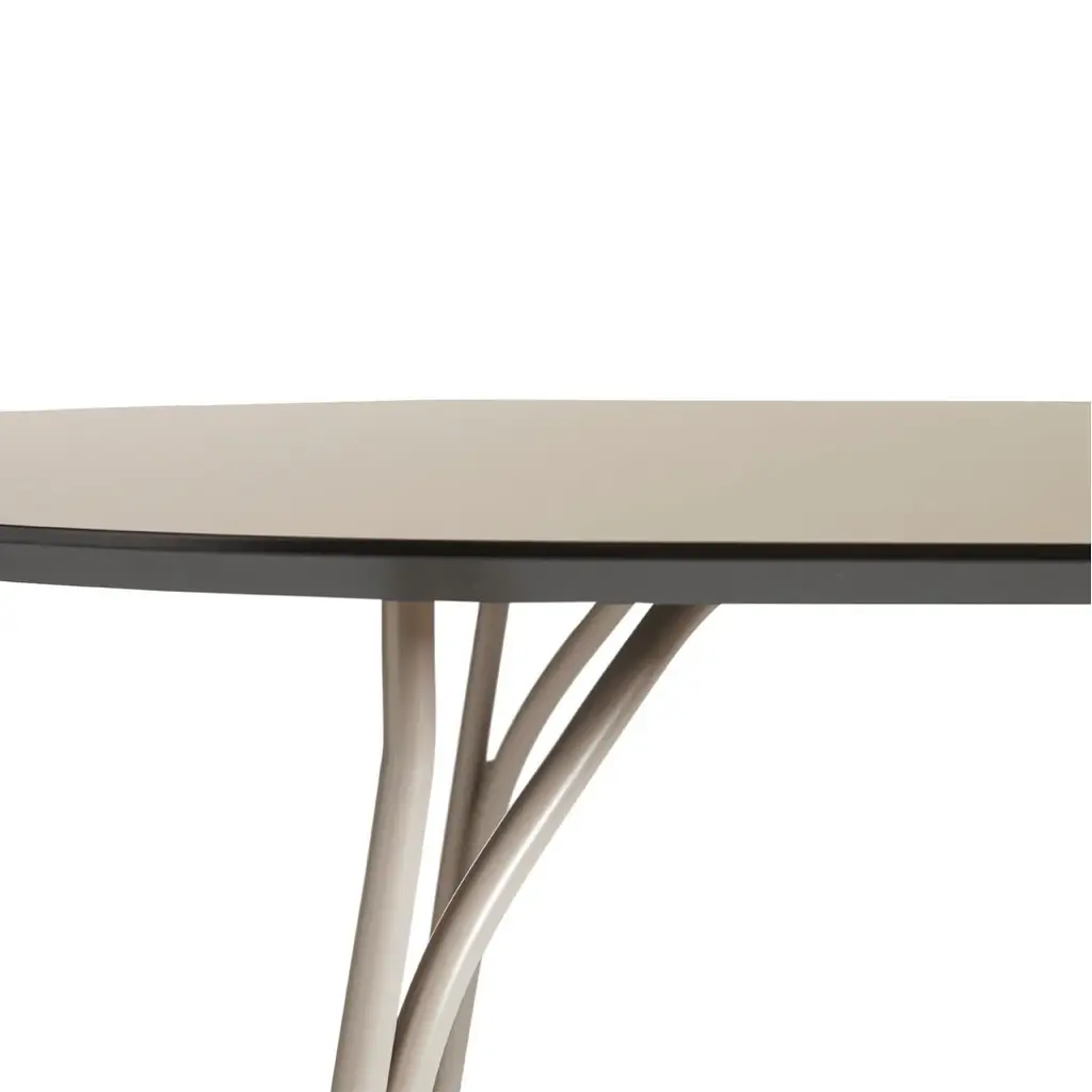Tree's sleek metal legs call to mind branches of a tree. The two steel tubes rise from the ground side by side, before their path separates to support the tabletop in several places, while forming an arborescent pattern inspired by the lightness of trees rising. Like a bundle of stems, the legs lift the circular top illustrating the leafy canopy while the round shape invites conversation and gatherings with family and friends.