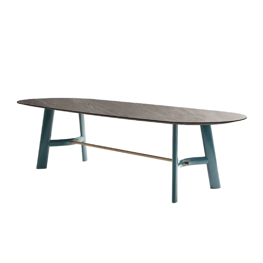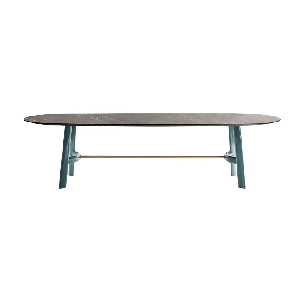 The Trestle Leg Dining Table by Lema is a reference to the " complex simplicity" of trestle tables . Born as solid work tools around the mid-20th century, over time they found their space as design pieces in our homes. The top is available in different sizes and a variety of materials including marble and wood, made light thanks to the thin top . The support trestles, connected to each other in patinated bronze with a slightly curved wooden crosspiece, reflects the aesthetics that inspire the table. The legs are available with a glossy lacquered finish or in heat-treated oak-stained ash which can be combined with different tops, further expanding the potential for compositional customization : glossy and matt elements create unique and personal visual combinations that change the product's appeal and adapt it to multiple contexts
