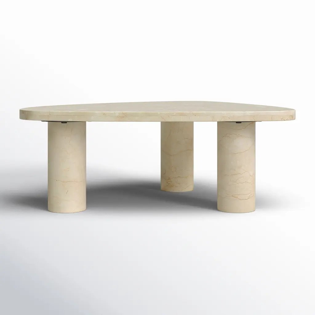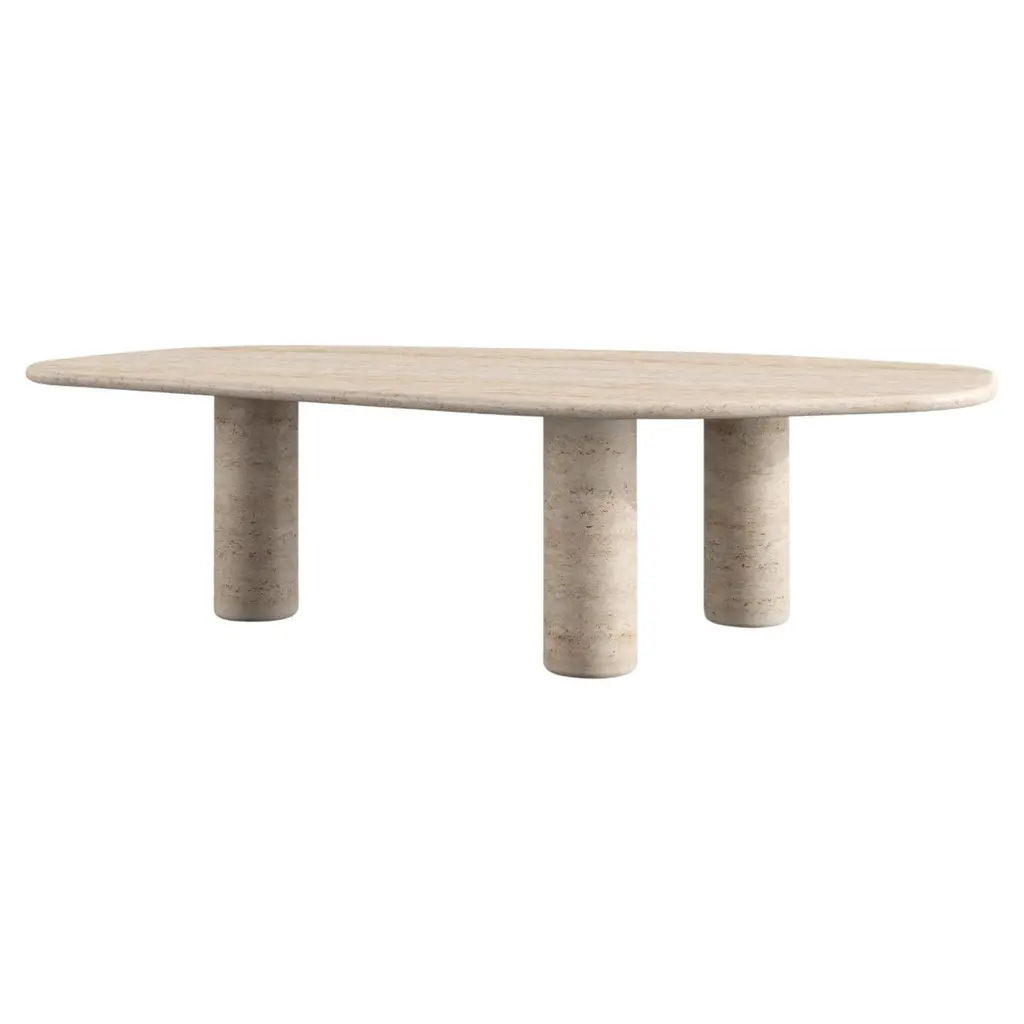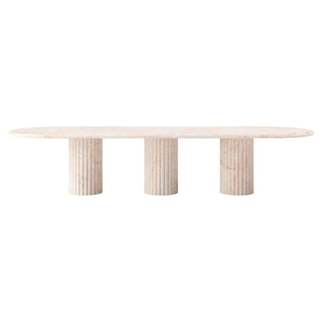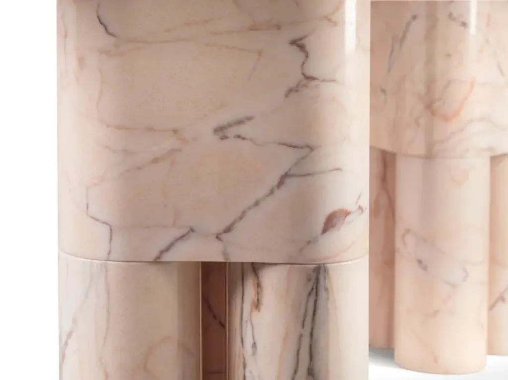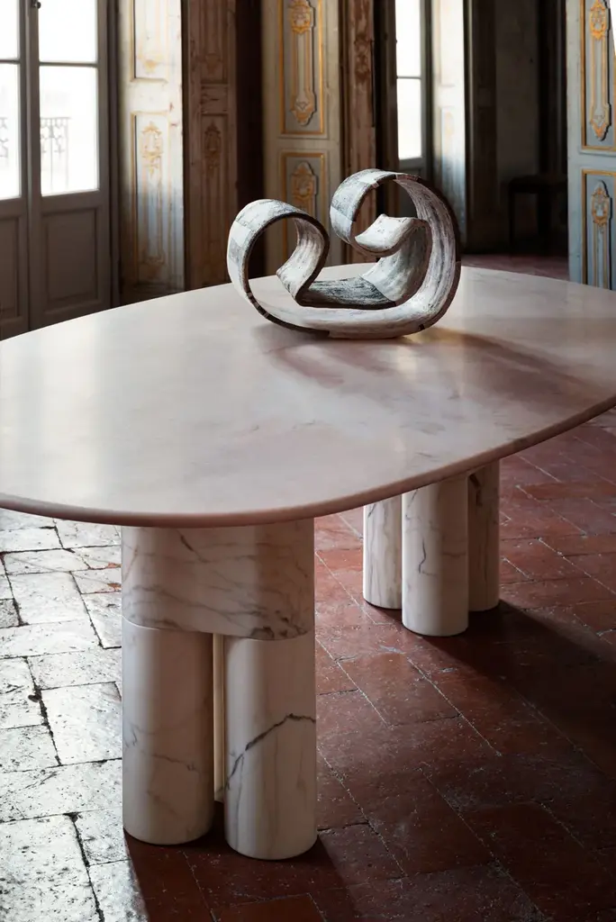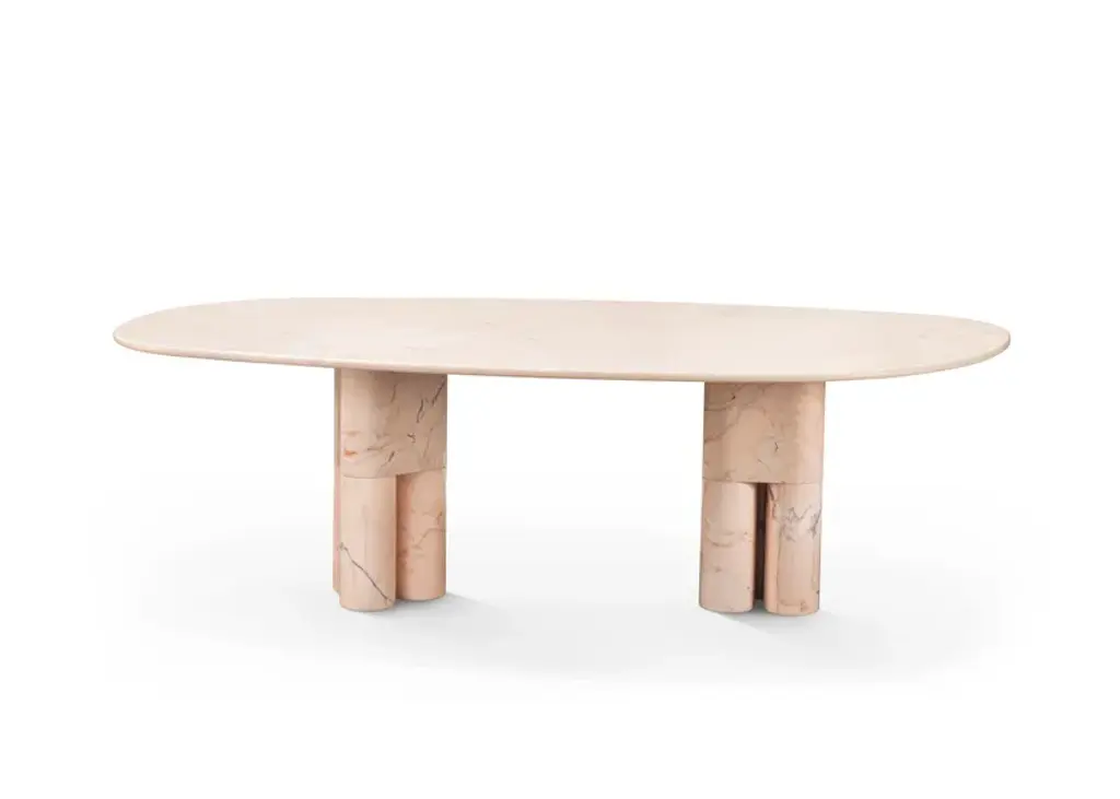 Tria is a dining table with irregularly shaped top, inspired by the section of a river stone, evokes the fluidity and harmony of nature making it a prominent element in any environment.Selected for its exceptional quality and color, Portuguese pink marble is renowned for its delicate veins that run across the surface, with nuances that make it unique. The top is supported by zoomorphic sculptured bases made of the same material.