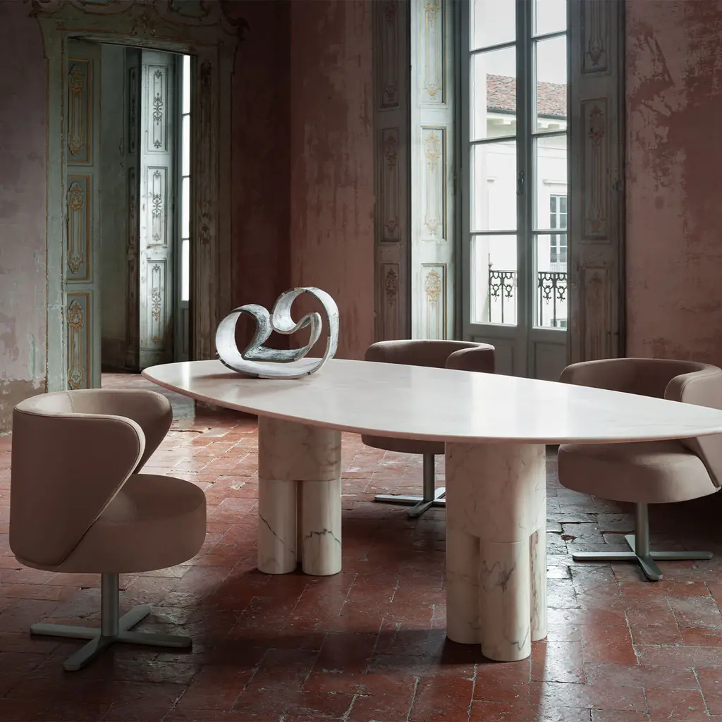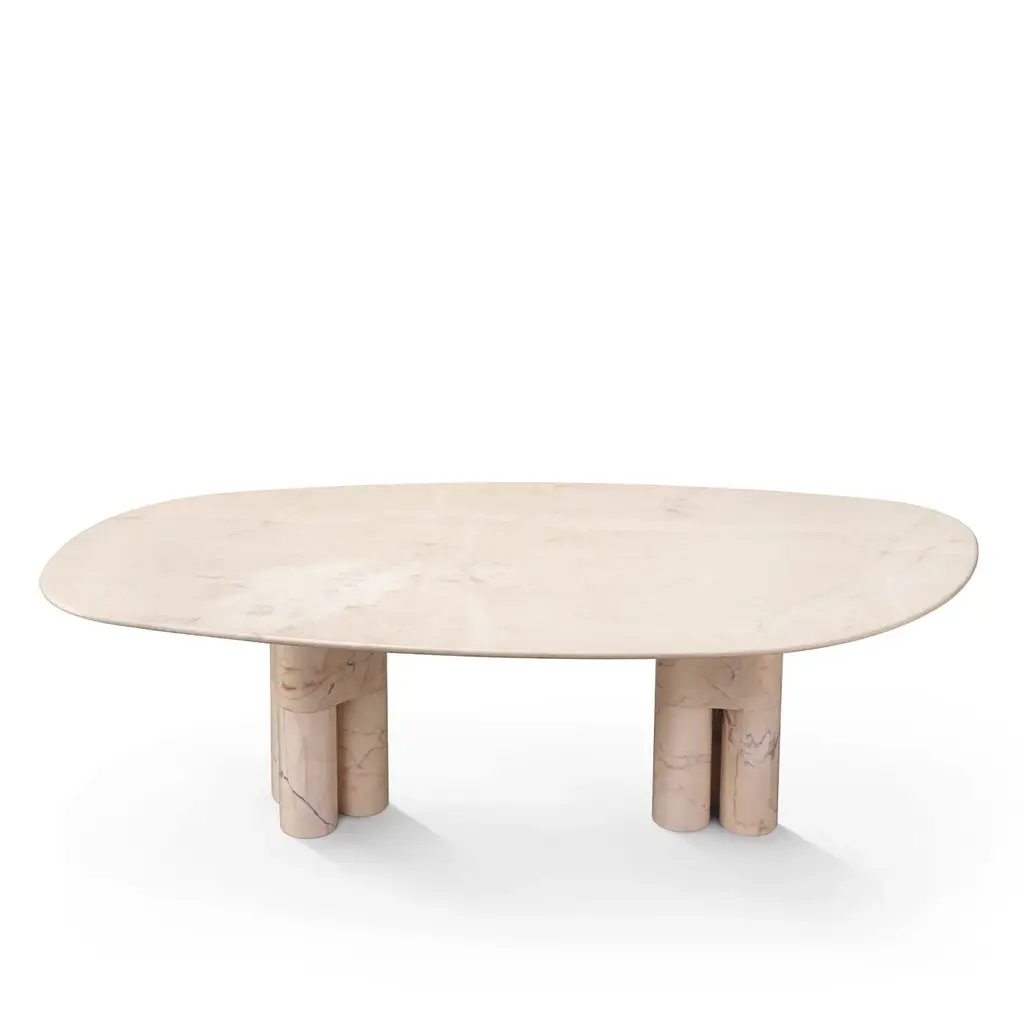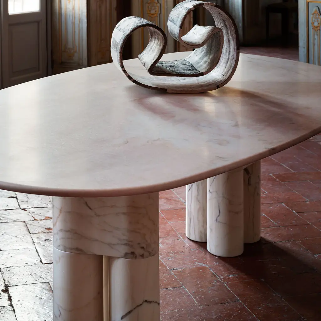 Refined and contemporary in its distribution of sculptural volumes, this dining table in prized Pink Portugal marble distills refined opulence. A couple of zoomorphic-inspired legs sustains the wide top, its irregular shape conceived having a river stone's section in mind as a mean for celebrating nature. Feminine in its subtle pink shades, the table flaunts unrepeatable delicate veins.