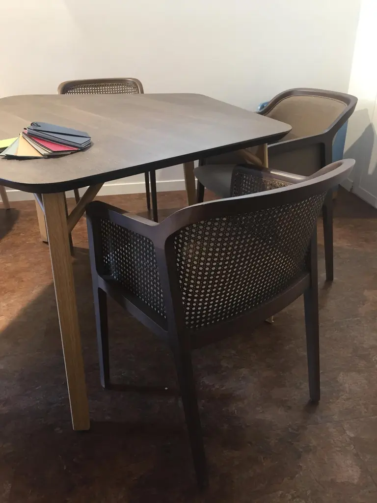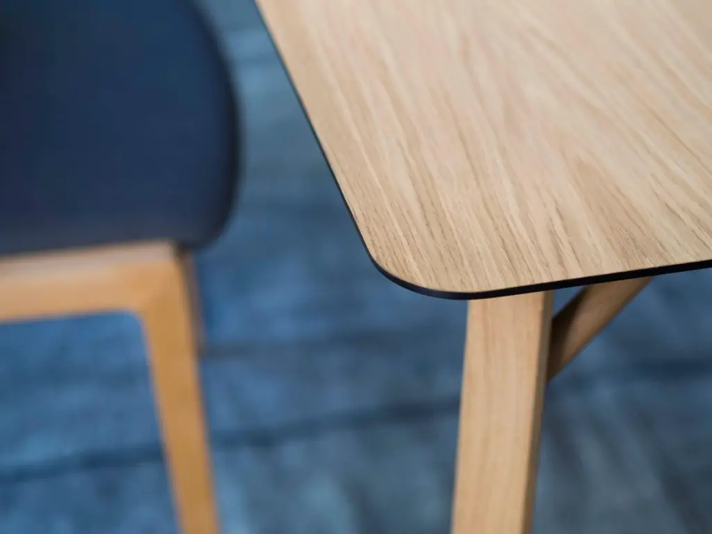 Tria tables are characterized by the legs that take up the triangular section of the homonymous chairs, evoking branches that will then be assembled on tops with classical (round and rectangular) and unexpected shapes, all with rounded corners and suitable also for the sinuous bodies of Tria chairs. Tria table in its neatness can host, apart Tria, various different chairs like Vienna chair, Bokken chair and Tria simple chair as suggested in the pictures.Tria table in its neatness can host different chairs and can be customized according with the chair finishingTria Tetra, the listed one, is squared or rectangular, but you can choose among different sizes and finishing upon request (Tria Kiklos is round, Tria Penta and Octa have respectively five and eight irregular sides). This is because the wiz of this table is the leg, then size and shape have to be fit to your dining room, veranda or kitchen.Legs are made of solid oak. Table top is lacquered in black with a special scratch-proof painting; but can be purchased also in natural oak veneered or stained Canaletto walnut with chamfered bottom edge or lacquered in white.Upon request customizations (only for q.ties): laminated white or anthracite top; special sizes.