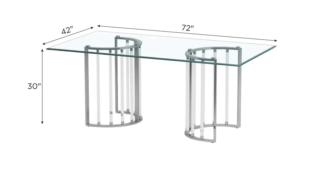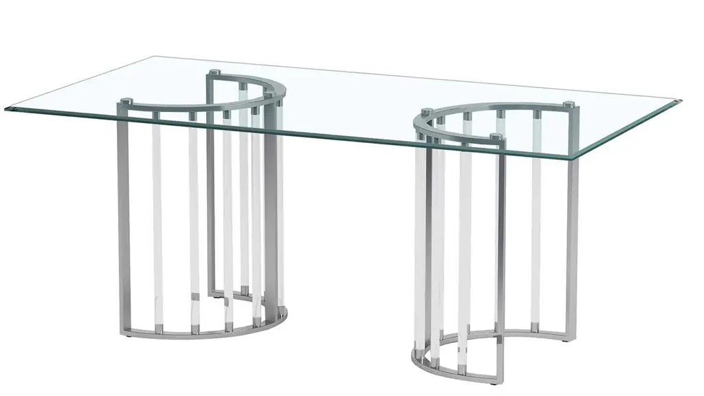 Trisha Glass Dining Table is sure to take your dining area to the next level. Set atop two semi -circle base pieces, the steel and acrylic features will add a polish you're sure to appreciate.