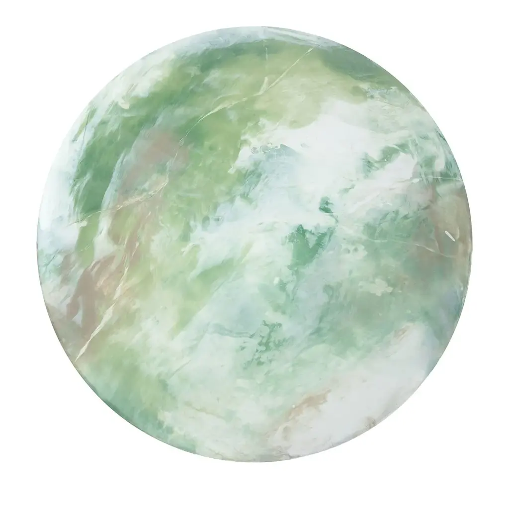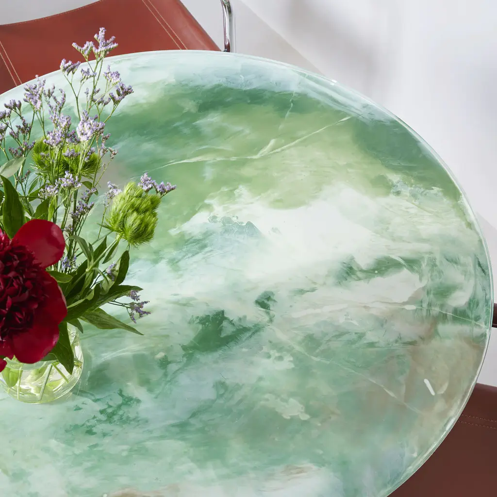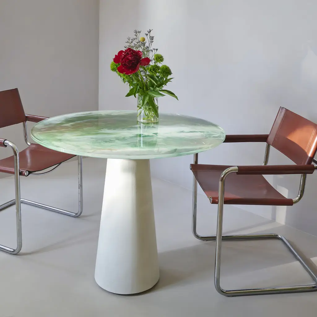 A Grautek base - cement-based material - of exceptional performance was selected for the base for this stunning dining table. Finished with a protective layer making it apt for safe outdoor use, it enhances, by contrast, the marvelous reflections of the green-toned tempered glass top, which boasts singular textures and veins applied by hand. Please explore customizations and size variants with the Concierge.