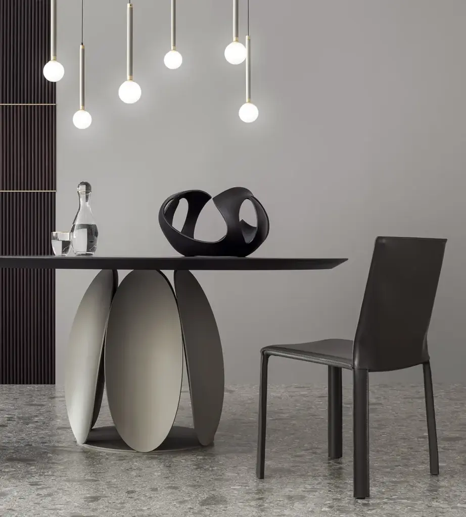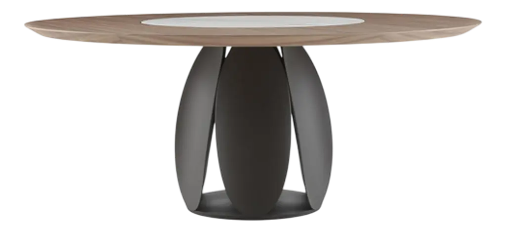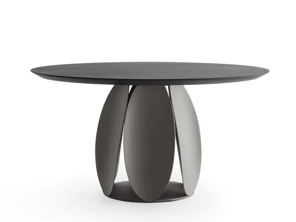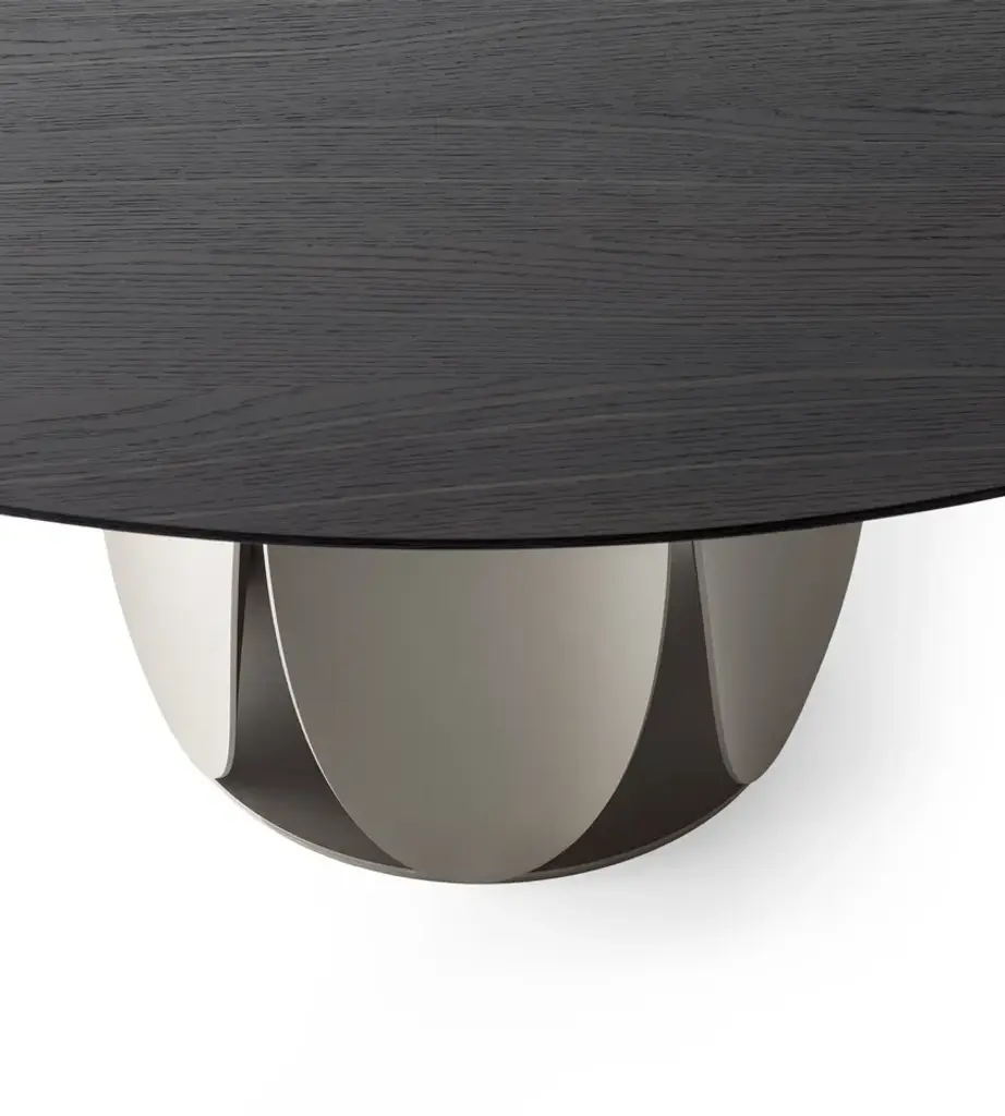 TULIPANO is a table with MDF top and base in calendered, epoxy powder-coated metal and champagne finish. Top in MDF with real Laguna sessile oak veneer, 4 cm thick, with 60° sloping edge, hand-edged and finished using low environmental impact varnishes.Available in two sizes:cod. HM.TUL.DP.RL.MC: Ø 140 x H 75 cmcod. HM.TUL.DM.RL.MC: Ø 160 x H 75 cmHaute Couture gets its inspiration from high fashion, where stitching, workmanship and materials are at the core of the design. Dressers are outfitted using hand-crafted leather, the furniture is embellished using precious marble, and the wood is selected on the basis of its grain. The synthesis of this collection is a modern line with a contemporary slant that is embodied in a luxury that is not overly flashy but grounded in sophistication. Timeless products made with high quality materials and handcrafted in Italy.