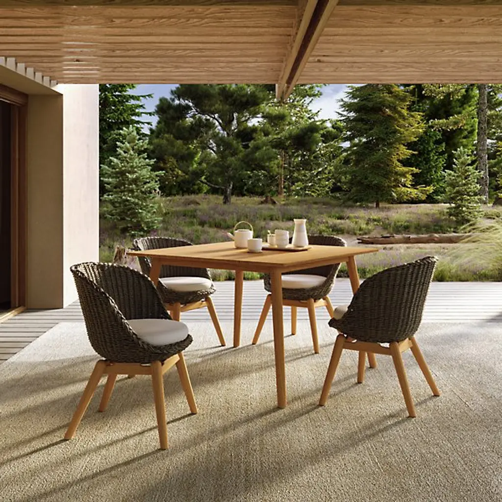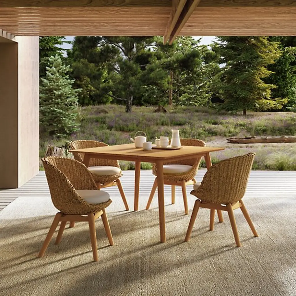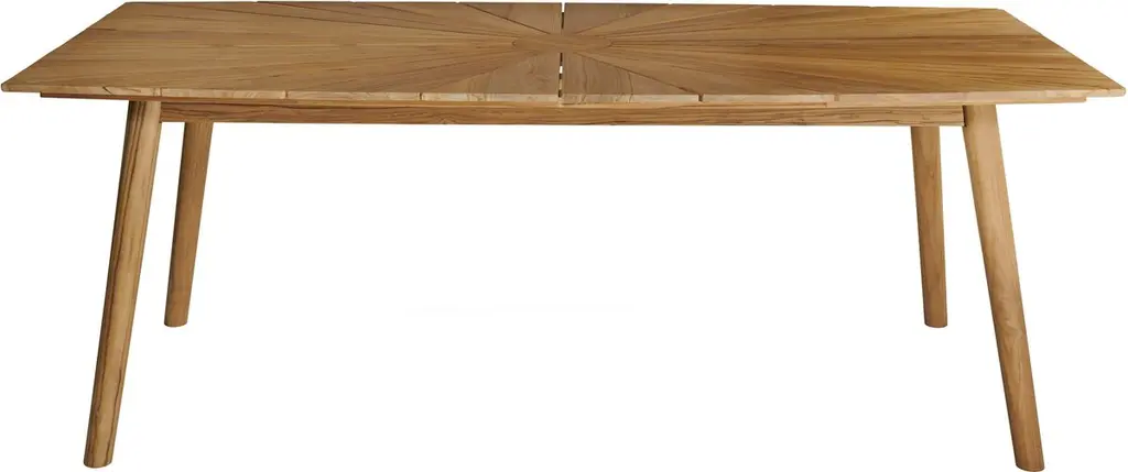 A great option for outdoor dining areas with a mid-century modern design focus. The Tulle 45 inch Square Outdoor Dining Table by Oxford Garden is a refined piece made entirely of solid teak, with tapered legs angling outward for maximum stability. The otherwise solid square top has a removeable plug to accommodate an umbrella. Regular use of teak oil will keep the wood looking new, or you can choose to let it age naturally and gain a soft grey patina.