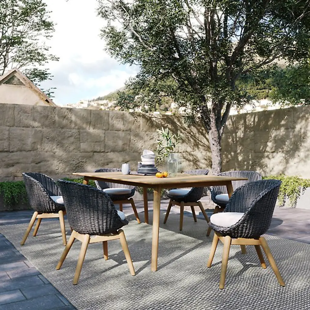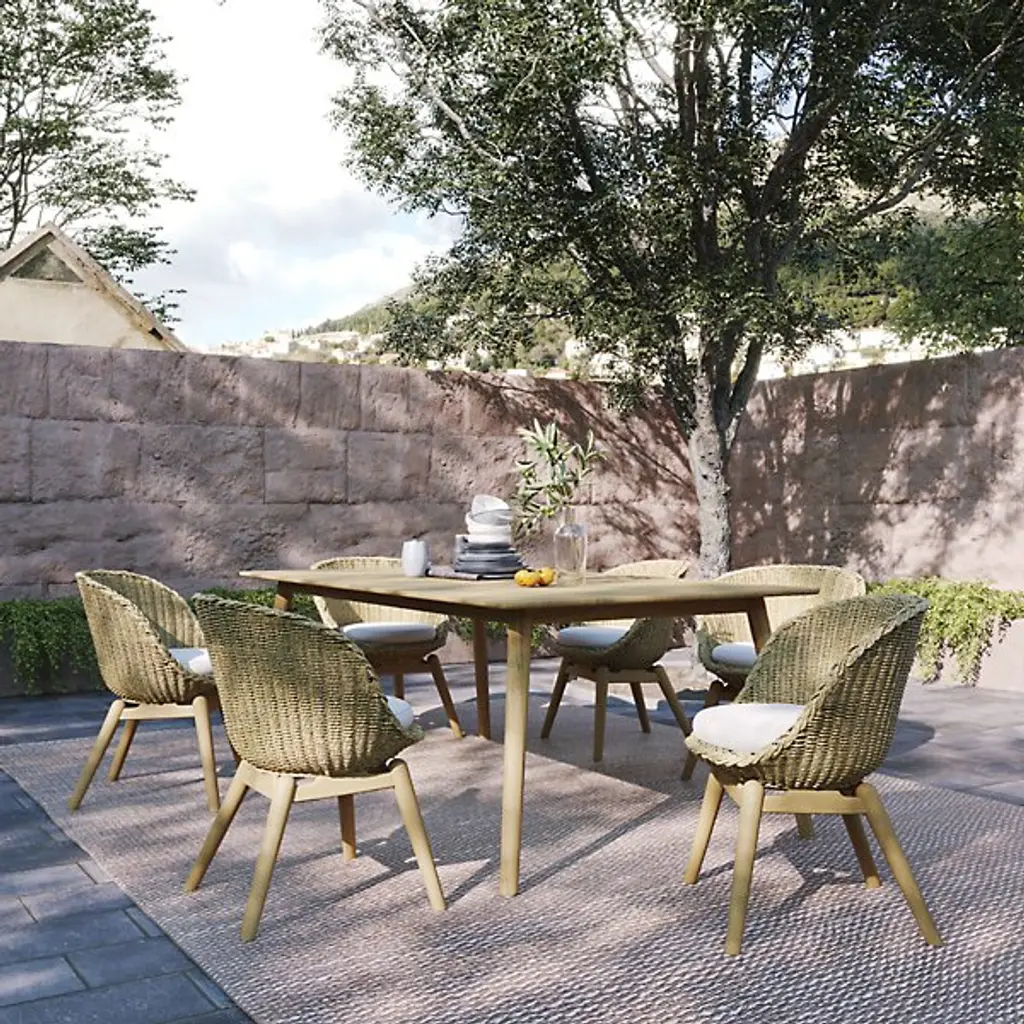 The Tulle 78 inch Rectangular Outdoor Dining Table by Oxford Garden brings a refined touch of mid-century modern design to outdoor dining areas. It features an expansive rectangular surface supported by tapered peg legs, which splay outward for added stability and design appeal. The entire piece is made of solid teak, which can be left to naturally patina to a soft grey or kept looking new with the regular use of protective teak oil. Seats up to 8.
