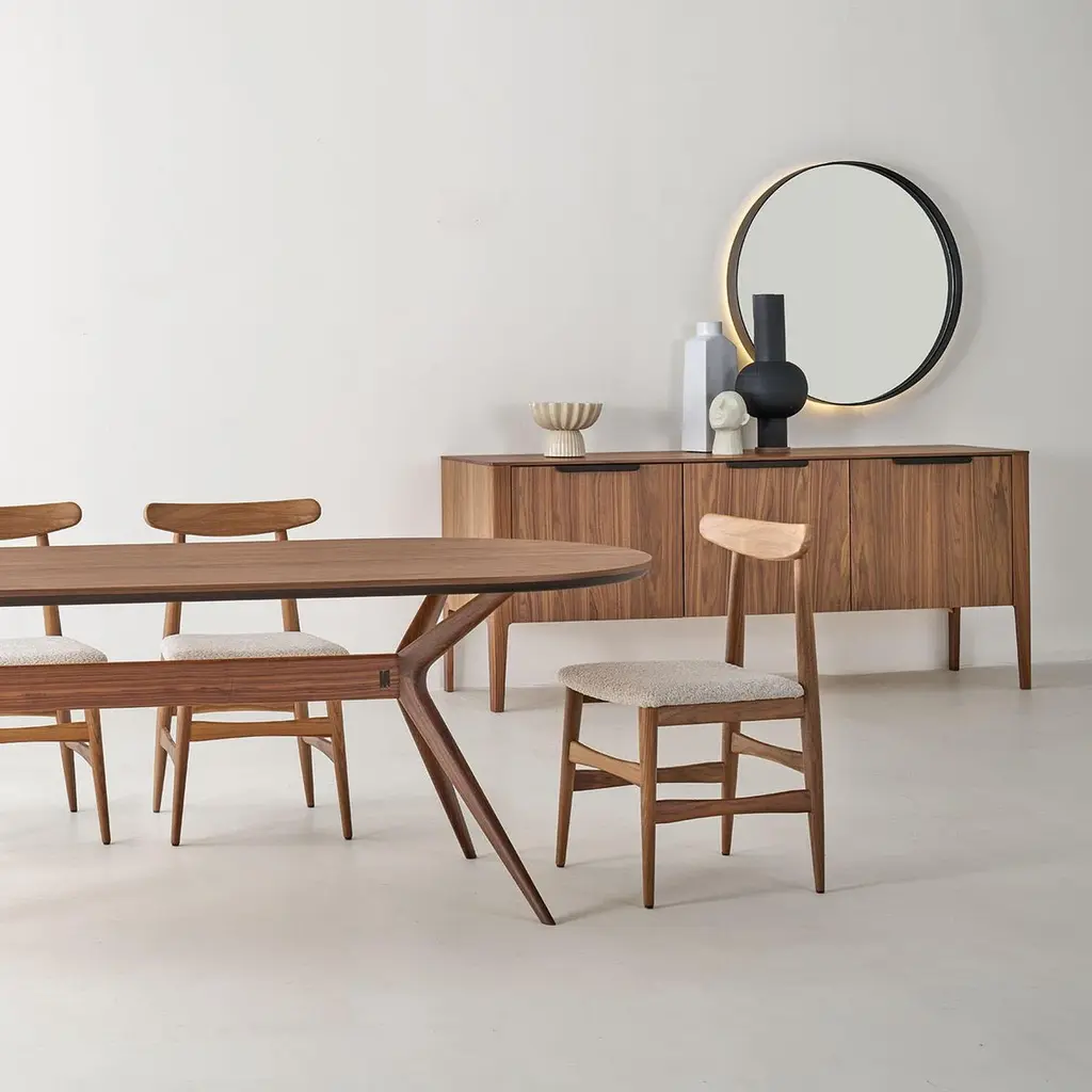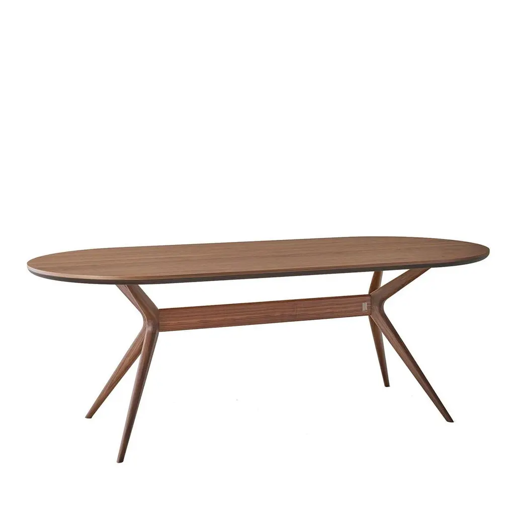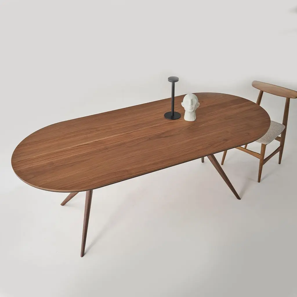 Breathing life into contemporary dining spaces, the Twister Table captivates with its dynamic design. Its oval Canaletto walnut top showcases a seamless flow of natural grain, enhanced by an eco-friendly Havana water-based finish. The interwoven solid wood legs are a structural and artistic marvel, mimicking a twisting motion frozen in time. Perfect for lively dinners or serene gatherings, this table blends movement and stability with effortless charm.