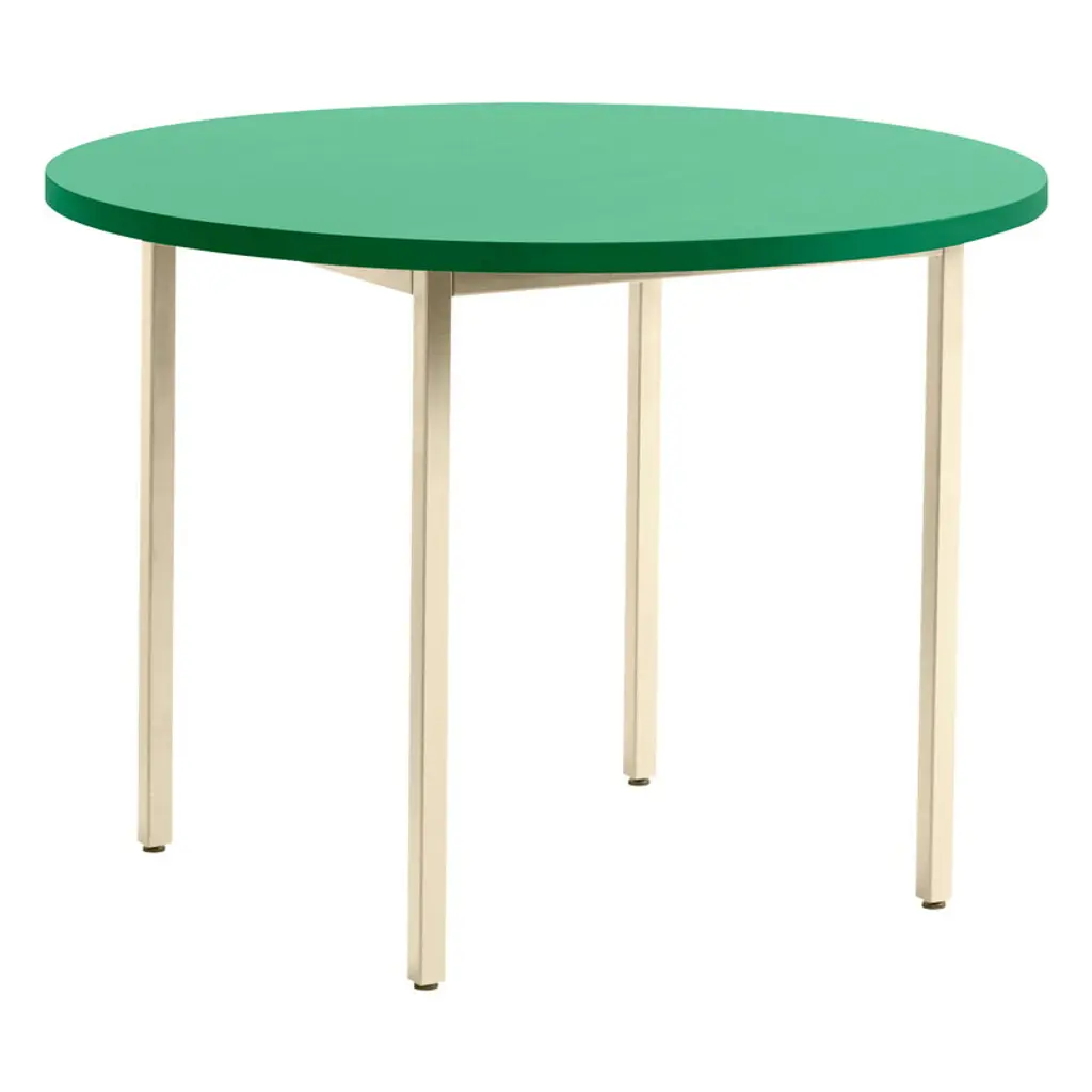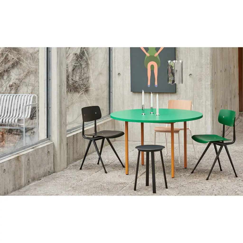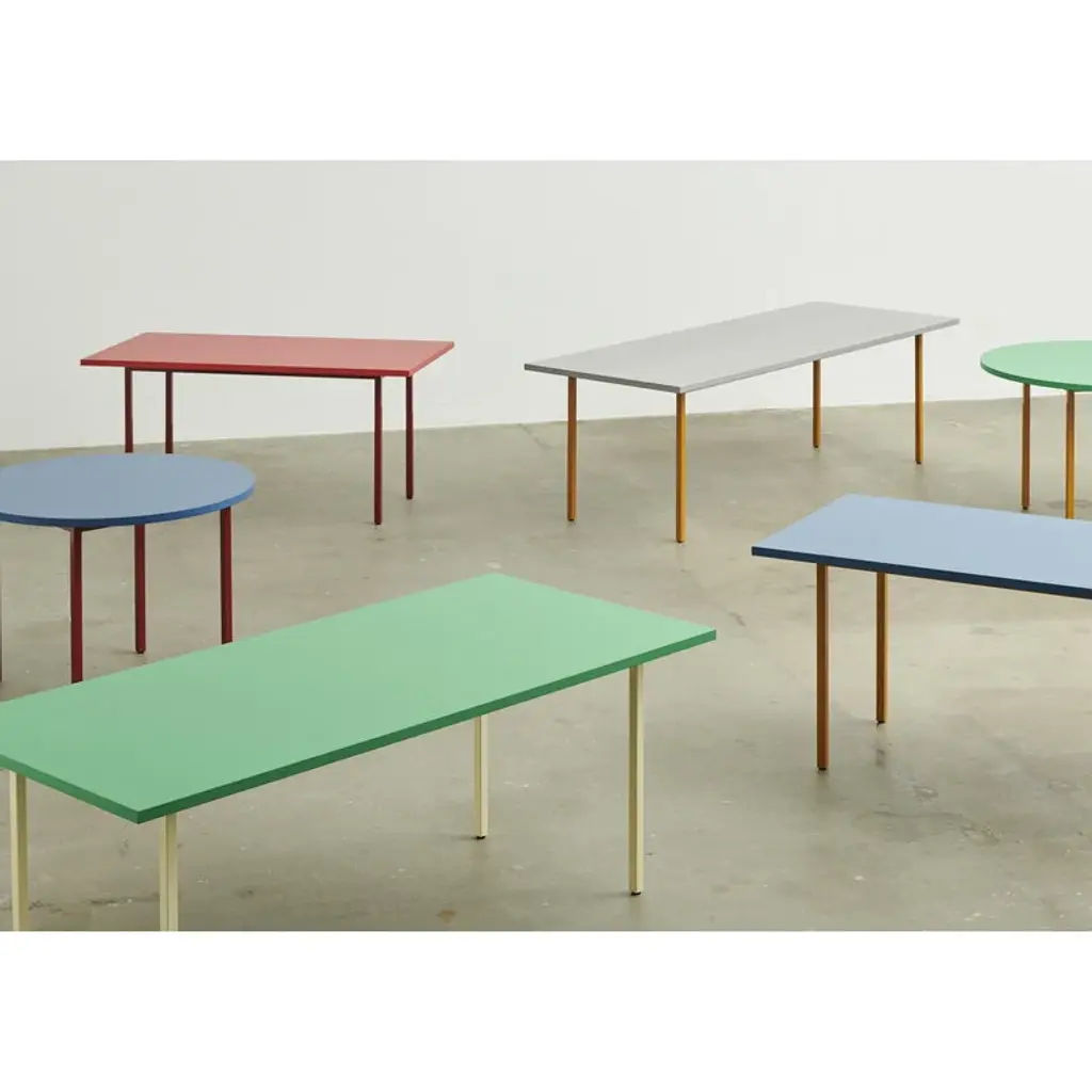 The Two-Color table by HAY is a jovial mix of bursting colors and strict minimalism. Created by Belgian design duo Muller Van Severen, the Two-Color tables feature a unique marriage between two very different components: a sturdy, yet airy steel base and a tabletop crafted from a new SFC certified MDF material, Valchromat. The unique, textured look of the Valchromat is slightly visible through the sheer lacquer, giving the geometric table an organic touch. The no-nonsense silhouette combined with a cheerful palette of colors creates a stunning contrast, adding a touch of understated glee to its surroundings. The sassy yet classy Two-Color table is equally perfect as a dining table or as a conference table at an office.
