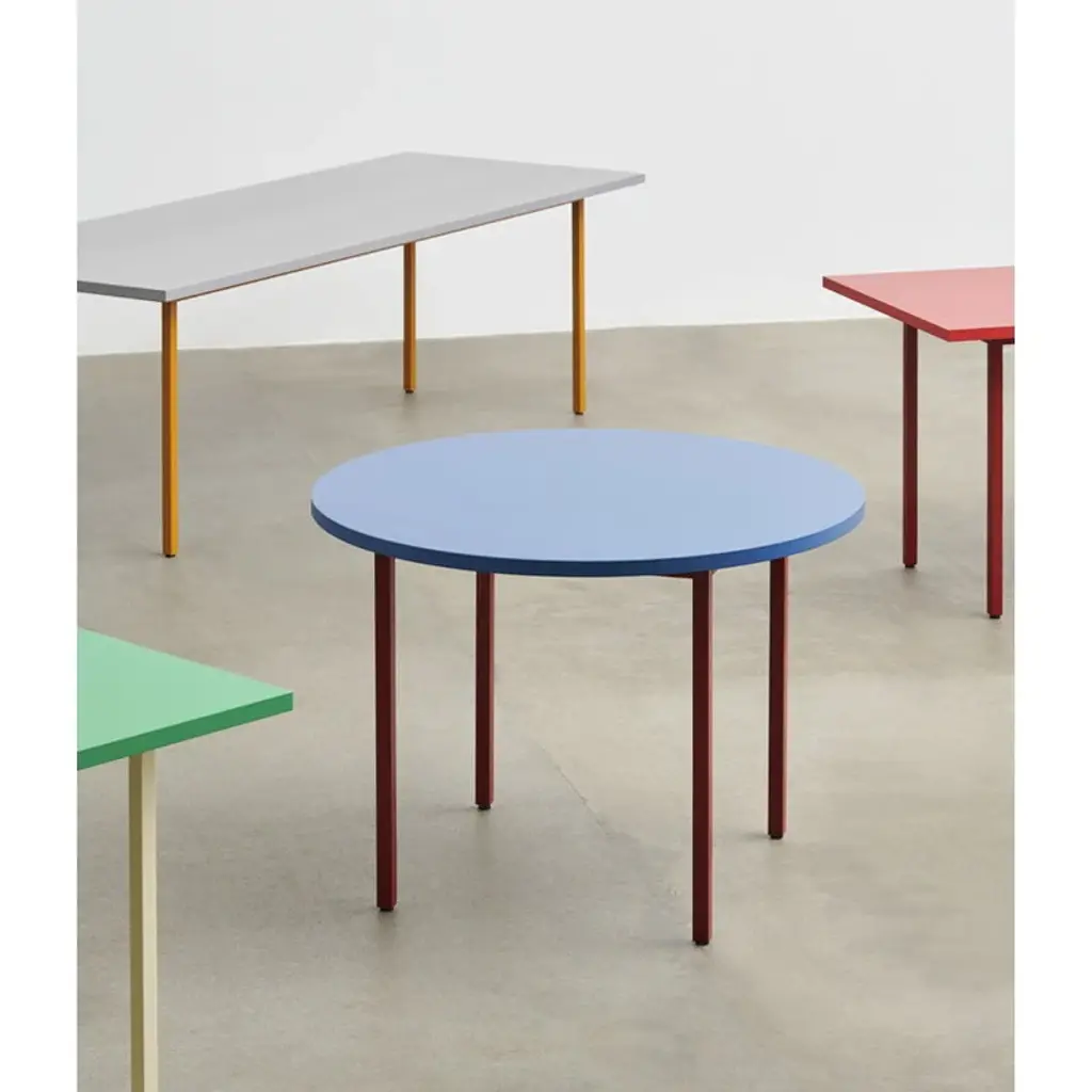 The Two-Color table by HAY is a jovial mix of bursting colors and strict minimalism. Created by Belgian design duo Muller Van Severen, the Two-Color tables feature a unique marriage between two very different components: a sturdy, yet airy steel base and a tabletop crafted from a new SFC certified MDF material, Valchromat. The unique, textured look of the Valchromat is slightly visible through the sheer lacquer, giving the geometric table an organic touch. The no-nonsense silhouette combined with a cheerful palette of colors creates a stunning contrast, adding a touch of understated glee to its surroundings. The sassy yet classy Two-Color table is equally perfect as a dining table or as a conference table at an office.