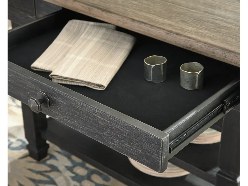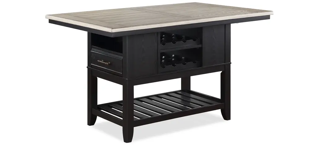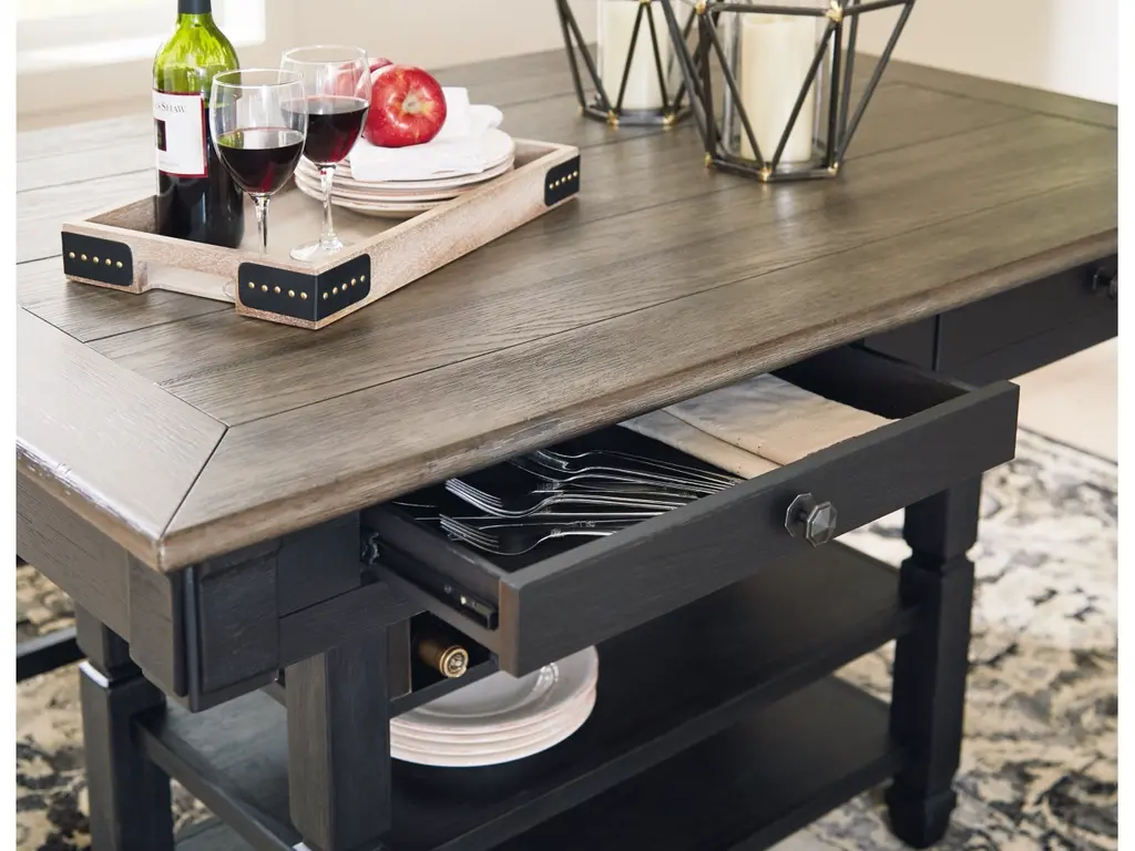 Invite your family into the heart of your home with the Tyler Creek rectangular counter height dining room table. A beautifully textured black finish and a timeworn planked oak top create a unique two-tone contrast. The base provides plenty of storage for wine bottles and other essentials, while drawers offer room for smaller items. This is trend-right urban farmhouse style.