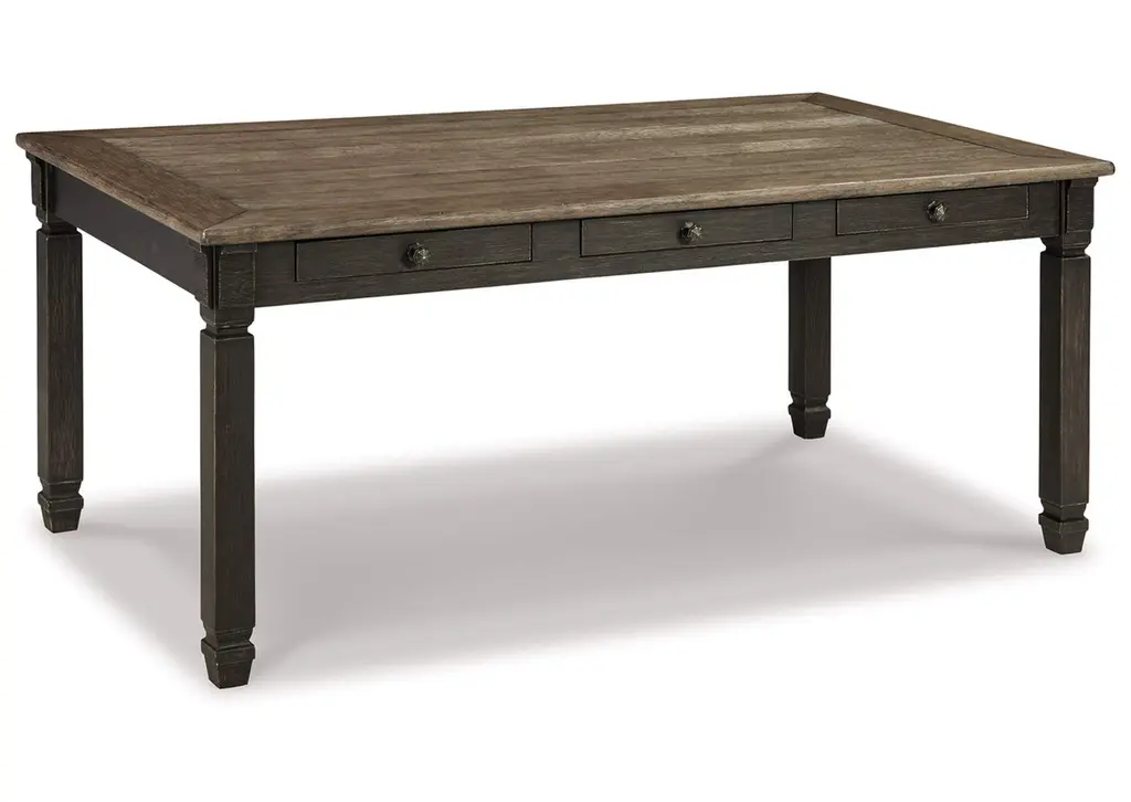 Invite your family into the heart of your home with the Tyler Creek rectangular dining room table. Its tapered legs, in a beautifully textured black finish, provide a sturdy foundation. A timeworn planked oak top creates a unique two-tone contrast, while drawers offer plenty of storage space for smaller items. This is trend-right urban farmhouse style. Weight 145.000 lbs. (65.25kgs.)