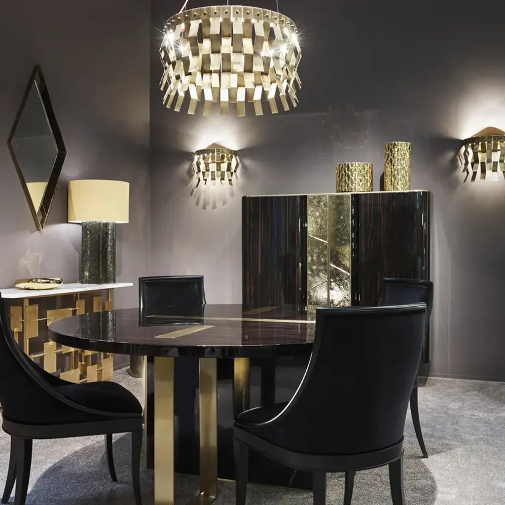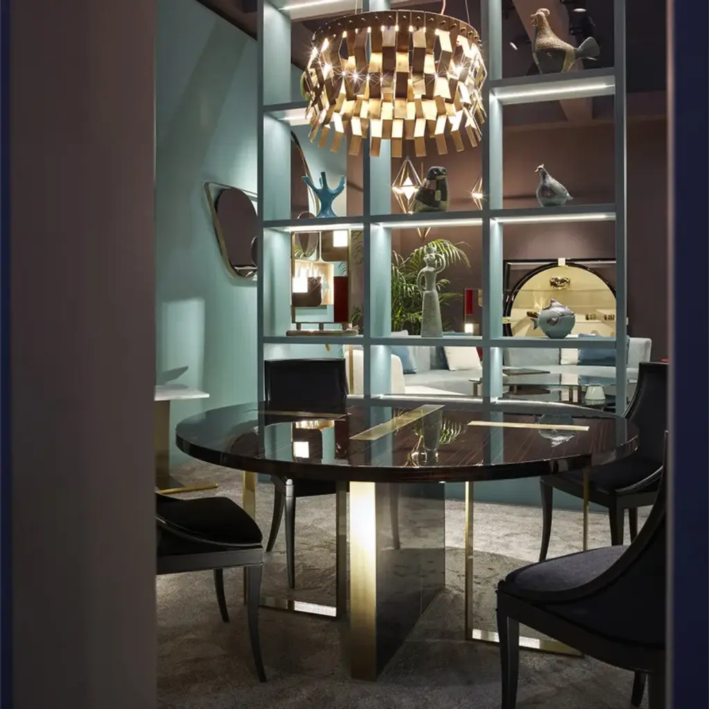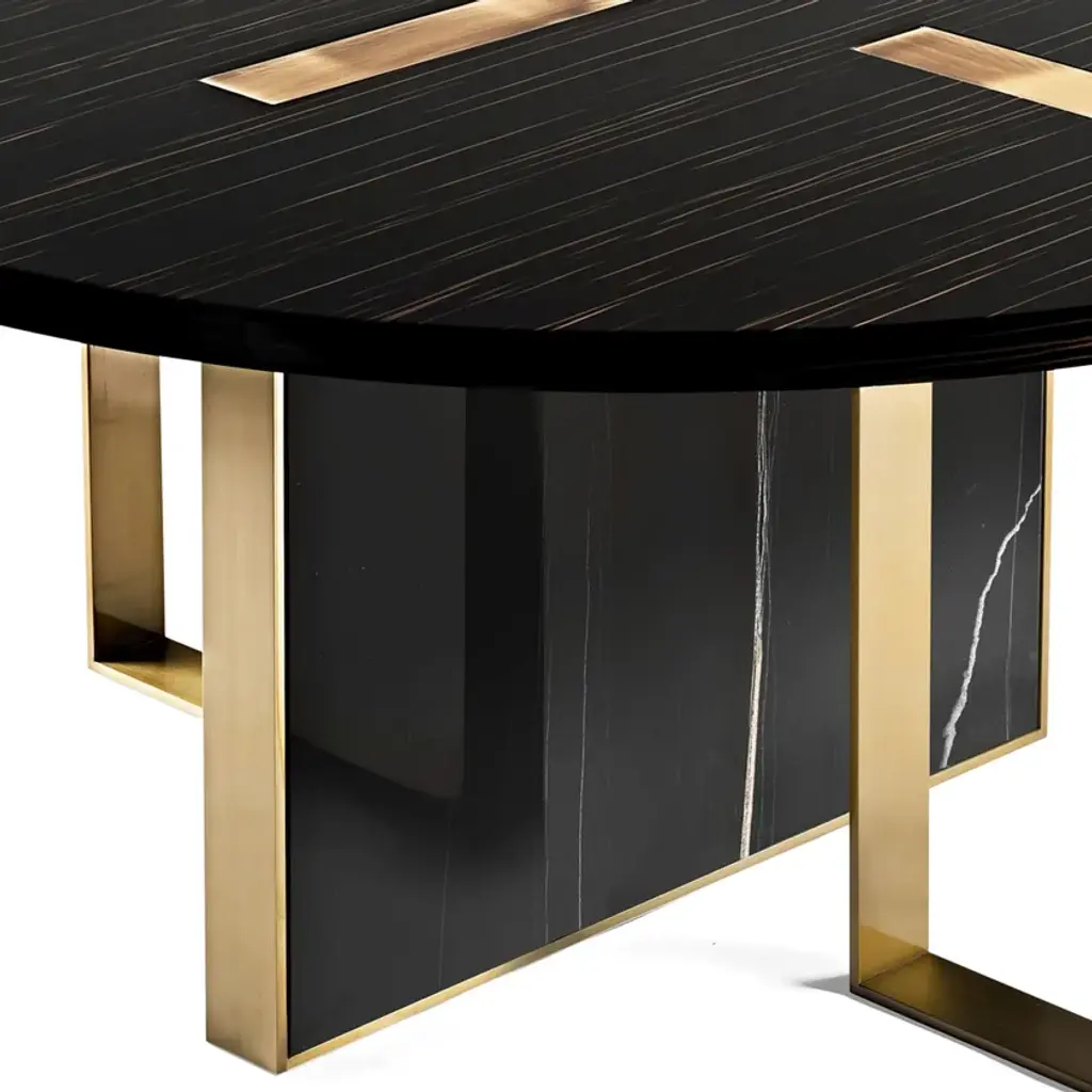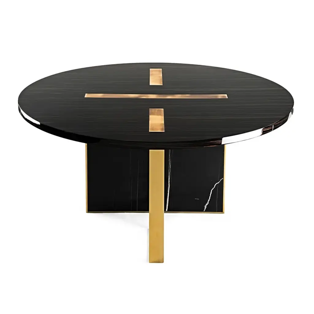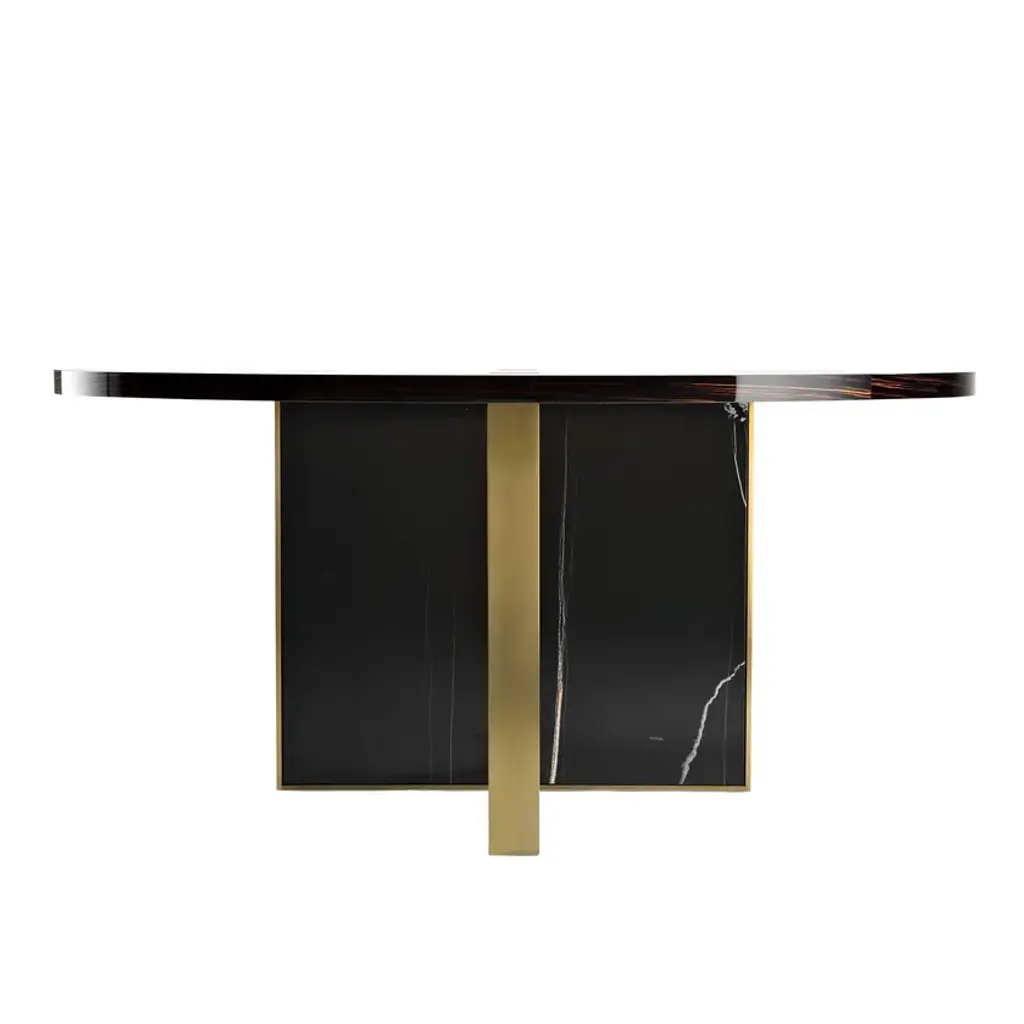 Tyron round dining table with lacquered wood top and brushed brass inserts. Lower supports in metal and marble. Also available in Ebony or Rosewood veneer.Tyron: elegant and exclusive dining, coffee and console tables with metal structure enriched with the inclusion of decorative marble slabs. The top can be lacquered or veneered in Ebony or Rosewood finishes.
