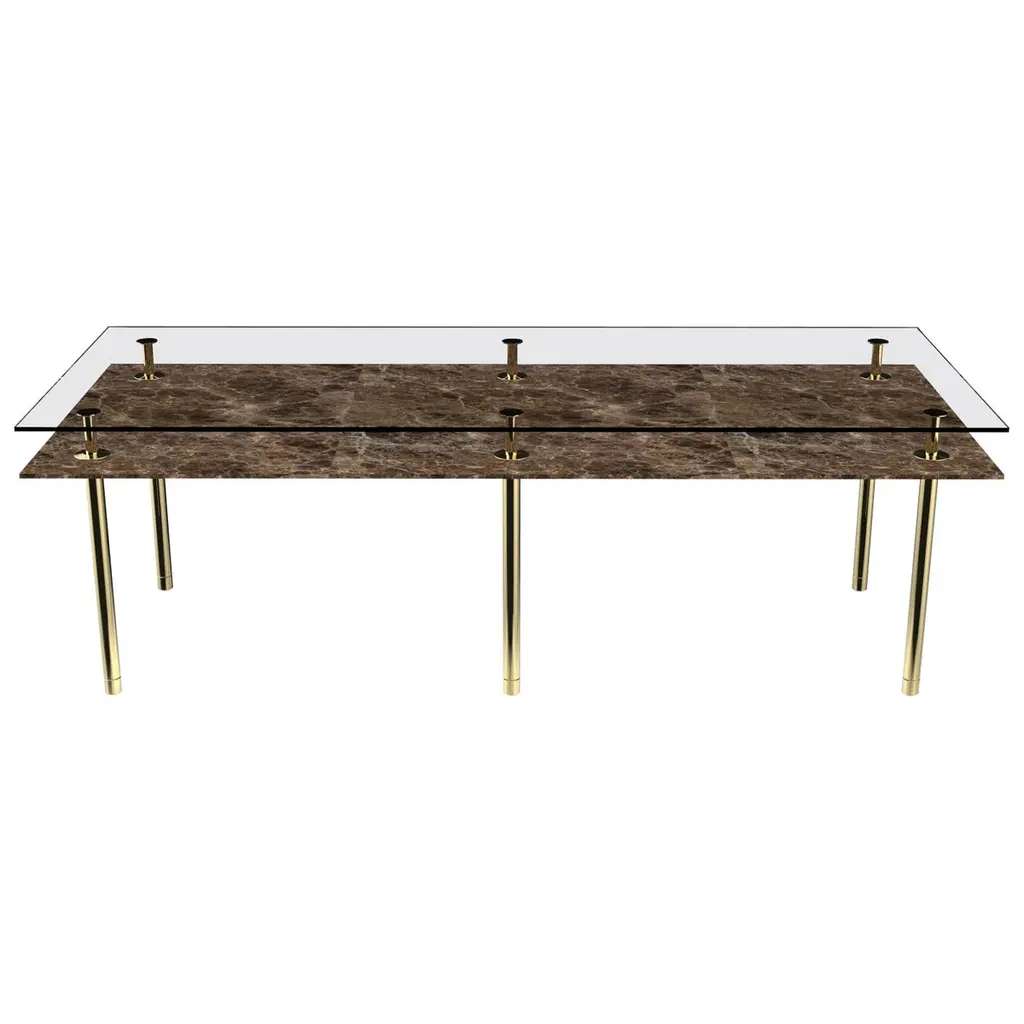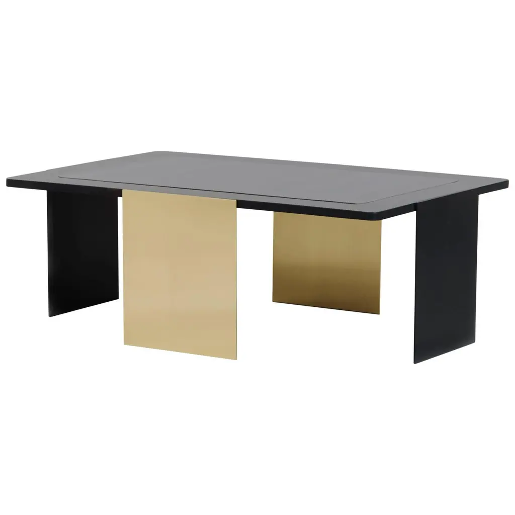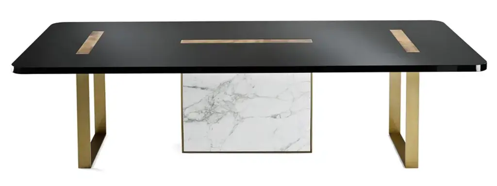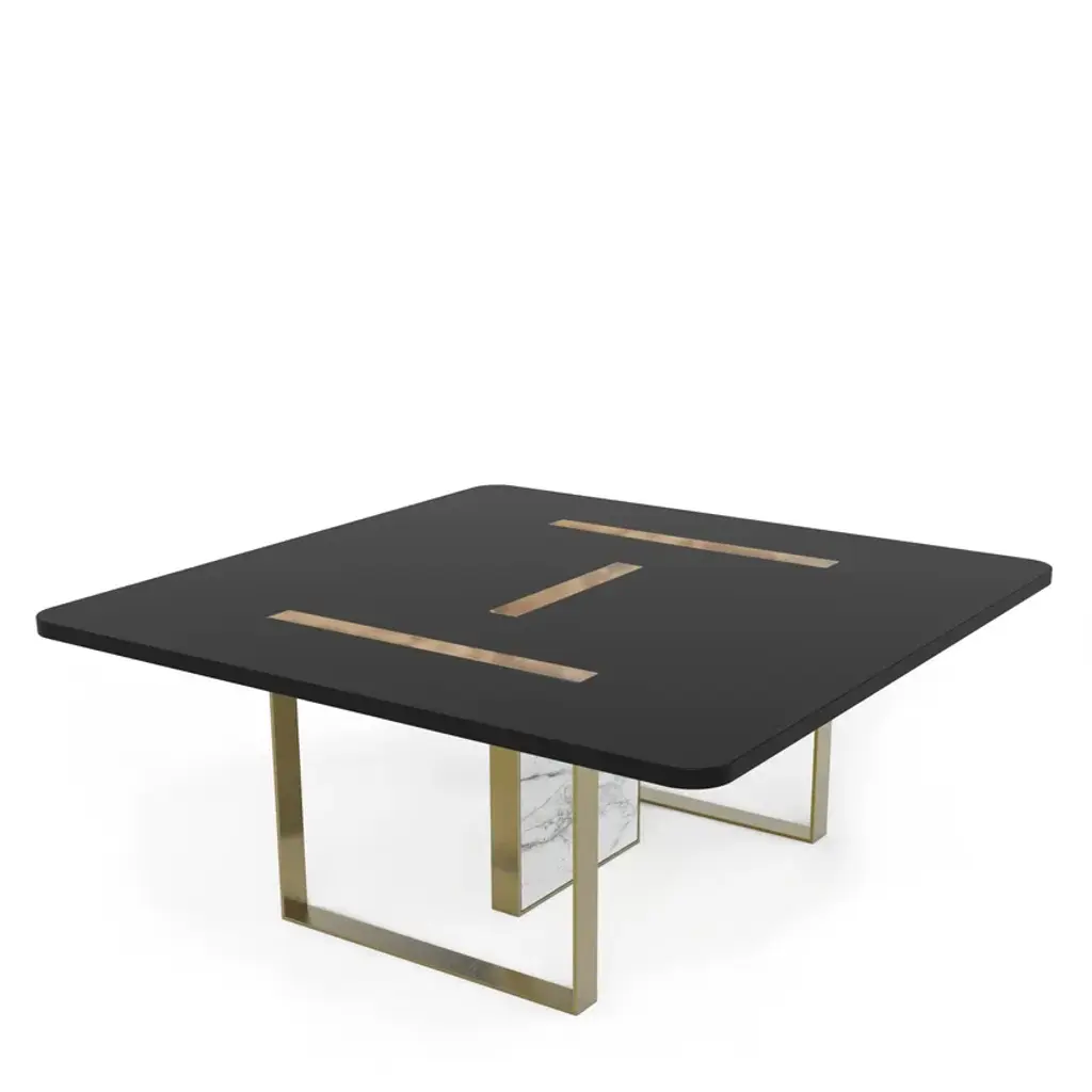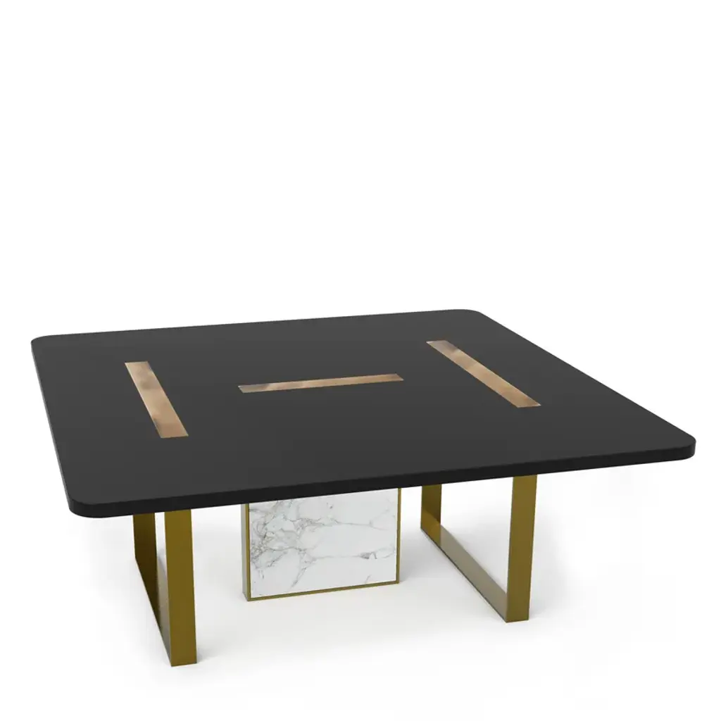 Tyron square dining table with lacquered wood top and brushed brass inserts. Part of the Notorious collection by MarioniTyron: elegant and exclusive dining, coffee and console tables with metal structure enriched with the inclusion of decorative marble slabs. The top can be lacquered or veneered in Ebony or Rosewood finishes.