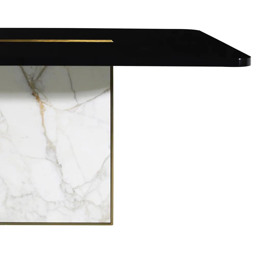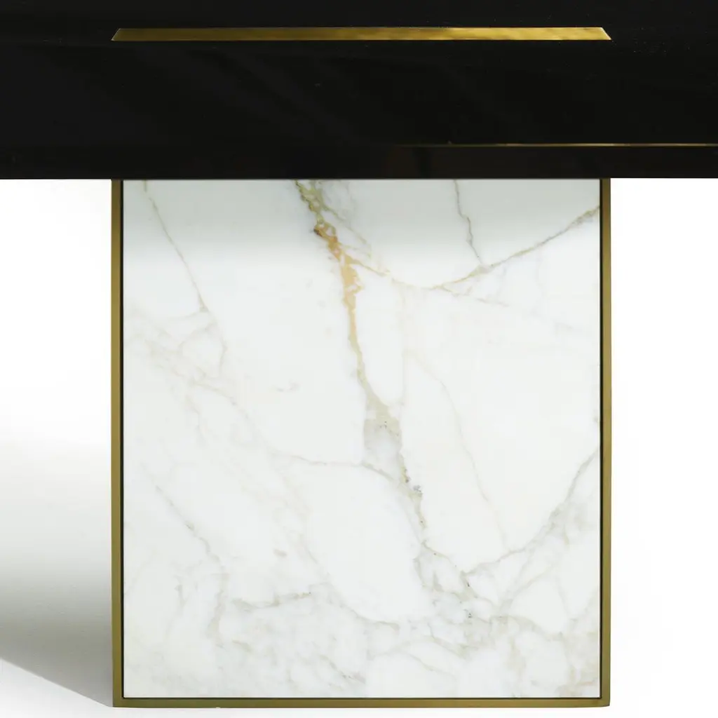 This elegant table, designed by Studio 63 for Marioni, has a lacquered rectangular wooden top with one rectangular brass insert and one rectangular marble and metal insert. These two elements extend downwards serving also as supports for the table. The top is also available in ebony finish and in rosewood. This luxurious materials and the expert craftsmanship used to put them together make this piece a true work or art that will make the perfect addition to any dining room.