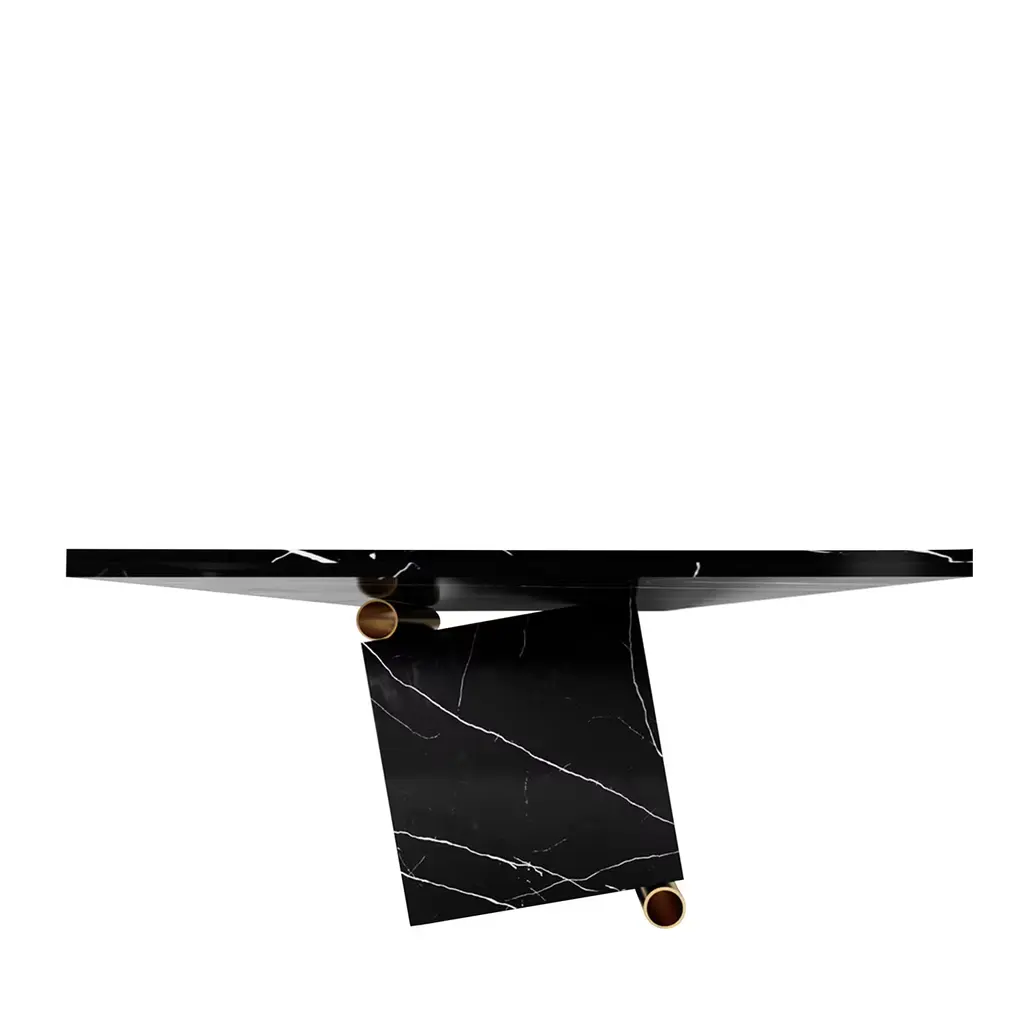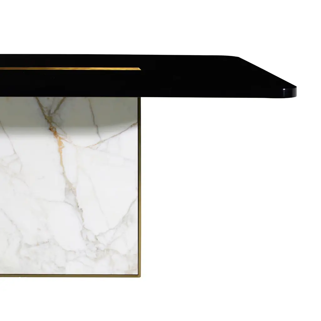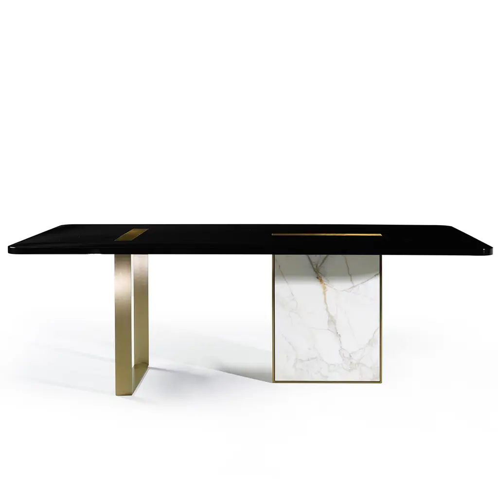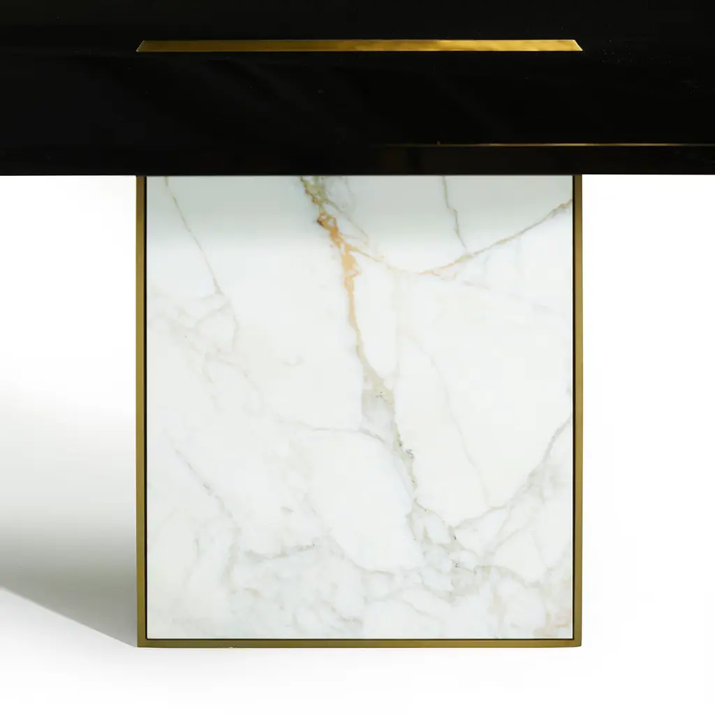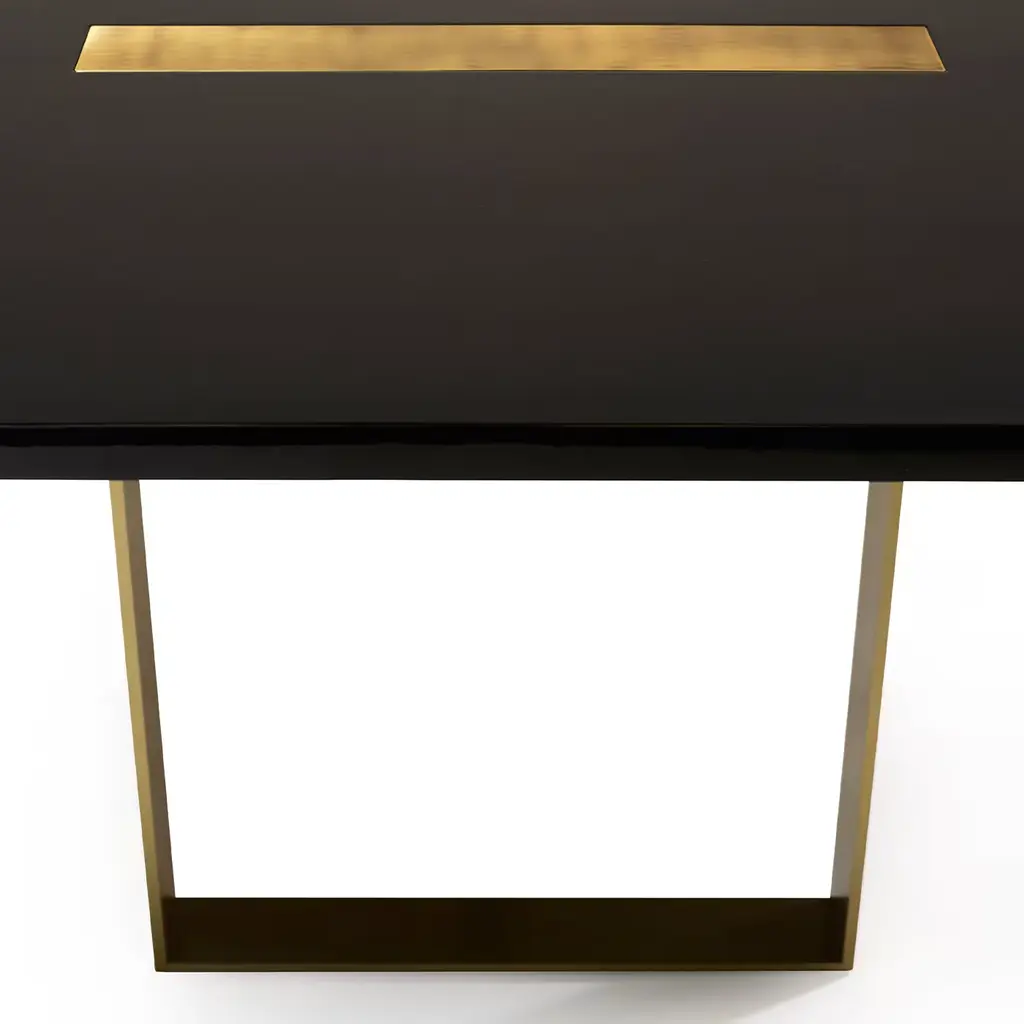 This elegant table, designed by Studio 63 for Marioni, has a lacquered rectangular wooden top with one rectangular brass insert and one rectangular marble and metal insert. These two elements extend downwards serving also as supports for the table. The top is also available in ebony finish and in rosewood. This luxurious materials and the expert craftsmanship used to put them together make this piece a true work or art that will make the perfect addition to any dining room.