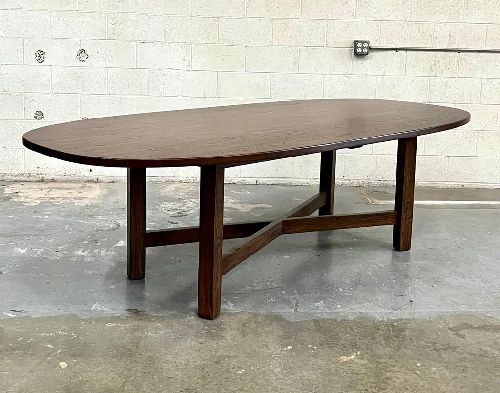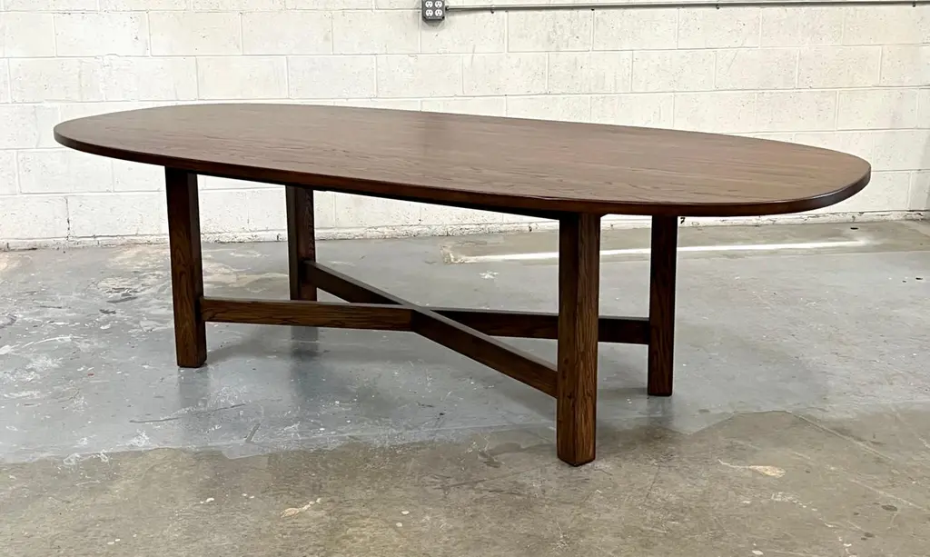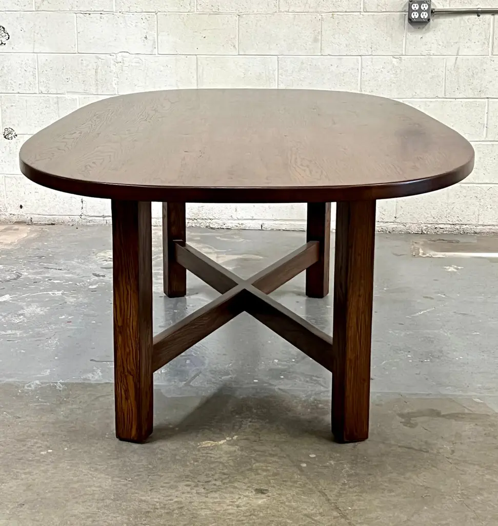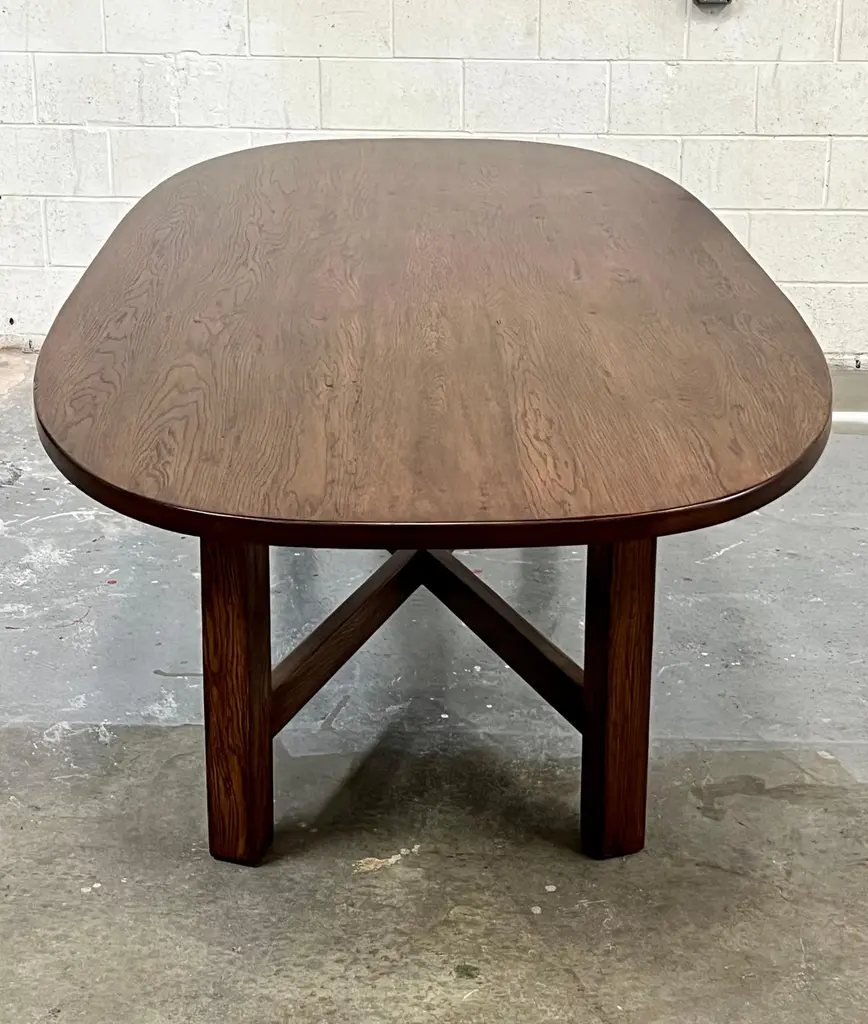 This custom X base oak dining table with a super ellipse top is seen here in 102" x 46", however it can be built in any size. Because each table is bench-made in our own Los Angeles workshop you can influence all aspects of design, including size, wood species and finish. We use only traditional carpentry techniques, no nails or metal fasteners of any kind, just mortise and tenon construction reinforced with hand-cut wooden dowels.