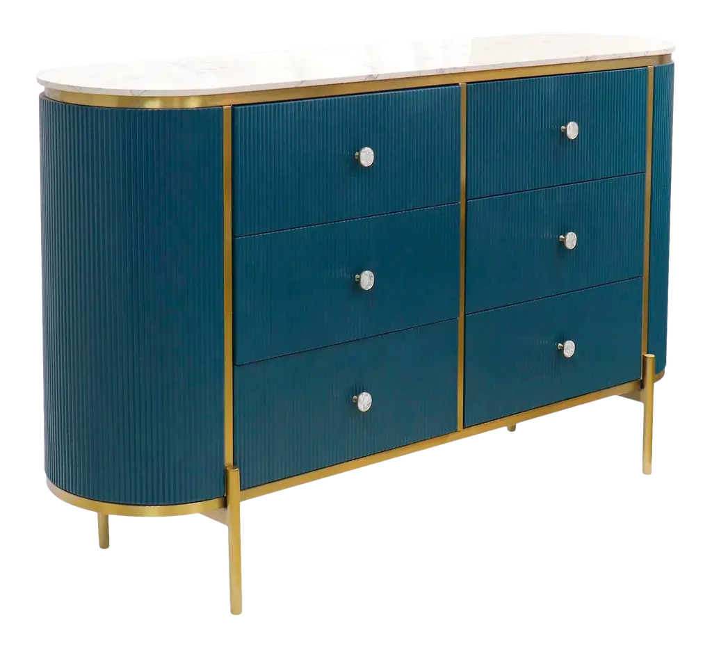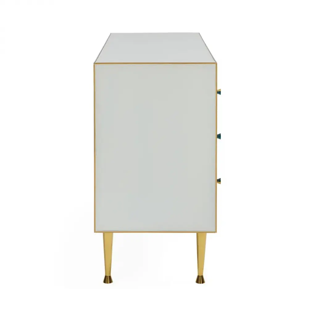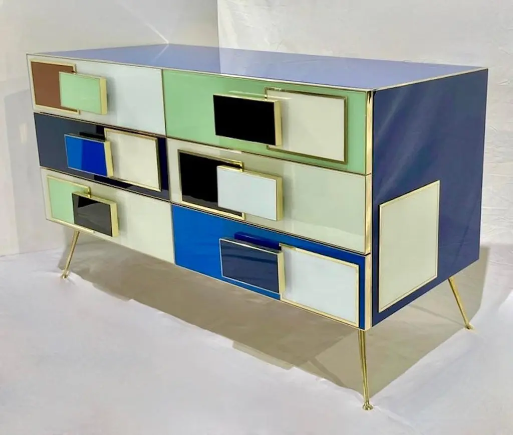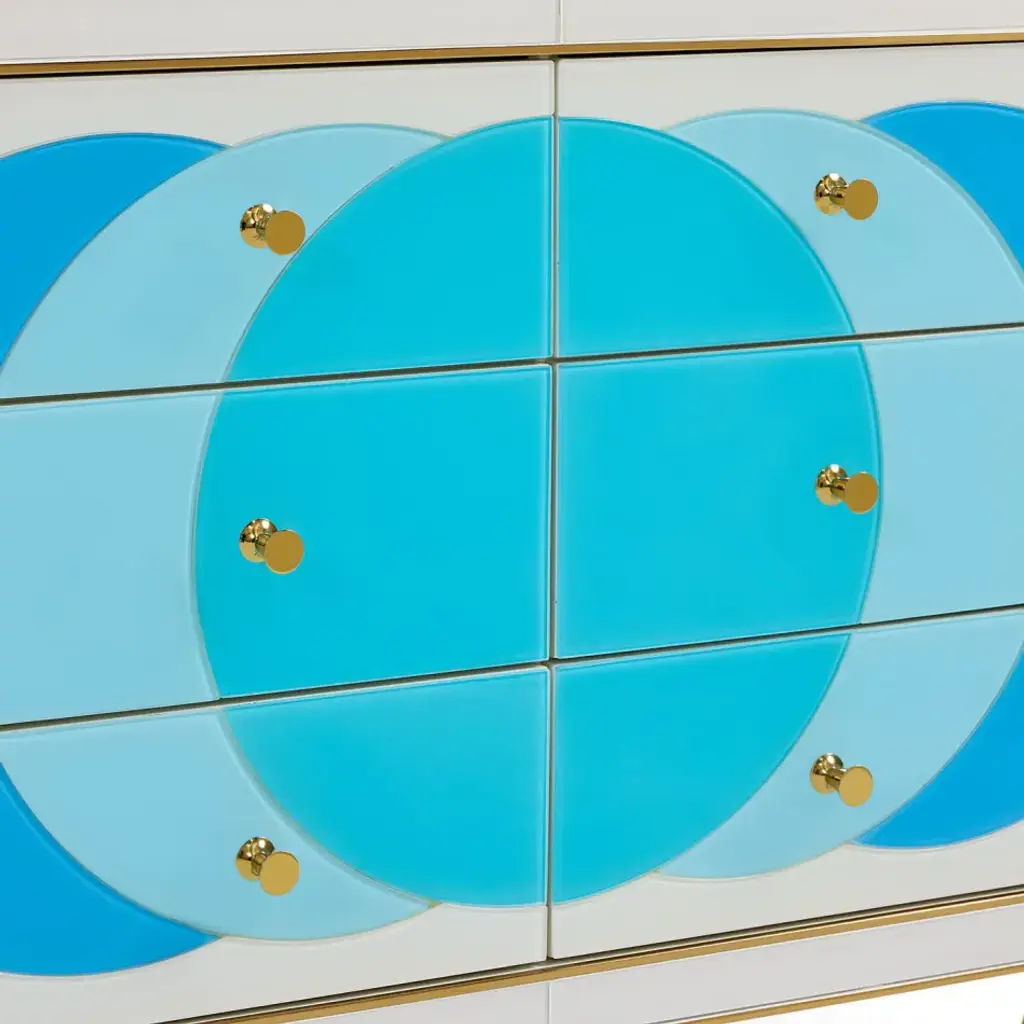 Mod Aquatic.Add a splash of oceanic color anywhere from your entryway to the boudoir with our Ultramarine Credenza’s mod dot pattern. Crafted from glass panes back painted in our refreshing, Mediterranean-inspired blues and gleaming polished brass edging. Six generously sized soft-close drawers are dotted with two brass pulls each. Hits all the right notes whether in the hall, behind the sofa, or duetting with your dining table.