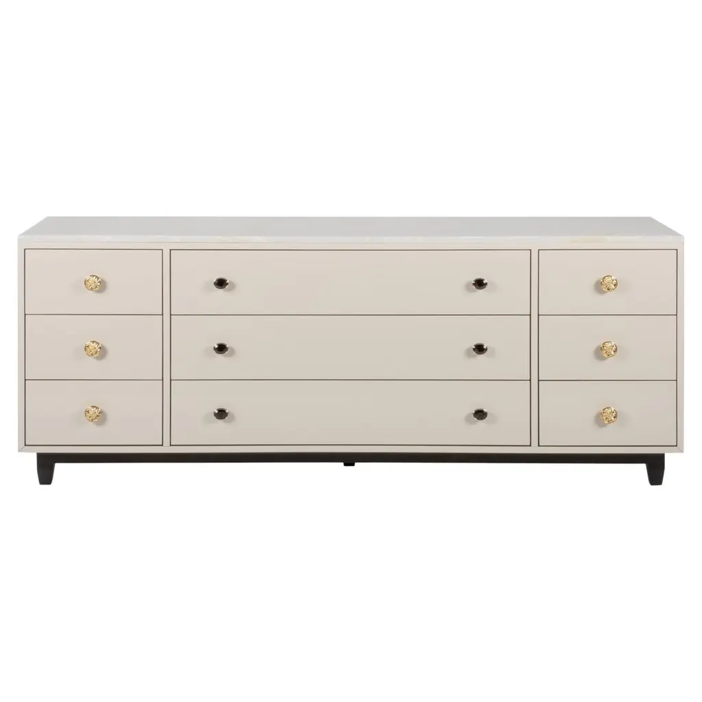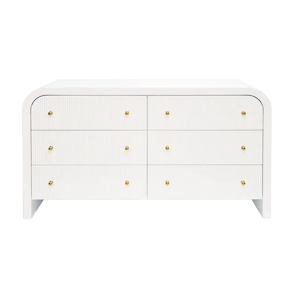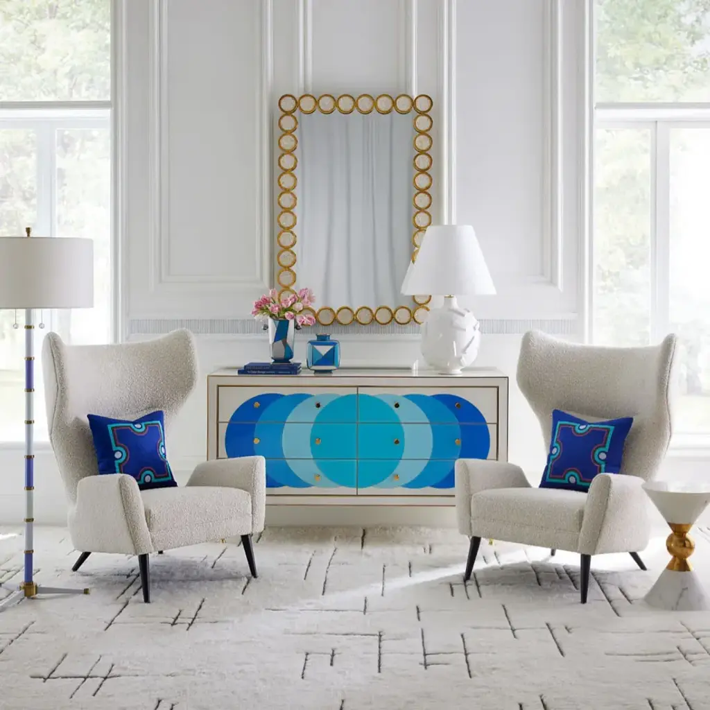 Mod Aquatic.Add a splash of oceanic color anywhere from your entryway to the boudoir with our Ultramarine Credenza’s mod dot pattern. Crafted from glass panes back painted in our refreshing, Mediterranean-inspired blues and gleaming polished brass edging. Six generously sized soft-close drawers are dotted with two brass pulls each. Hits all the right notes whether in the hall, behind the sofa, or duetting with your dining table.