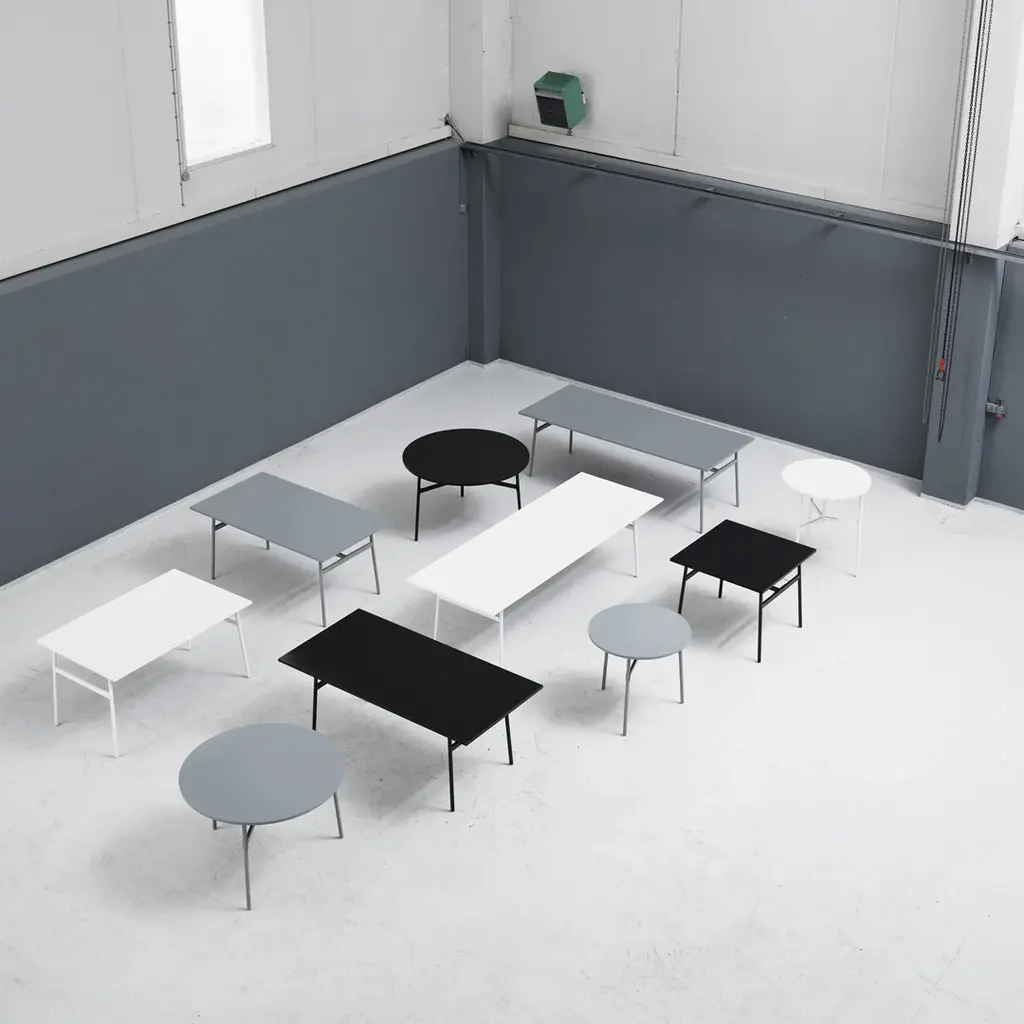A place for meals, work, studying, conversations and relaxation; a table is a base and gathering place for all sorts of activity, and the Union collection accommodates them all. An all-round collection of tables in a minimalist design, which gets an elegant lift from shiny brass feet. Union is a timeless table collection that can assume many forms of expression according to the interior that the tables are placed in. The Table Top and legs are kept in one cohesive color, only broken by the subtle brass details. The Table Top is made from premium anti-scratch, anti-fingerprint laminate and finished with ABS edging, while an airy steel design makes up the base. As a fine detail, the base is screwed together using over-sized brass screws. The series presents both round and rectangular models with varying heights and sizes. With everything from dining tables to tall cafe tables, the collection offers a broad range of furnishing options for both private and public spaces.
