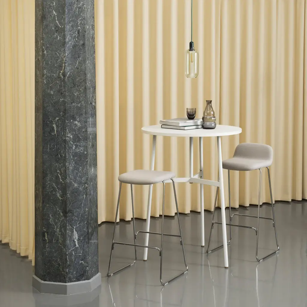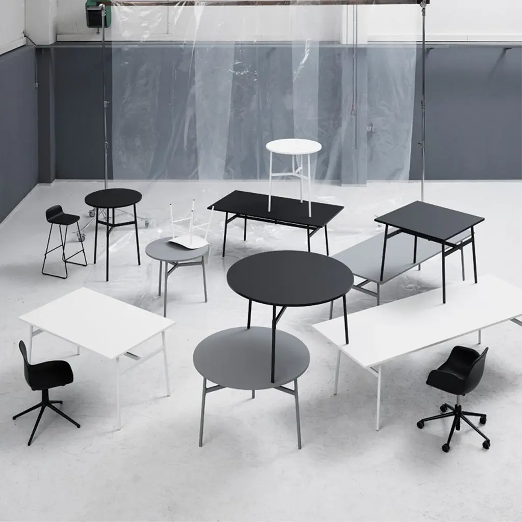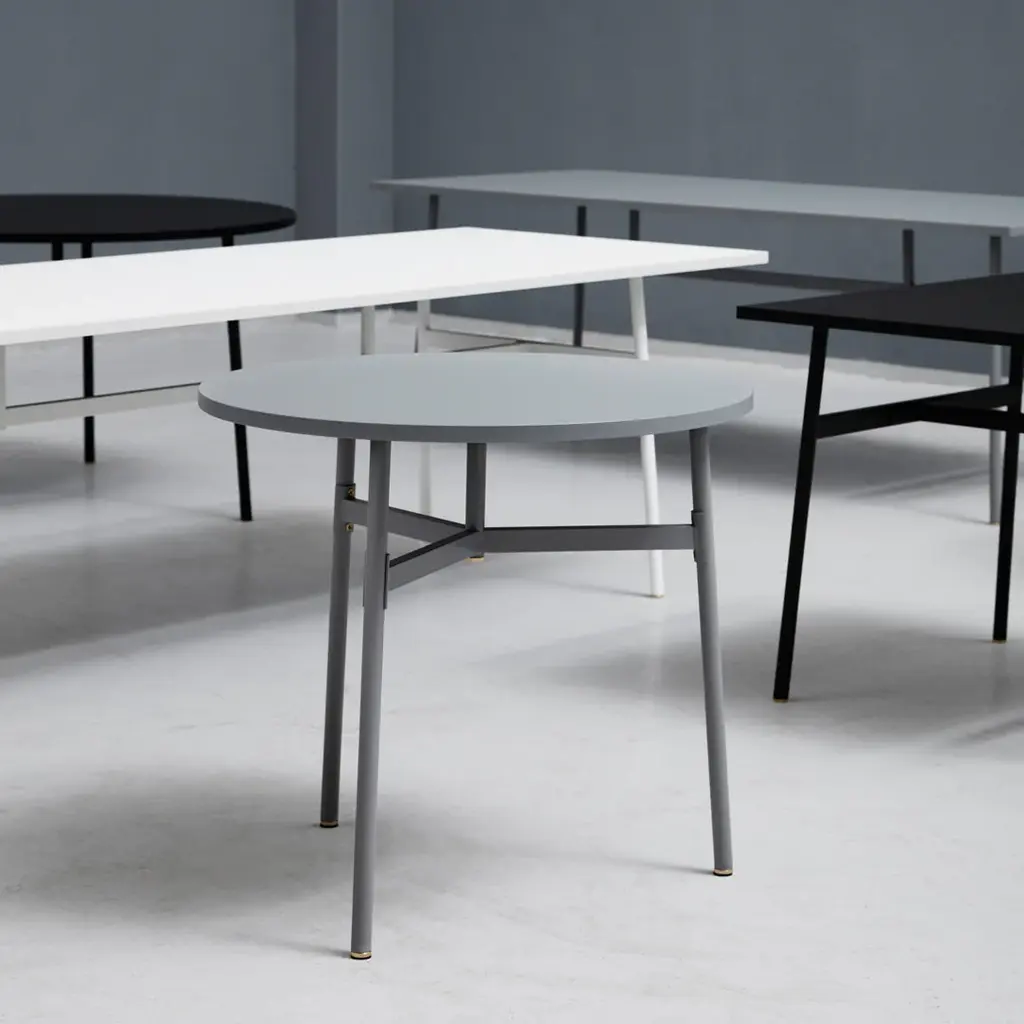 A place for meals, work, studying, conversations and relaxation; a table is a base and gathering place for all sorts of activity, and the Union collection accommodates them all. An all-round collection of tables in a minimalist design, which gets an elegant lift from shiny brass feet. Union is a timeless table collection that can assume many forms of expression according to the interior that the tables are placed in. The Table Top and legs are kept in one cohesive color, only broken by the subtle brass details. The Table Top is made from premium anti-scratch, anti-fingerprint laminate and finished with ABS edging, while an airy steel design makes up the base. As a fine detail, the base is screwed together using over-sized brass screws. The series presents both round and rectangular models with varying heights and sizes. With everything from dining tables to tall cafe tables, the collection offers a broad range of furnishing options for both private and public spaces.