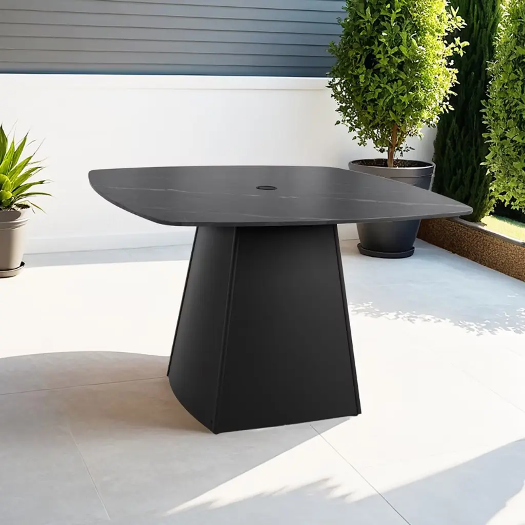 Outdoor Modern Patio Squircle 44"x44" Dining Table,White Marble-Inspired Sintered StoneTop Elevate your outdoor dining with this 44"x44" Modern Rounded Square Table, designed to seat four comfortably. The Greek Marble-inspired sintered stone tabletop features seamless nature veining, offering a sleek, durable surface that resists scratches and weather damage. A rust-free aluminum flared pyramid pedestal base ensures stability, while its Ember Black finish enhances durability. With smooth edges, safety-rounded corners, and a 2" umbrella hole, this table blends elegance and functionality for patio, poolside, and terrace setting.