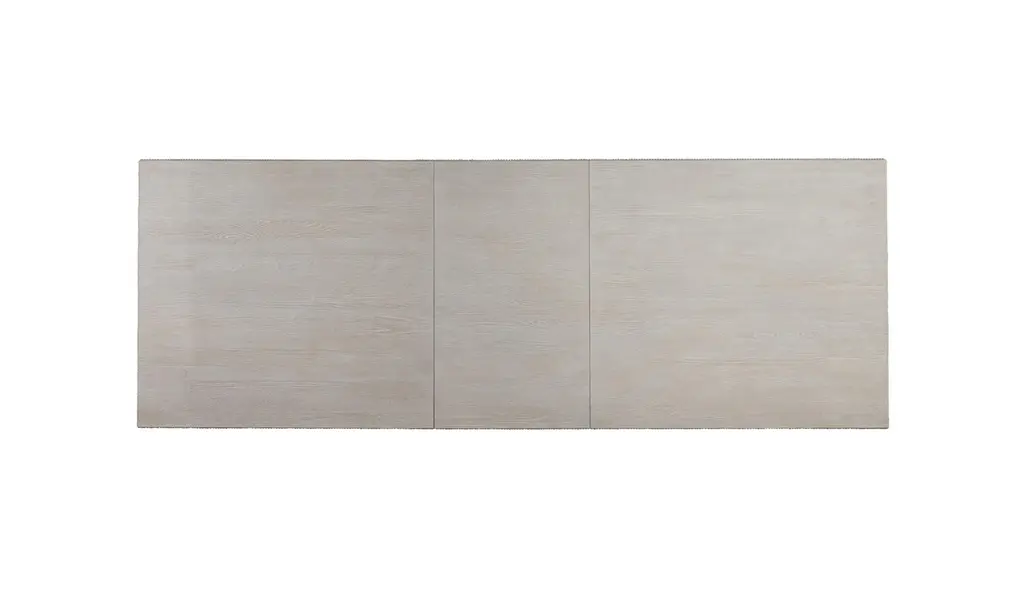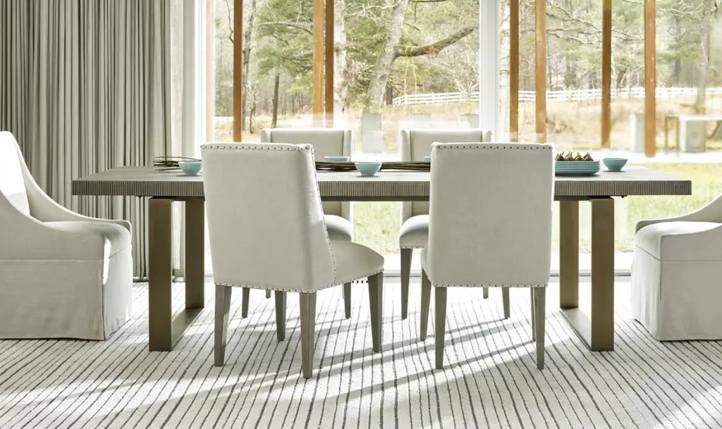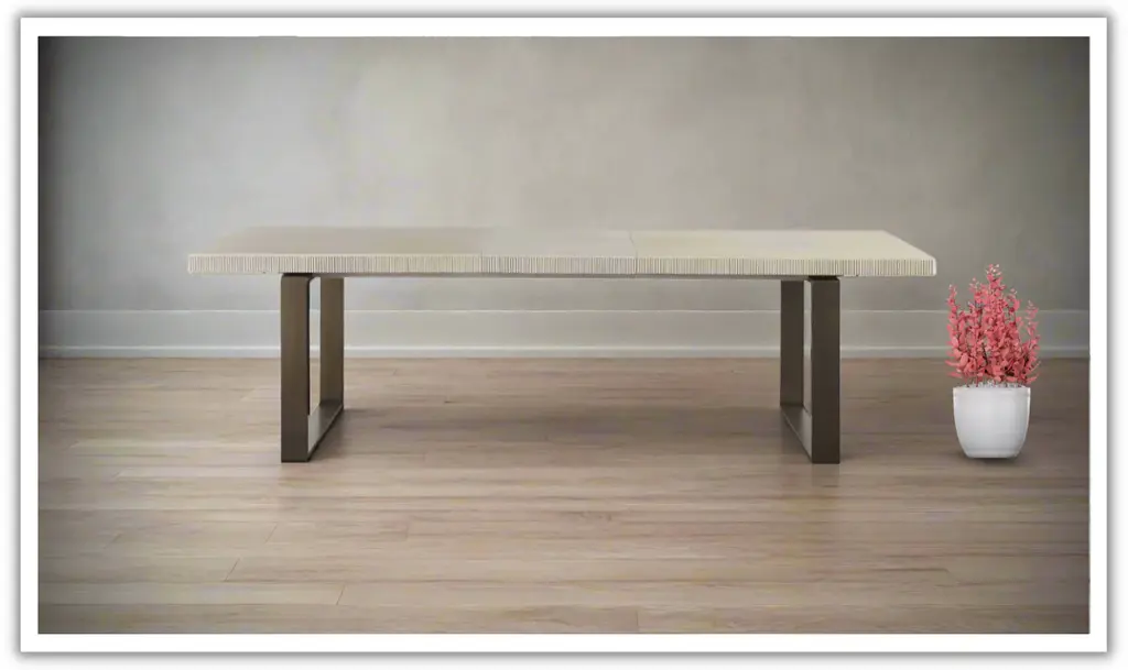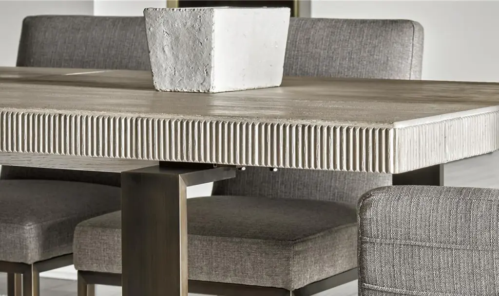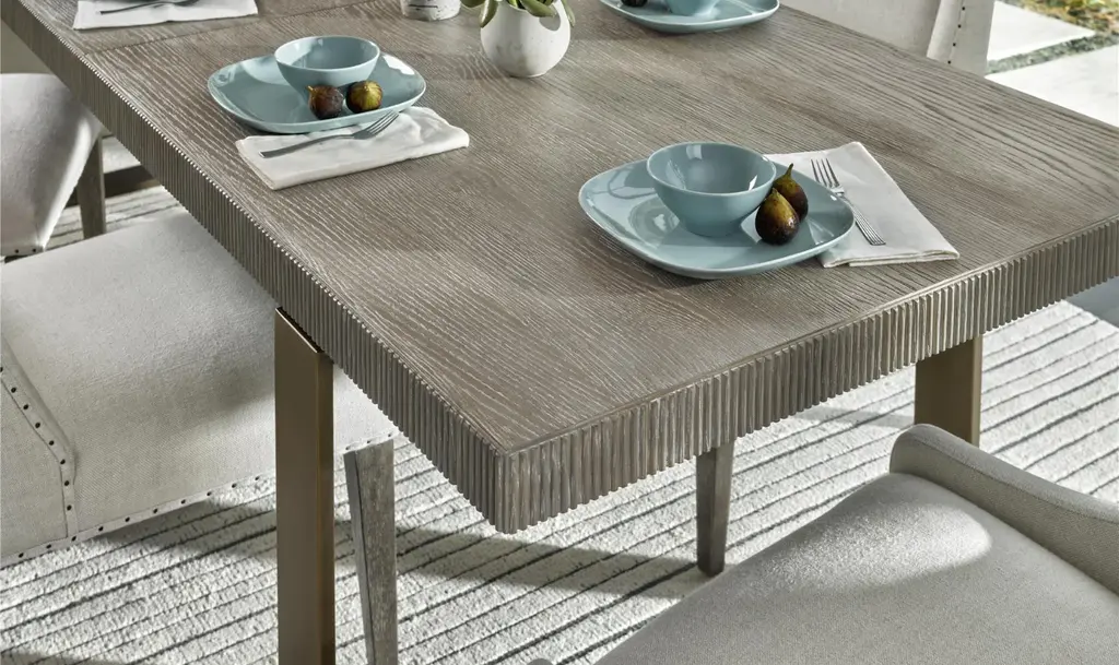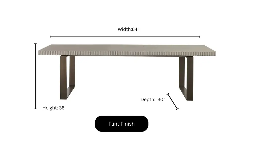 The Universal Robards Rectangular Dining Table is a striking centerpiece that seamlessly combines modern sophistication with timeless design. This stunning table features a delicately ridged, matte-finished wood top, available in two elegant finishes—Quartz, for a soft and refined look, or Flint, for a deeper, richer tone. The sleek surface is beautifully contrasted by a lustrous bronze-finished base, creating a bold juxtaposition of textures that exude luxury and style. Designed with both form and function in mind, the table measures 84 inches in length, 38 inches in width, and 30 inches in height, offering ample space for everyday dining or hosting formal gatherings. For larger occasions, the inclusion of a 22-inch leaf extends the table to an impressive 106 inches, providing generous seating capacity without compromising its aesthetic appeal. Constructed with durable wood and metal, the table is built to last, ensuring stability and longevity. Whether used in contemporary or transitional dining spaces, the Robards Rectangular Dining Table serves as a statement piece that elevates any room while offering practicality and versatility. With its thoughtful design, premium materials, and elegant finishes, this table is the perfect blend of beauty and functionality, making it a must-have for those who value style and substance in their home furnishings.