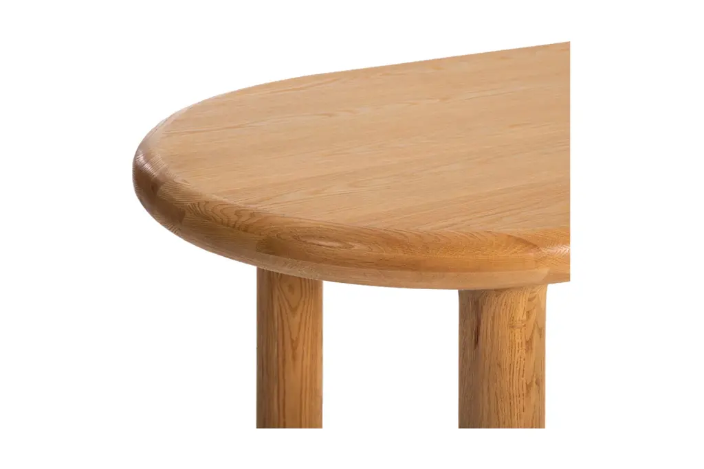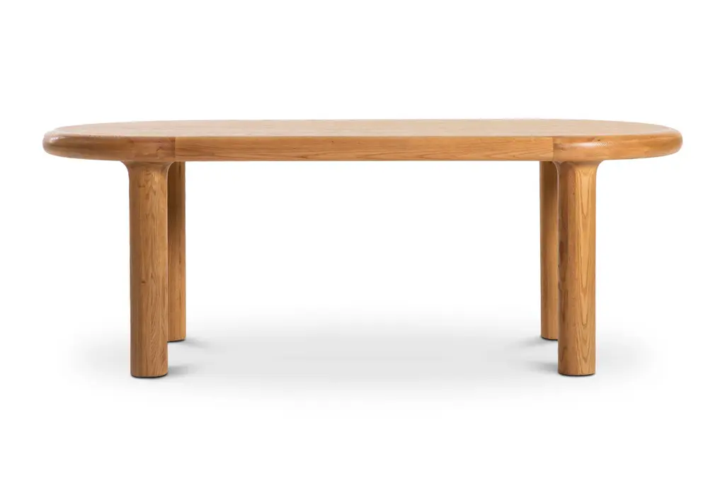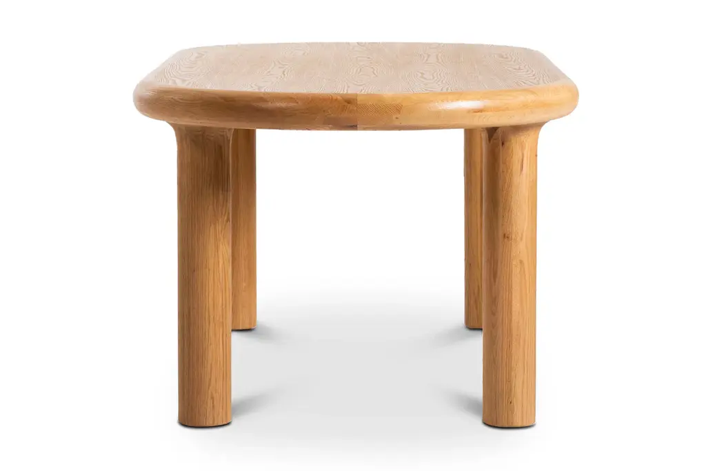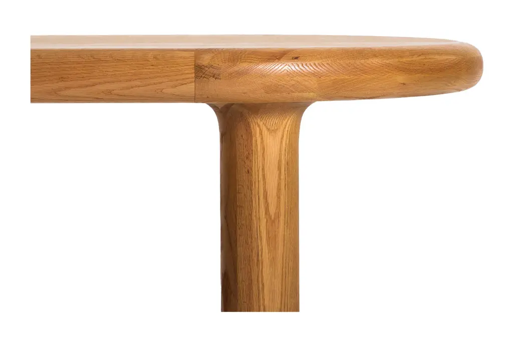 The Upton Dining Table unites form and function with solid oak construction and attention to detail. The unique racetrack-shaped top features soft, rounded edges and sits atop four similarly rounded pillar legs, giving it a sculptural silhouette. Naturally finished oak allows the grain of the wood to stand out, accentuating the simple beauty of the table.