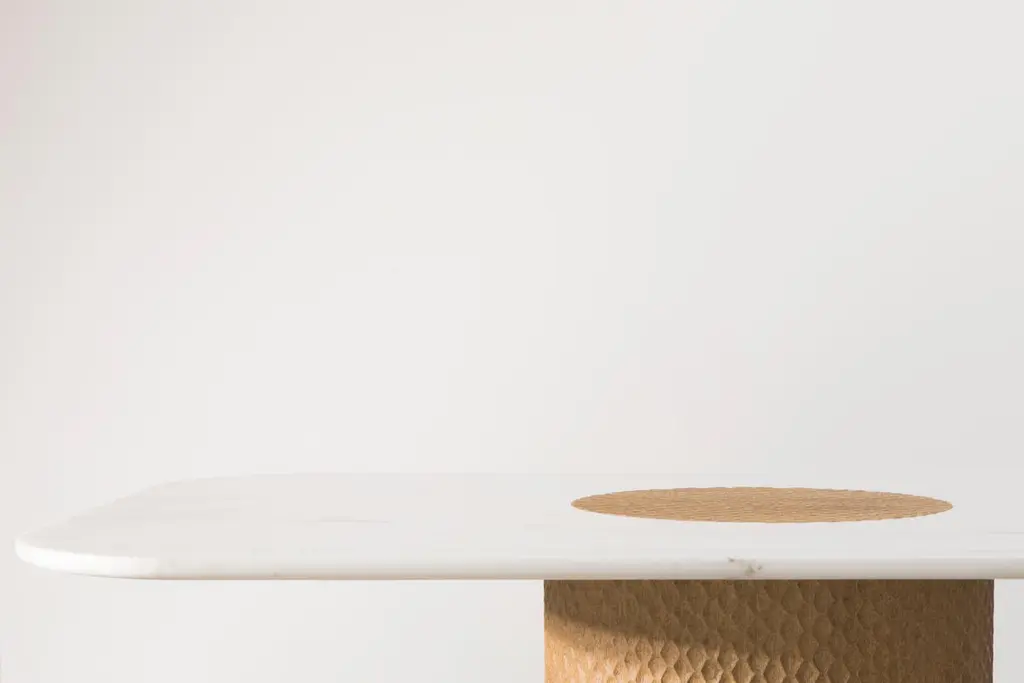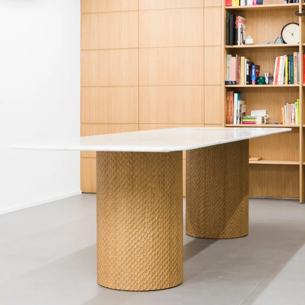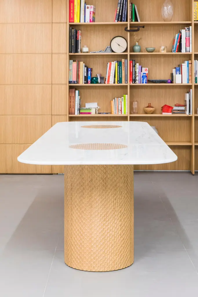 Uroko dining table by Thomas Trad2022Dimensions: L 298 x W 90 x H 74 cmMaterials: Hand carved oak, aspen white topHand carved dining table.Thomas Trad is a product designer from Beirut. An alumnus of London's prestigious Central Saint Martins, he worked with world renowned studios Fredrikson Stallard and Michael Anastassiades before returning to Beirut in 2016 to launch his own Design Studio.His design aesthetics comes from a fascination of manufacturing processes, craftmanship and the beauty of materials.