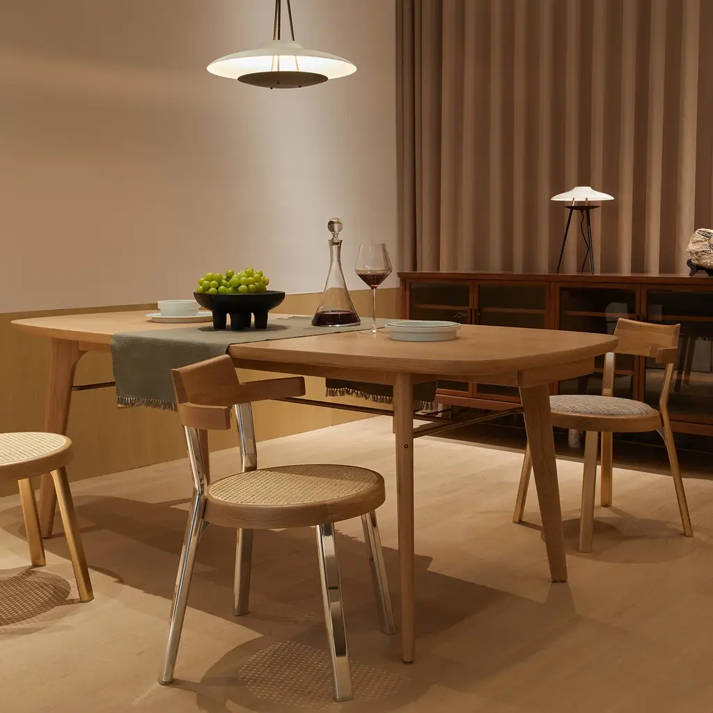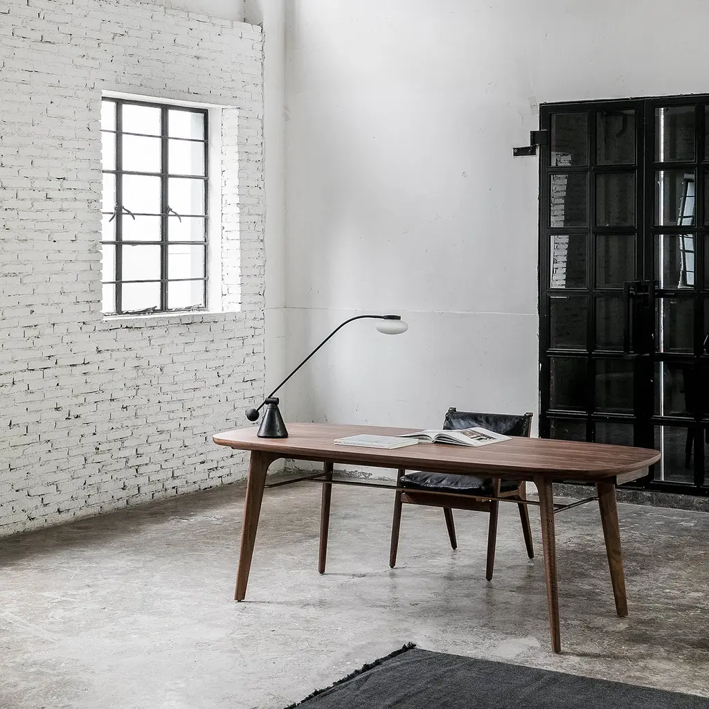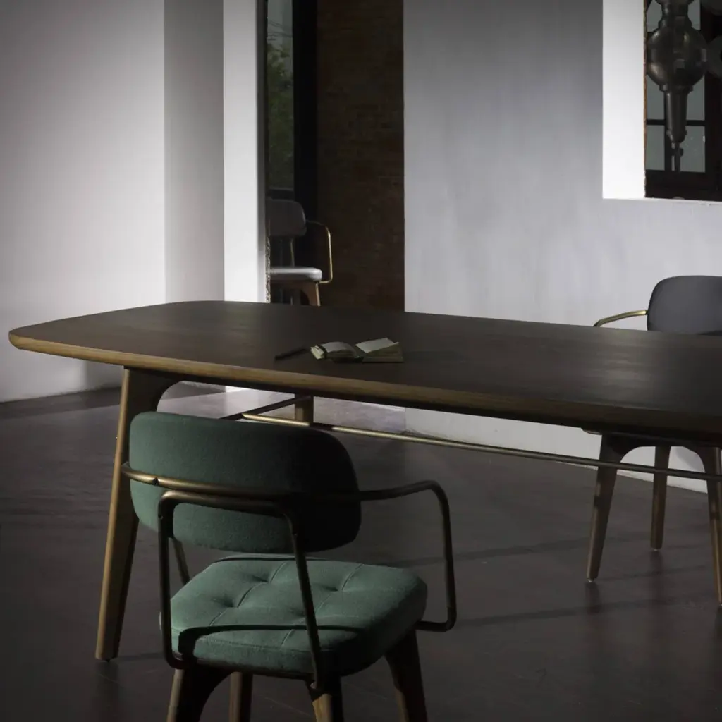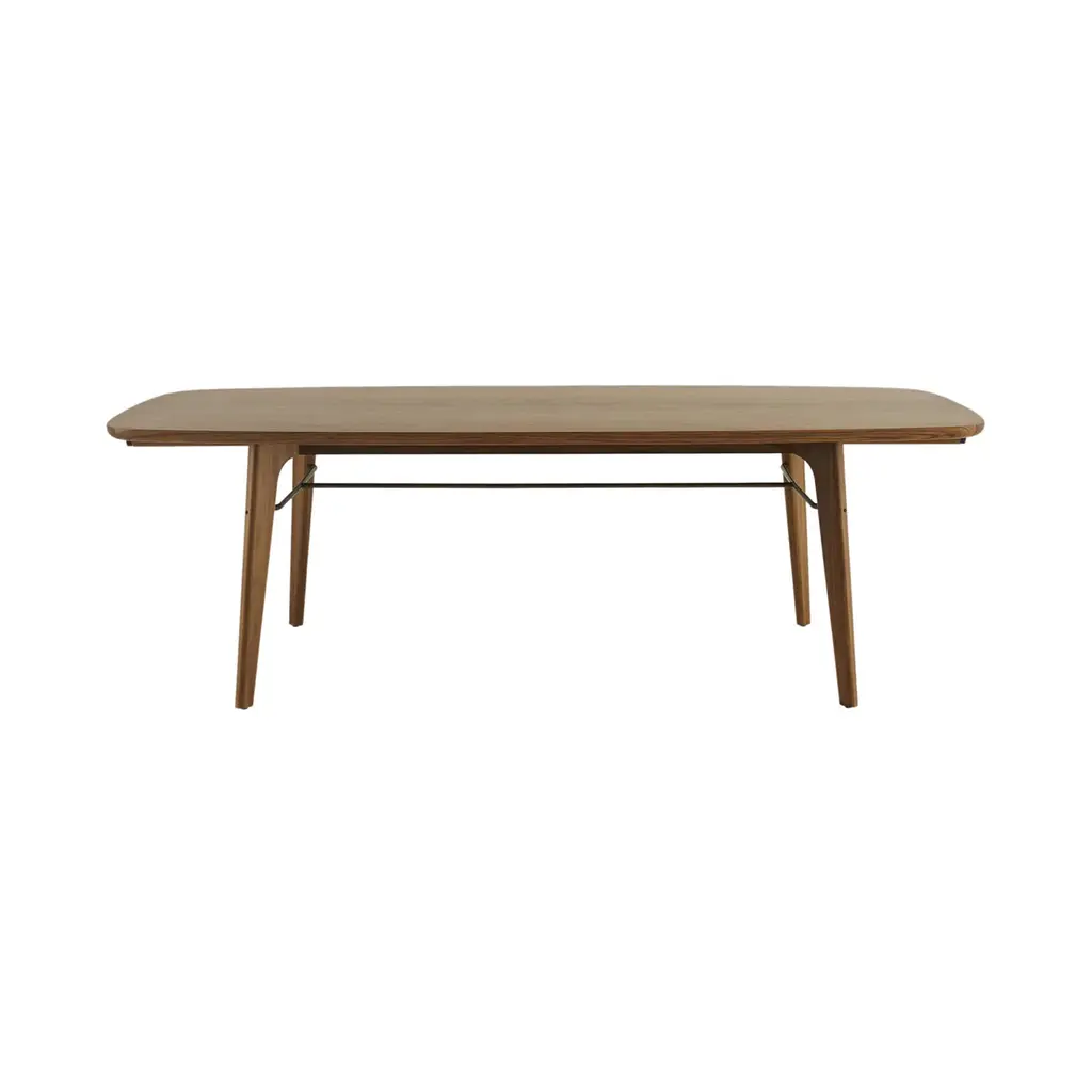 Less is certainly more in considering the virtues of Utility Dining Table from Stellar Works. A gracefully rounded and impressively proportioned oblong surface rests dramatically on solid wood legs conjoined by a brass-finish truss. A veneer laminate tabletop adds a final fillip to this thoughtfully conceived furnishing executed with unerring craftsmanship.