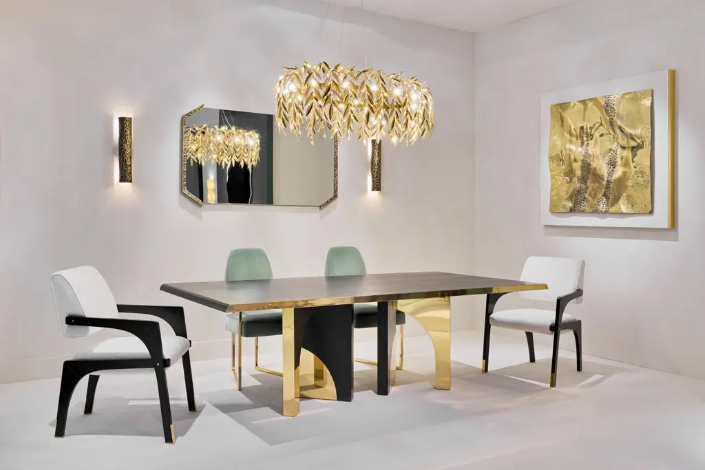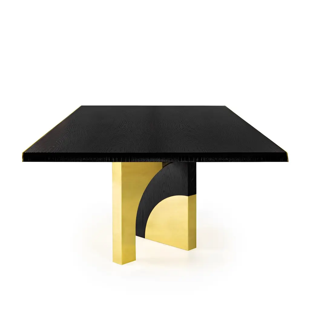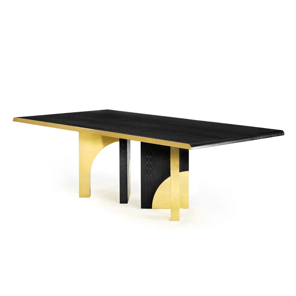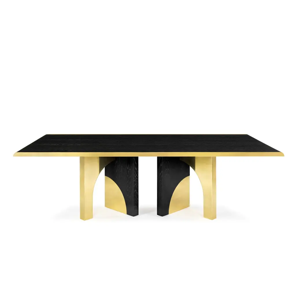 The Utopia dining table is designed in the likeness of the architectural scale that suggests a crossing through the structures of a utopian city, organized by the principles of symmetry and ideal forms.The imposing design combines dark oak and polished brass. As a futuristic project, two brass blades stylize the dark top, curving it with an avant-garde detail. In its base lies a passageway between four apparently identical arches, in which two of them stand impassable as symbols of discontent and visual imperfection. The Utopia dining table is an architectural design that challenges the borders between these two disciplines and combines high quality finishes that stand out in the most extraordinary high end projects.Product detailsDark oak with open grain and polished brass.Product optionsOther woods and finishes under request.Polished, brushed, oxidized brushed or aged brushed brass/copper/steel.Weight 170Kg 374,8 lbsMade to order. Custom sizes and other finishes are available under request.Designed by Joana Santos Barbosa for InsidherLand, 2019. Handmade in Portugal.