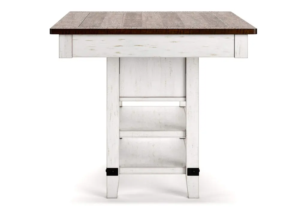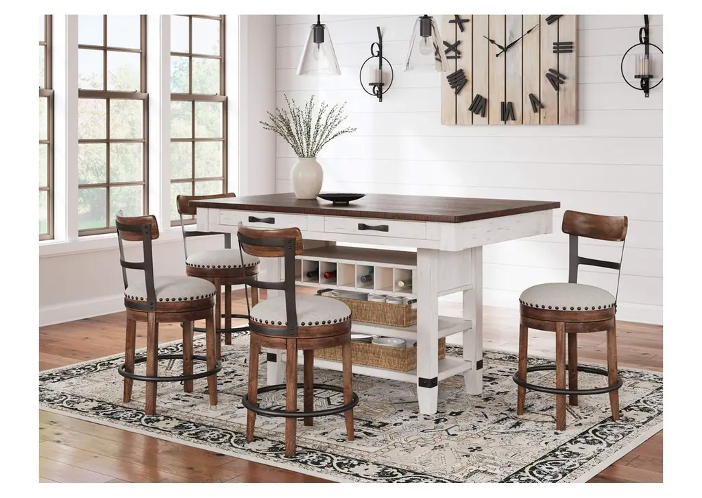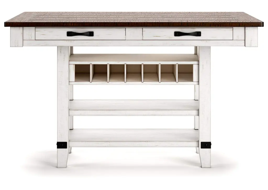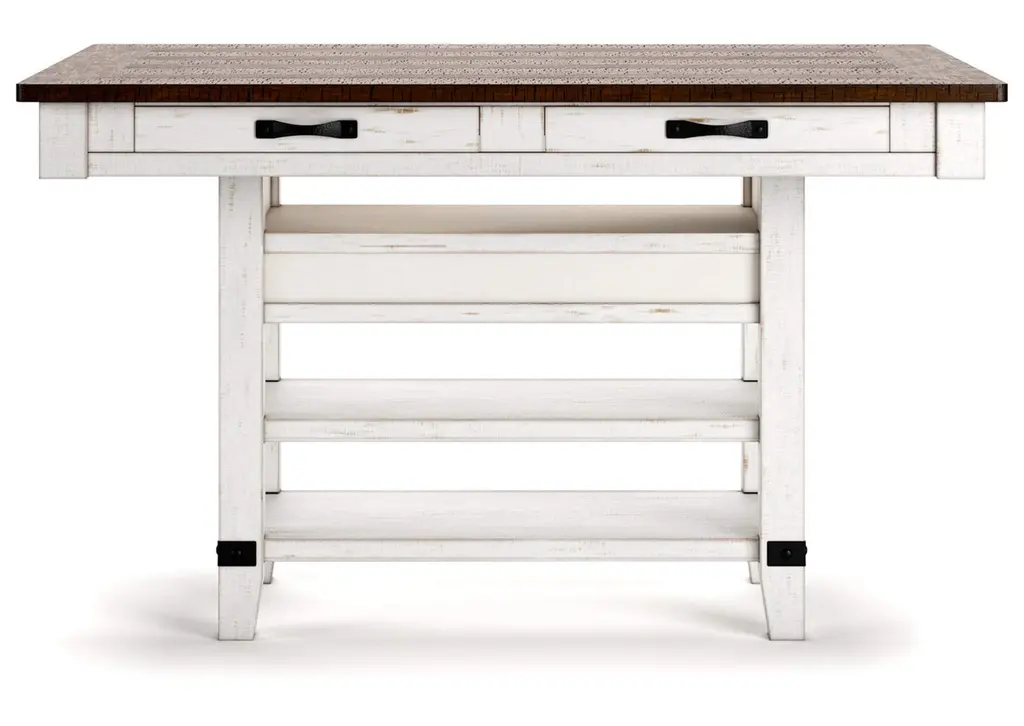 A high-style choice for dining spaces, the Valebeck counter height dining table serves up the best in rustic farmhouse living. Its two-tone finish pairs a brown tabletop with a distressed vintage white base for a double helping of charm. The table features four storage drawers (two on each side), a seven-bottle wine rack and two open shelves for display. The sturdy post and bracket base design, with black metal accents and a thick dining top, lends an earthy appeal. Weight 203.000 lbs. (91.35kgs.)