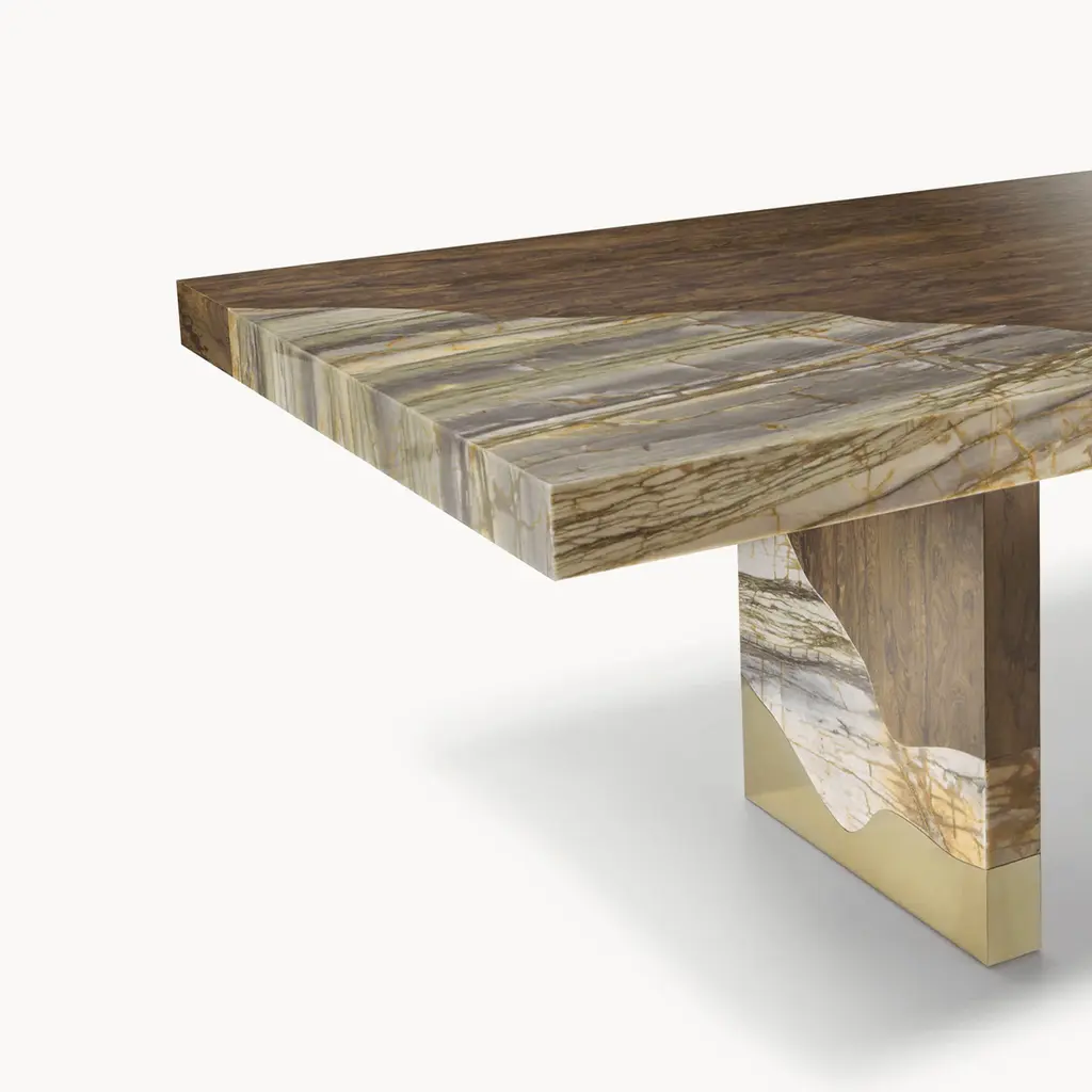 The Valiant dining table features a thick multilayer wood and veneer top with irregular marble corners. The two legs are crafted from multilayer wood and boxed marble with an irregular profile, complemented by a steel-covered base. A crossbar under the top ensures structural stiffness. The wooden parts are available in the veneer selection with a matte finish, while the metal parts are finished in glossy gold.