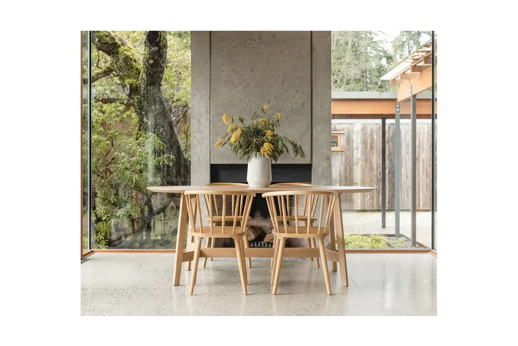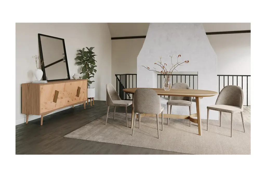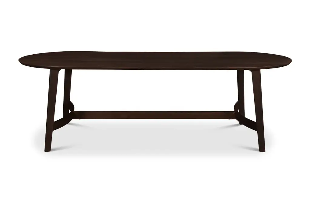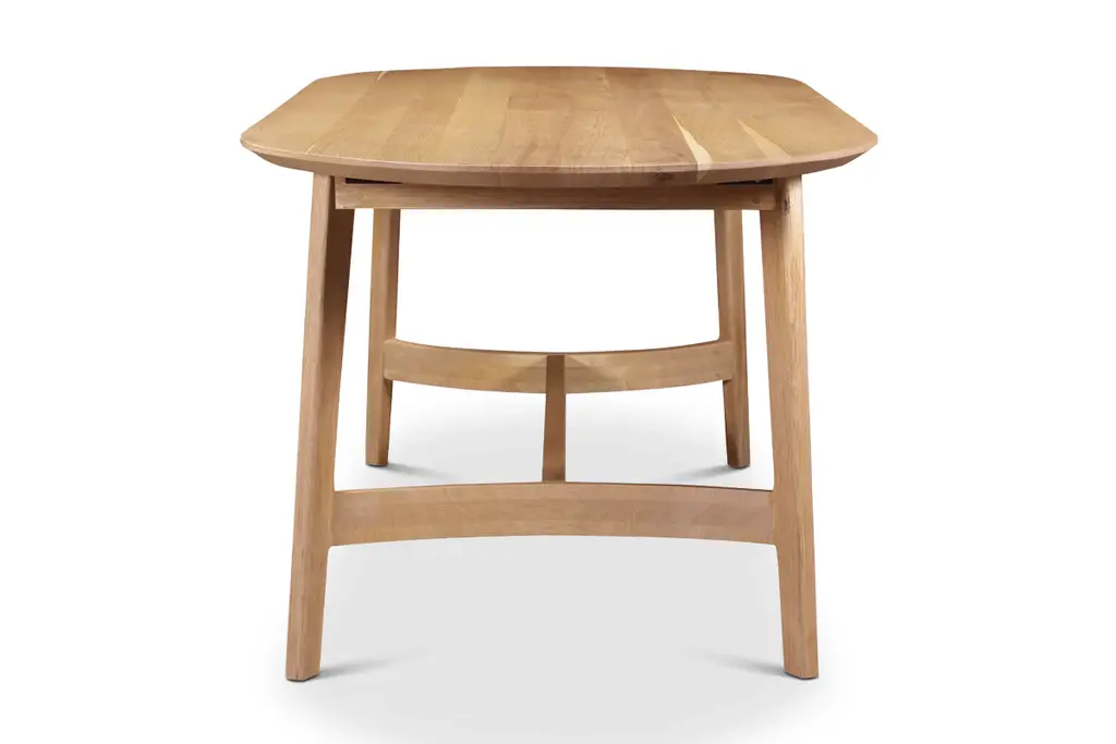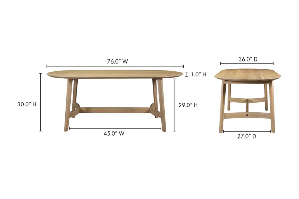 There is no shortage of charm in the Vance Small Dining Table. Every detail is thoughtfully added, from its unique racetrack-shaped top to the curved ends to the trestle-style base with a long stretcher. Finished in a deep, versatile brown or natural, it complements most design styles. The table boasts solid oak construction for maximum durability and can comfortably seat up to eight people, making it a perfect choice for those who love to host. The smaller of two sizes available.