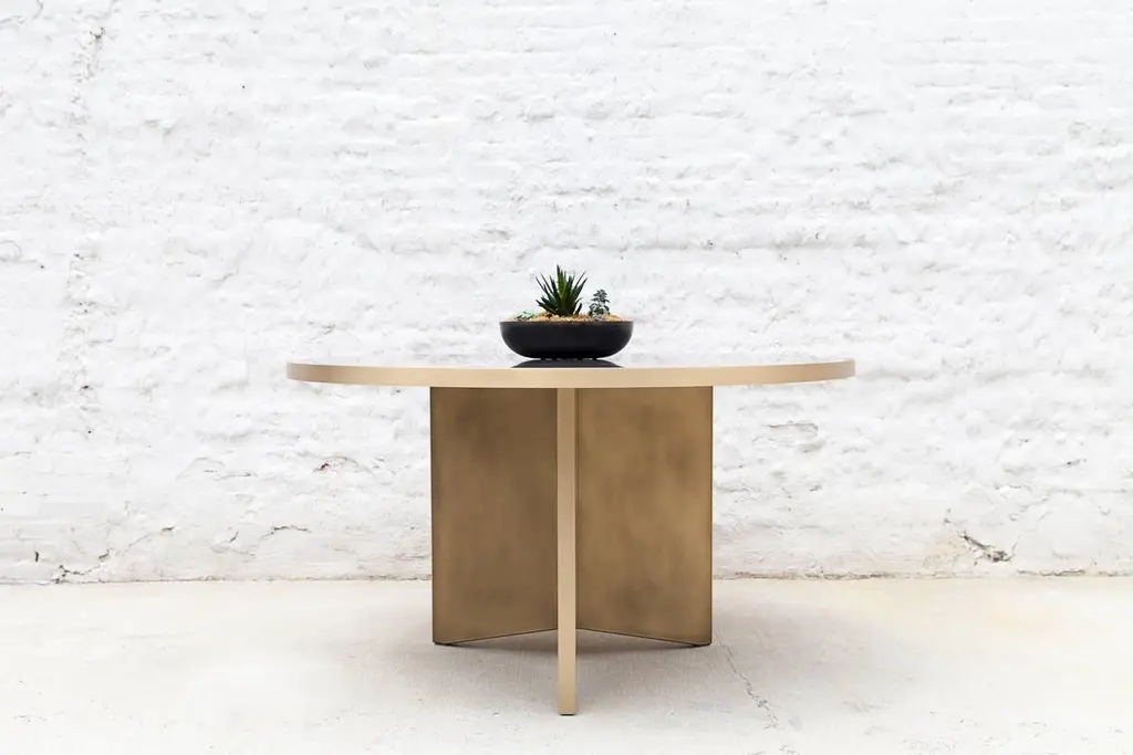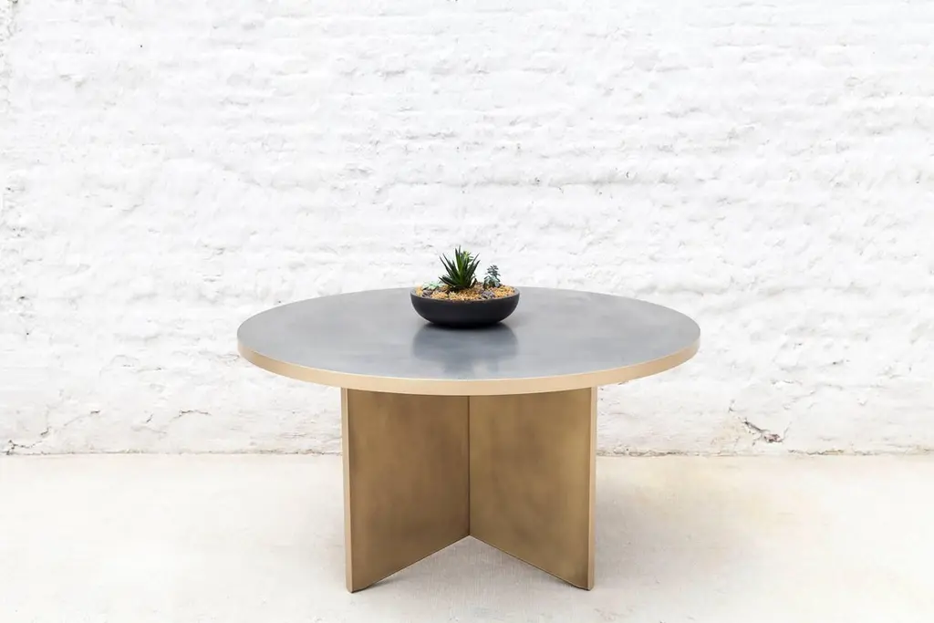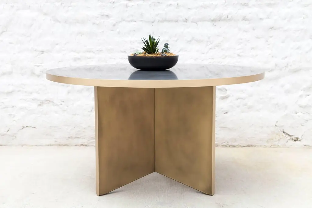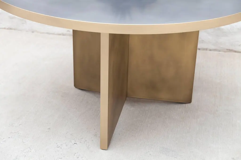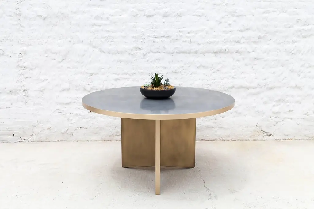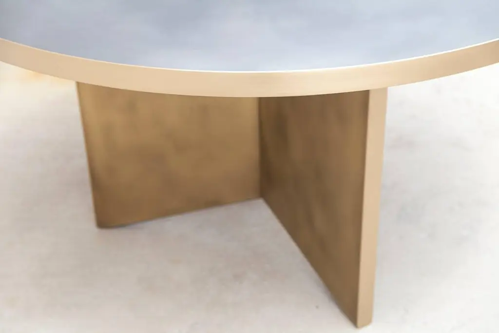 Glamorous and elegant, the Vega dining table artfully mixes metals and shapes. The aluminium encased in epoxy resin tabletop features a bronze edge and is paired with a geometric bronze encased in epoxy resin base. Materials: Al-R (Aluminium encased in Resin), Brz-R (Bronze Encased in Epoxy Resin), bronze.Standard size options: D 42 in. / H 30 in. D 48 in. / H 30 in. D 54 in. / H 30 in. size as shown in imagesD 69 in. / H 30 in. Custom sizing and finishes available.