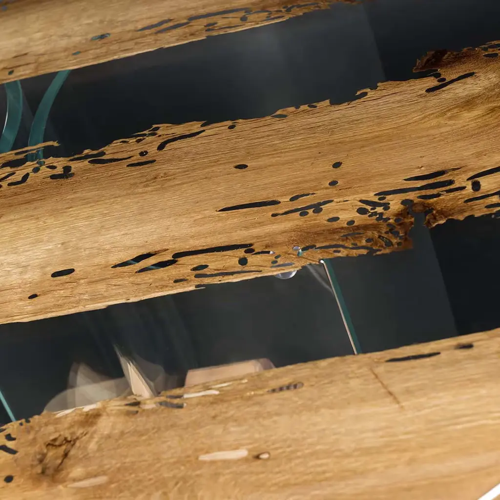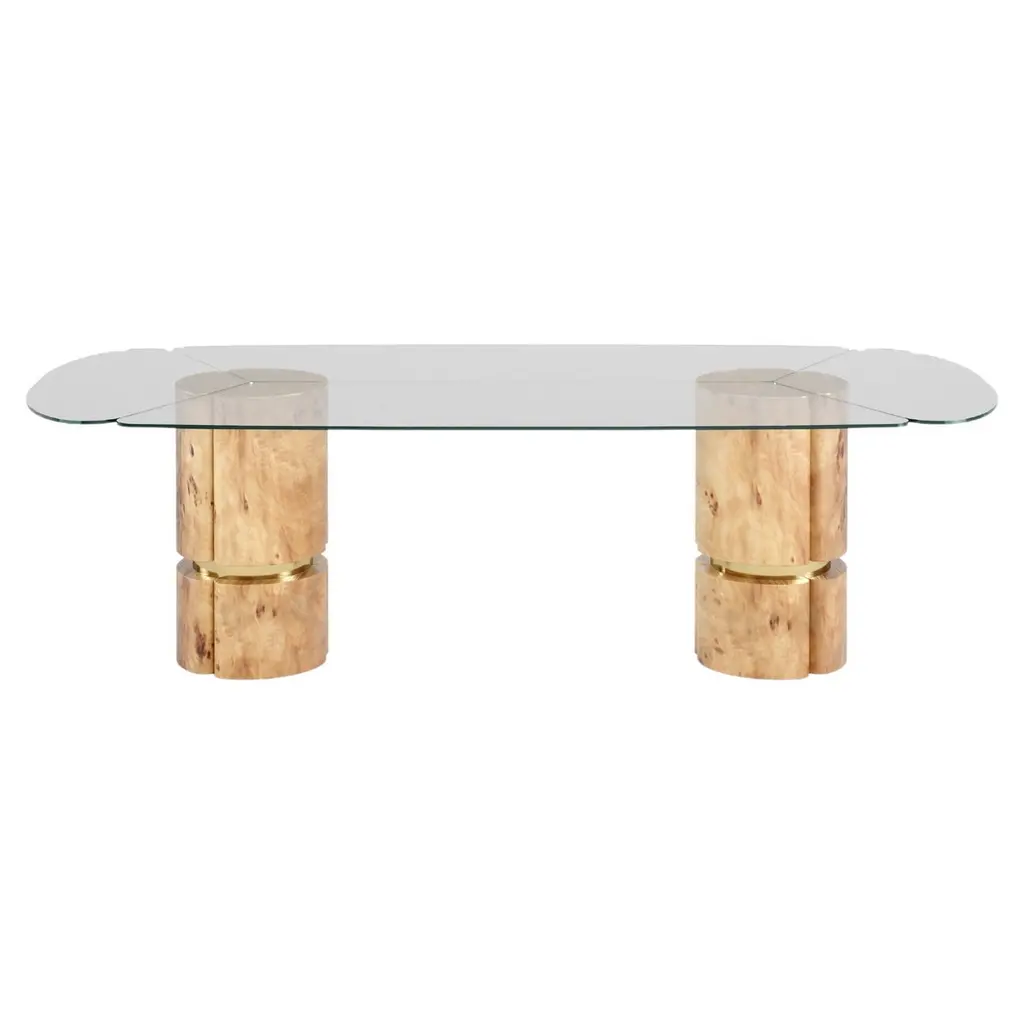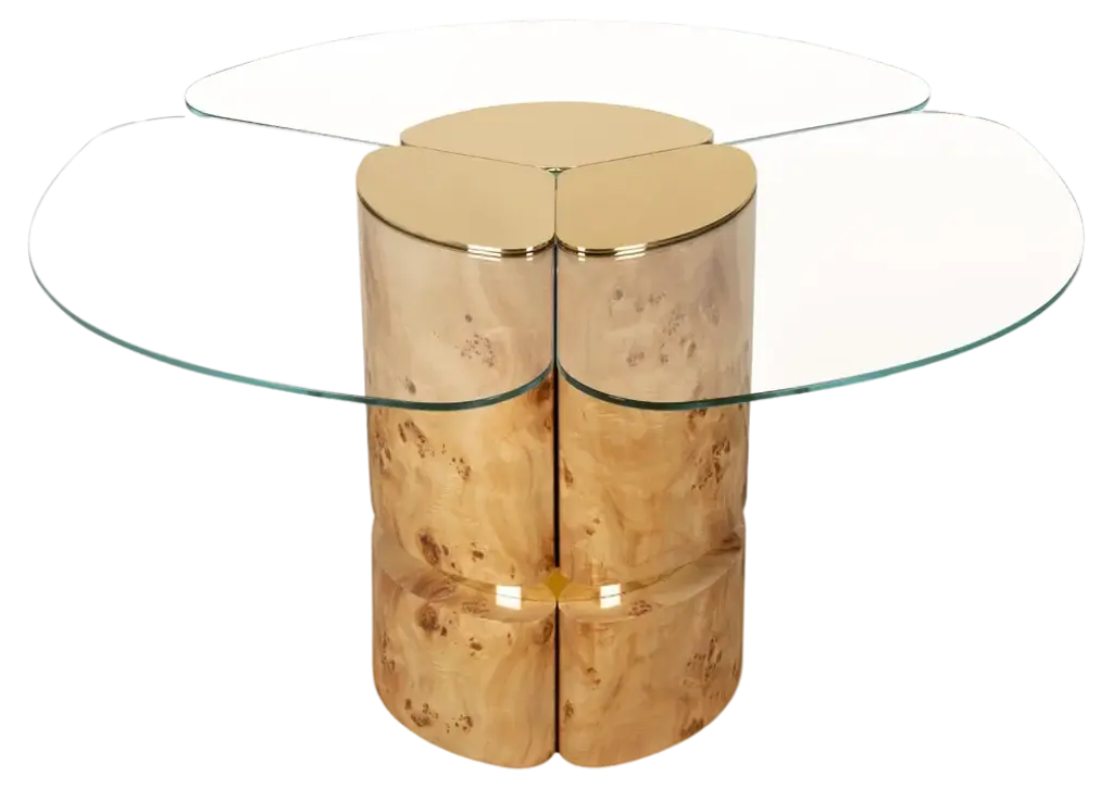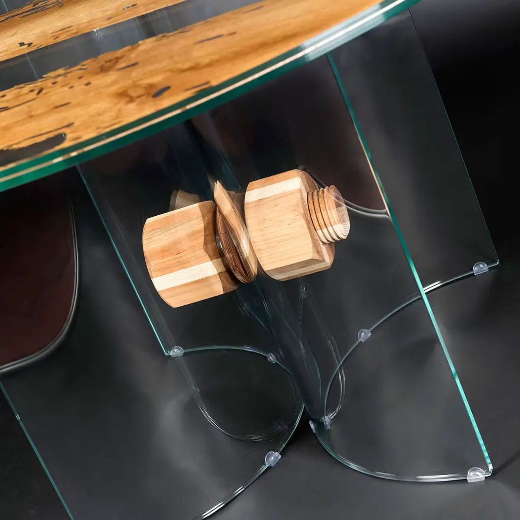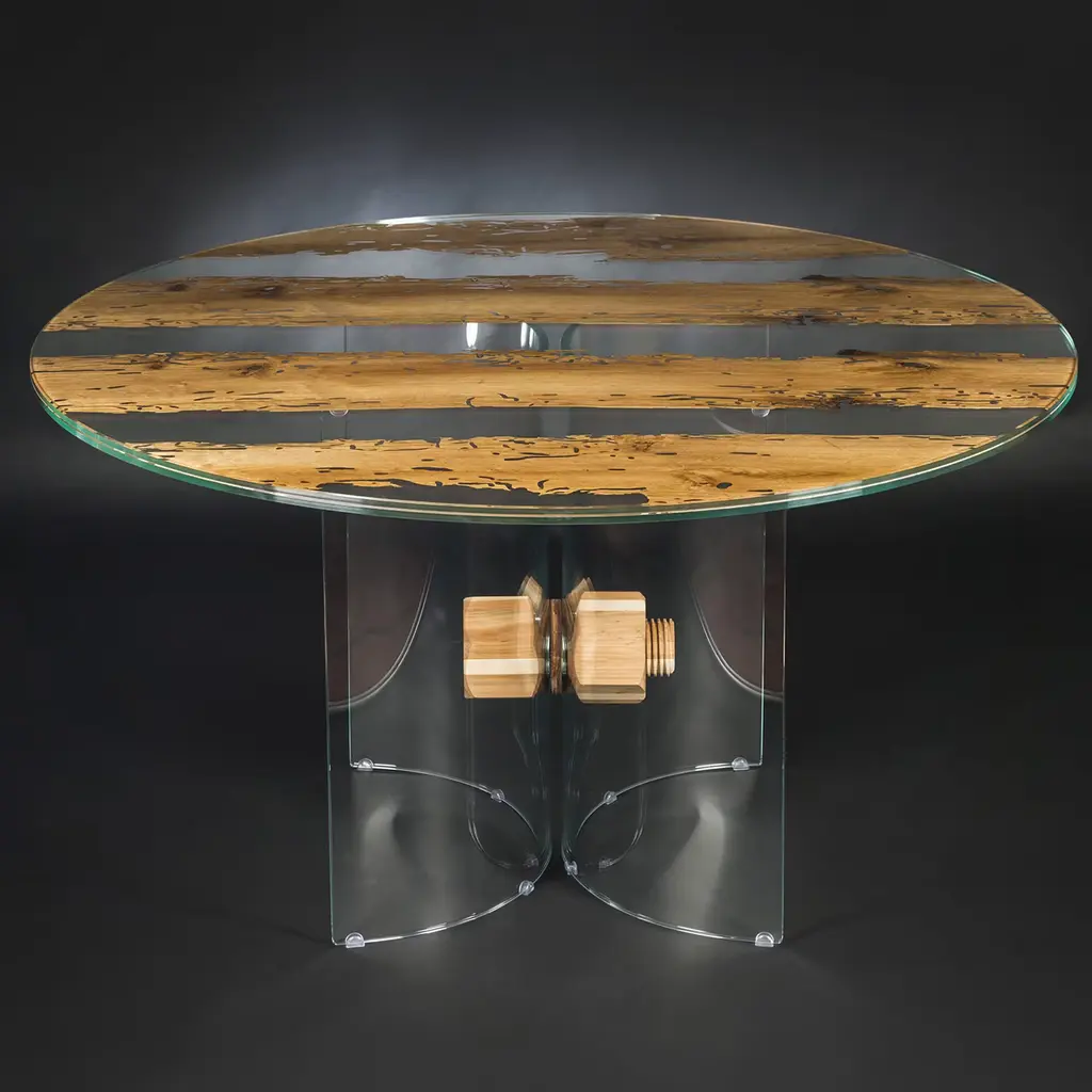 This circular table boasts a singular design that will bring an authentic piece of Venice into any dining room. The ultra-thin durmast sections interposed between the 10mm-thick glass disks are retrieved from dismissed "briccolas", piles used to mark navigable channels. Evoking the lagoon's water with the transparency of its geometric-style glass body, the piece also comes in a console counterpart.