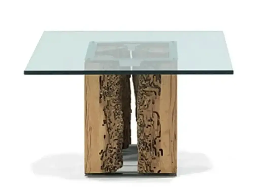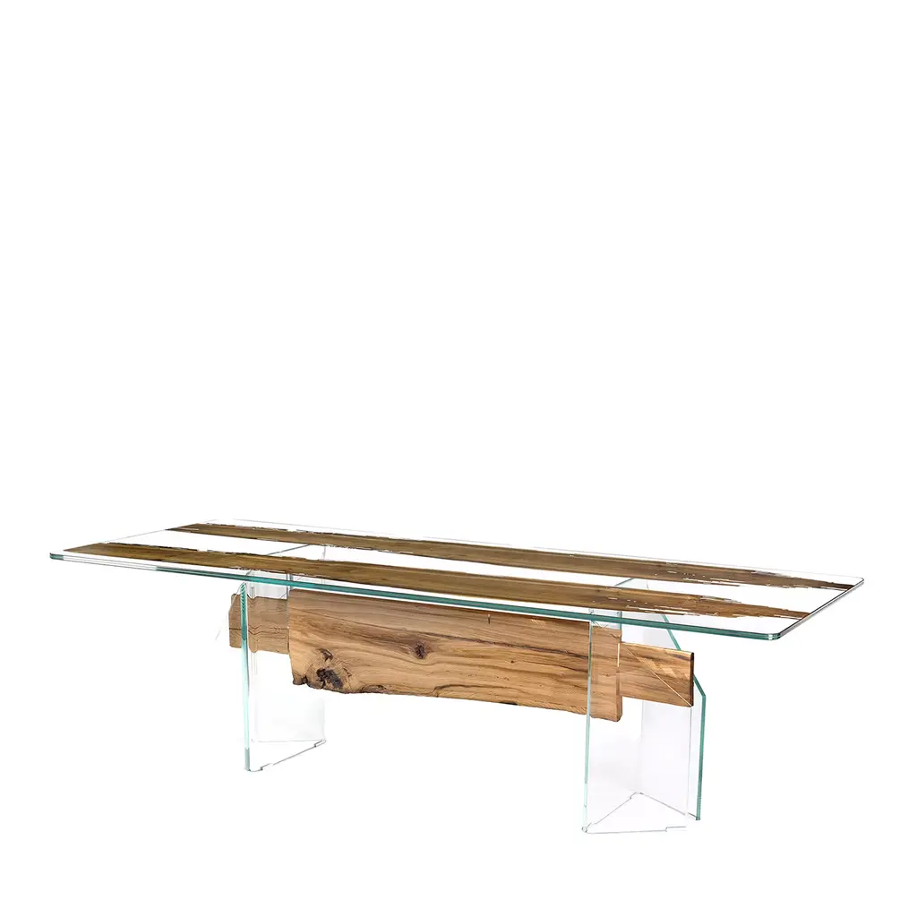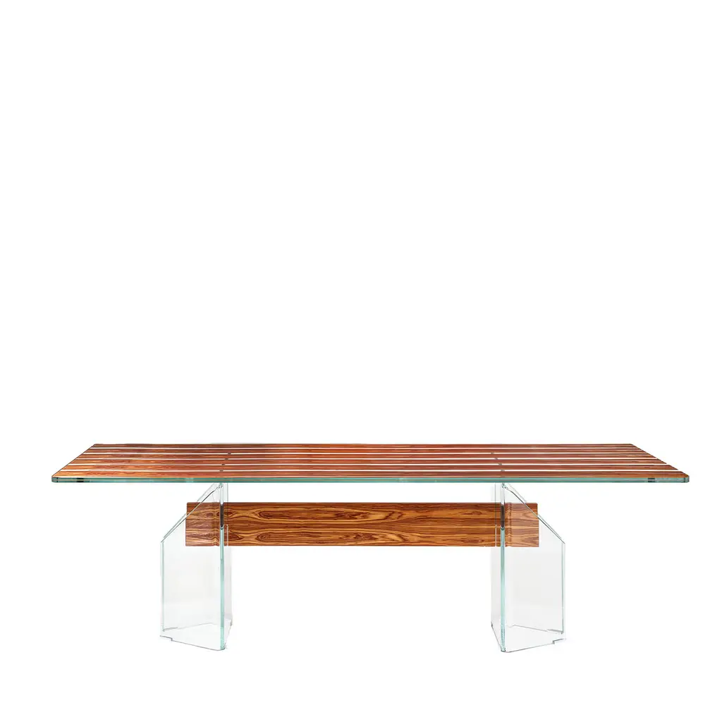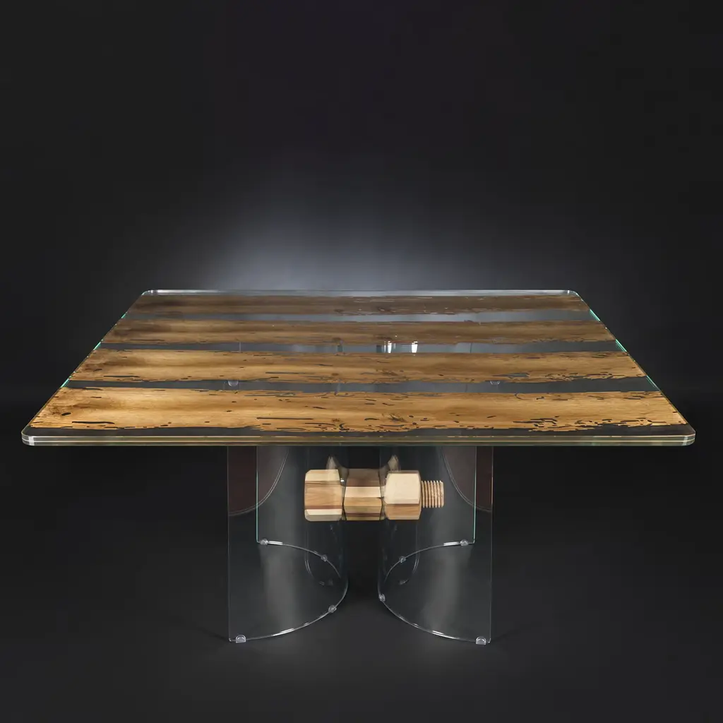 A piece of Venice forever frozen in an elegant modern dining room. This is the purpose behind this dining table, its dynamic design made unique thanks to inserts of discarded durmast wood from "briccole" (posts marking the city's navigation canals) enriching the top. The 1cm-thick glass elements, with their fresh transparency, hint at the lagoon's water.