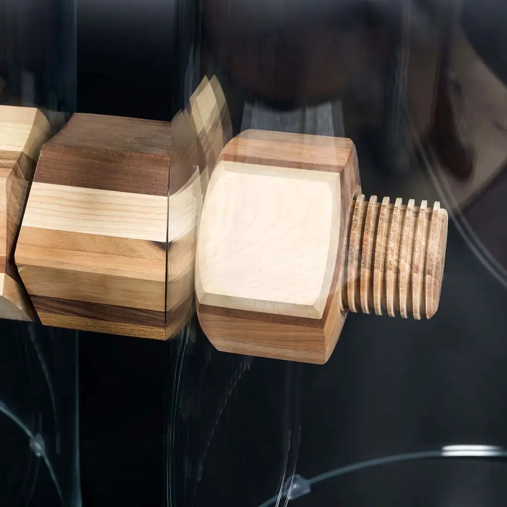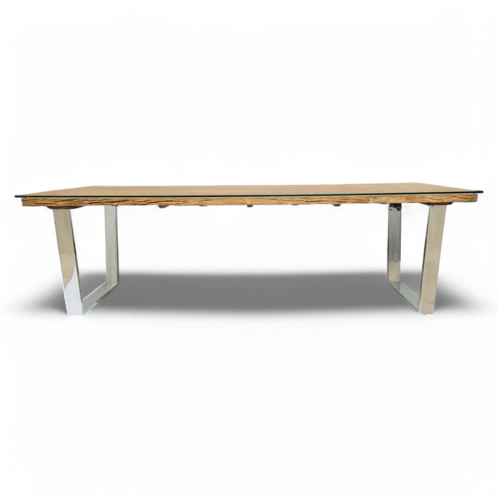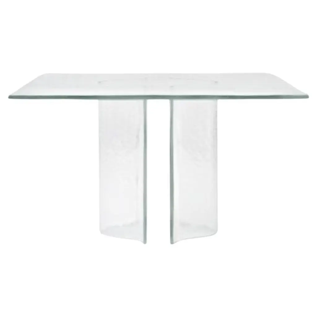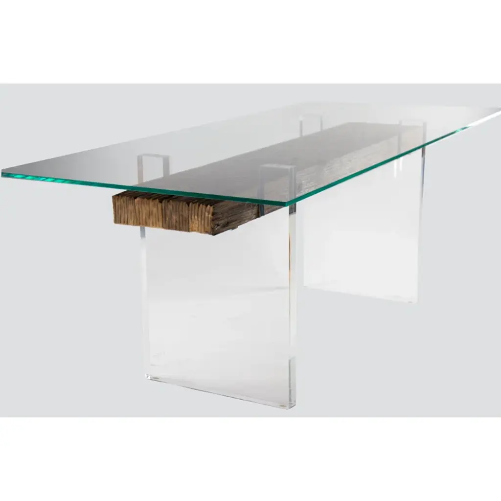 A piece of Venice forever frozen in an elegant modern dining room. This is the purpose behind this dining table, its dynamic design made unique thanks to inserts of discarded durmast wood from "briccole" (posts marking the city's navigation canals) enriching the top. The 1cm-thick glass elements, with their fresh transparency, hint at the lagoon's water.