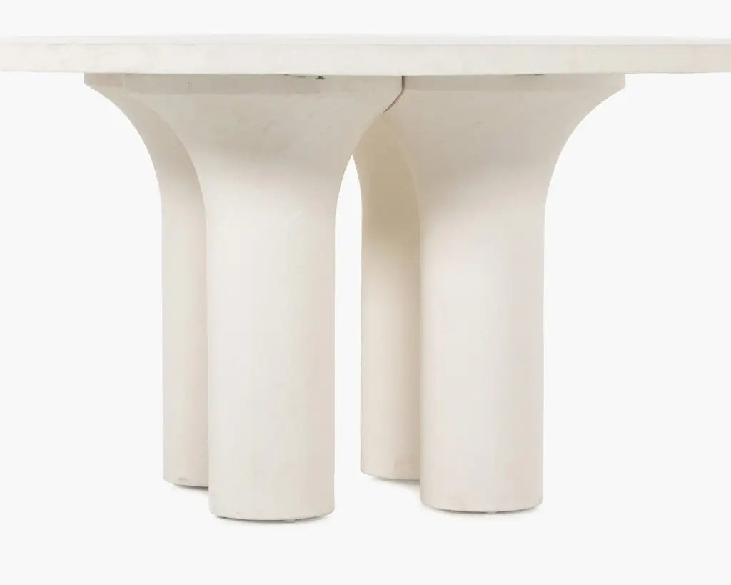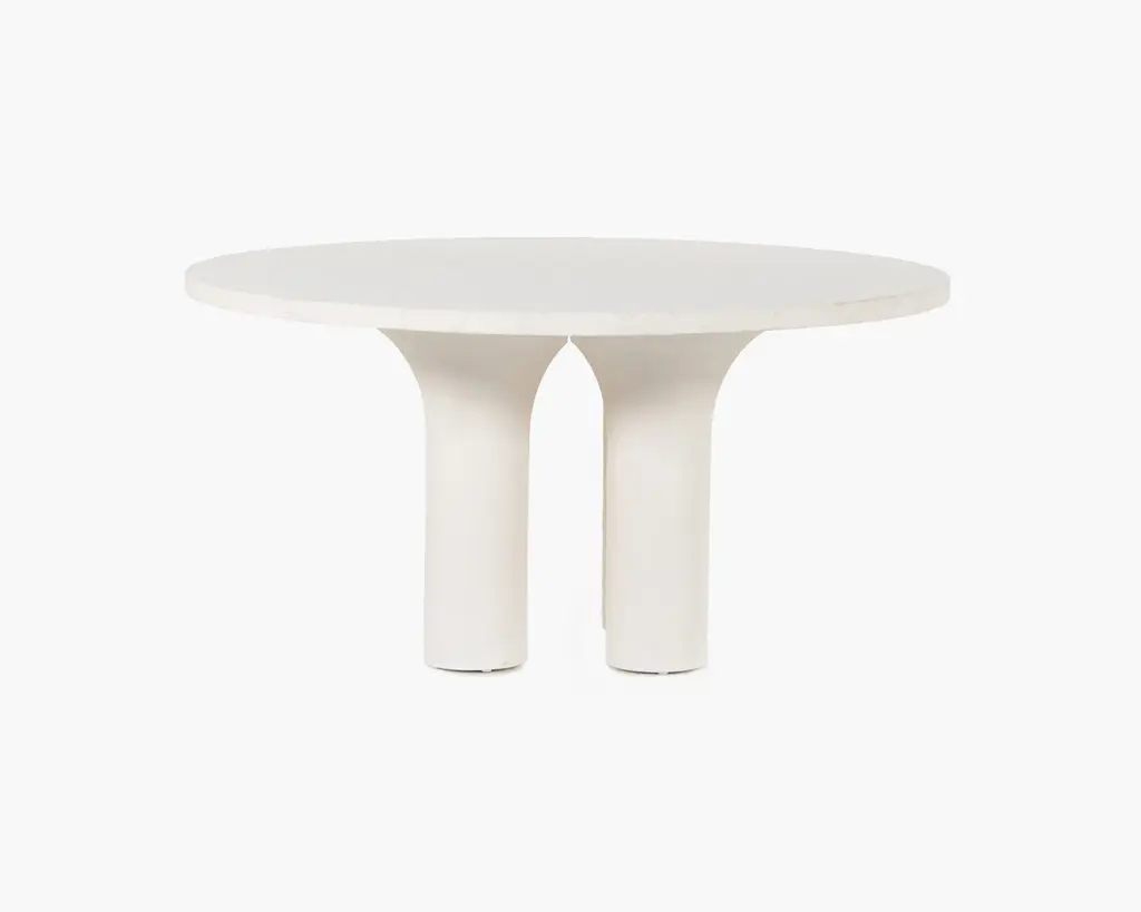 Made from plaster-molded concrete, a cylindrical pillar-style base tapers slightly to support a smooth white-finished tabletop for beautifully complementary texture. Indoors or out; cover or store inside during inclement weather and when not in use. 60" W x 60" D x 30"H Shipping box 1: 67" W x 67" D x 7.5" H, 244lbs. Shipping box 2: 44.5" W x 44.5" D x 37.5" H, 348lbs. Assembly required Receives White Glove delivery