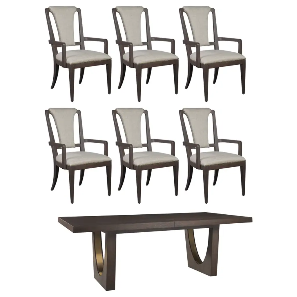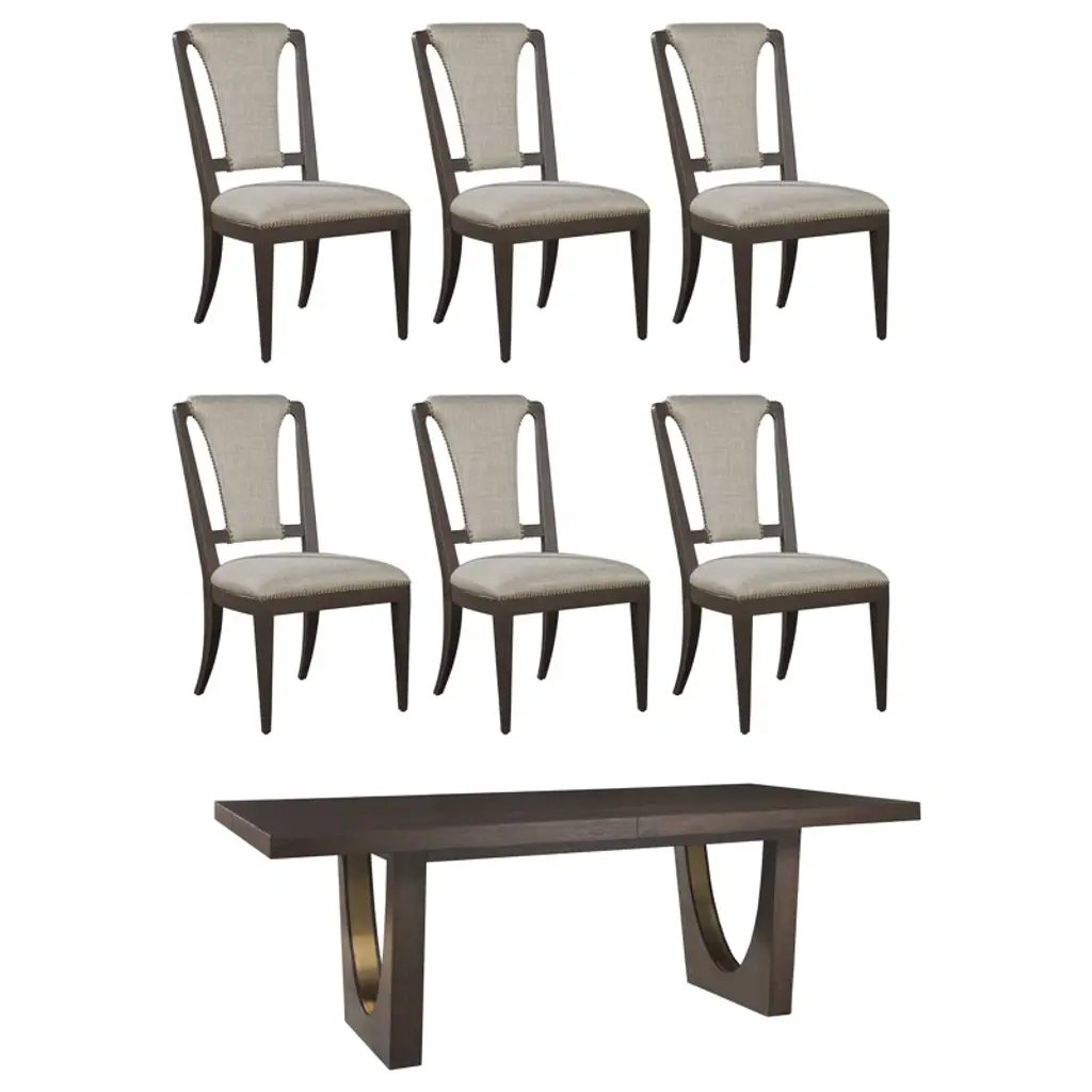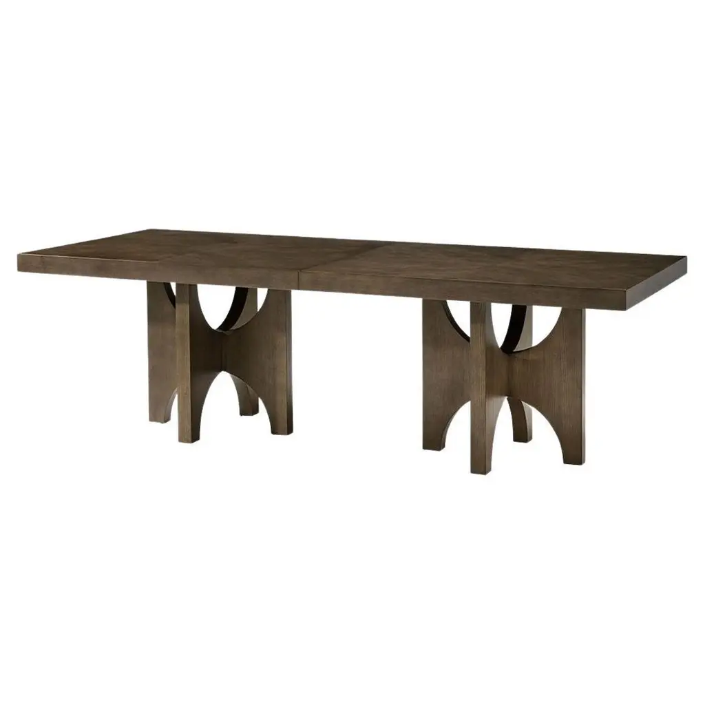 Striking original designs standing in wire-brushed white oak veneers finished in rich brown with a dark glaze on the top accentuating the horizontal grain pattern. The decorative U-shaped base with inlay is finished in antique brass.