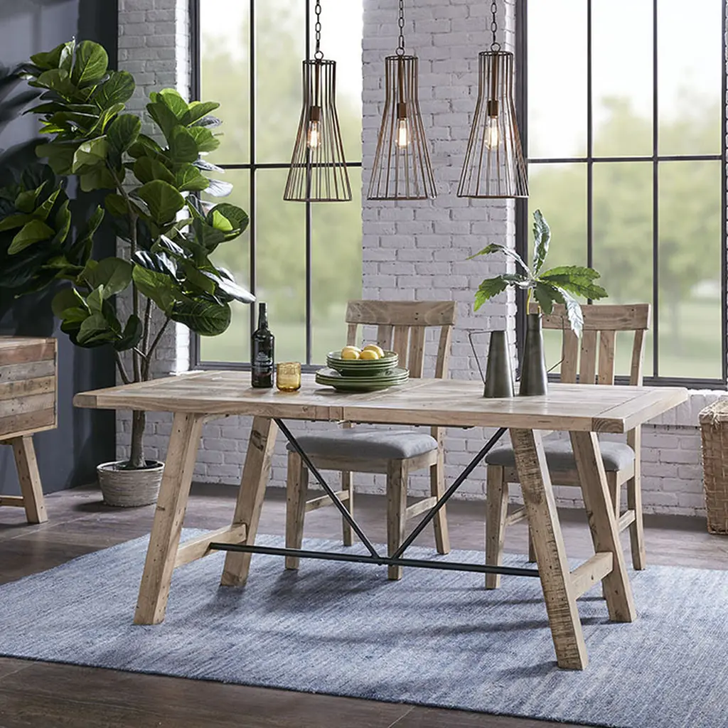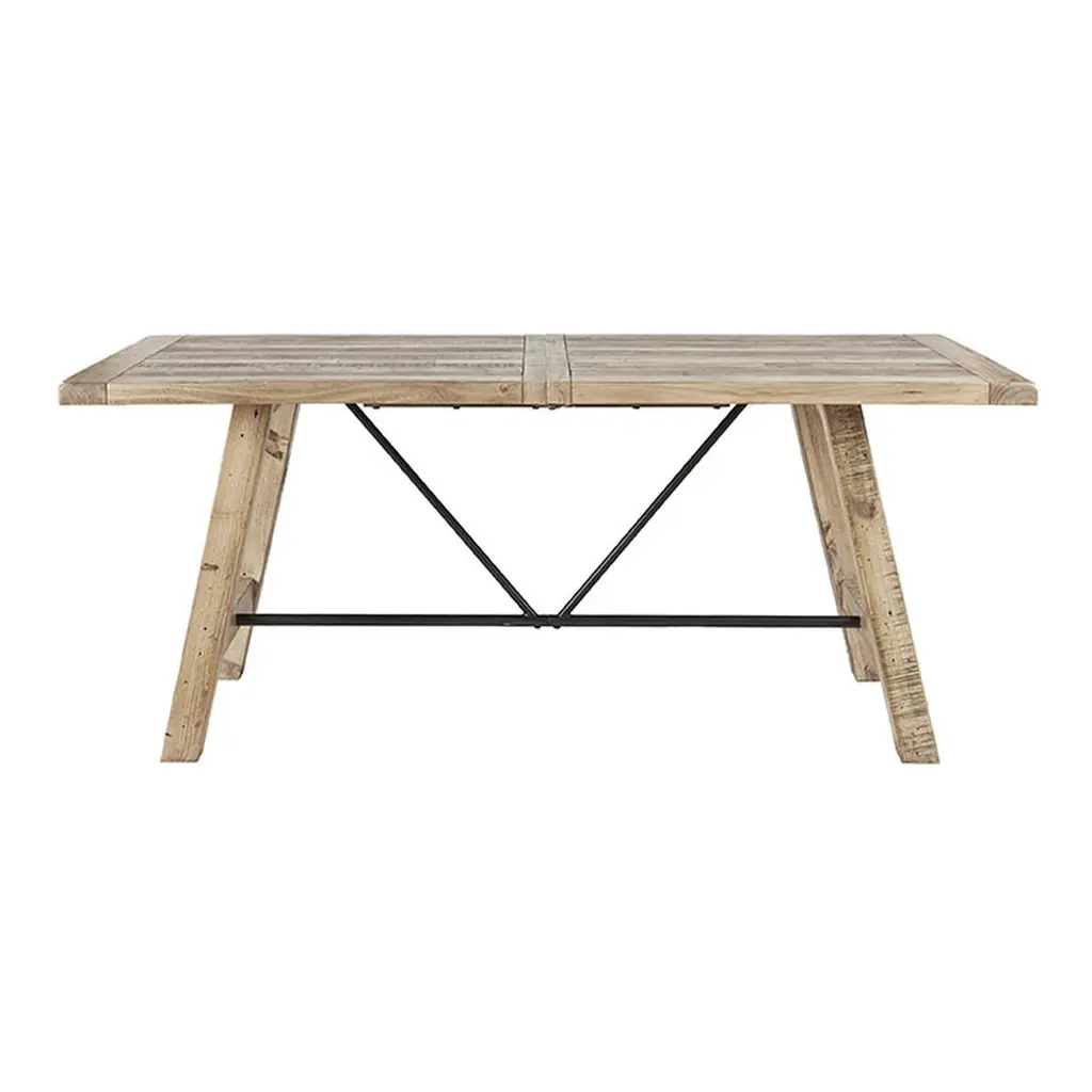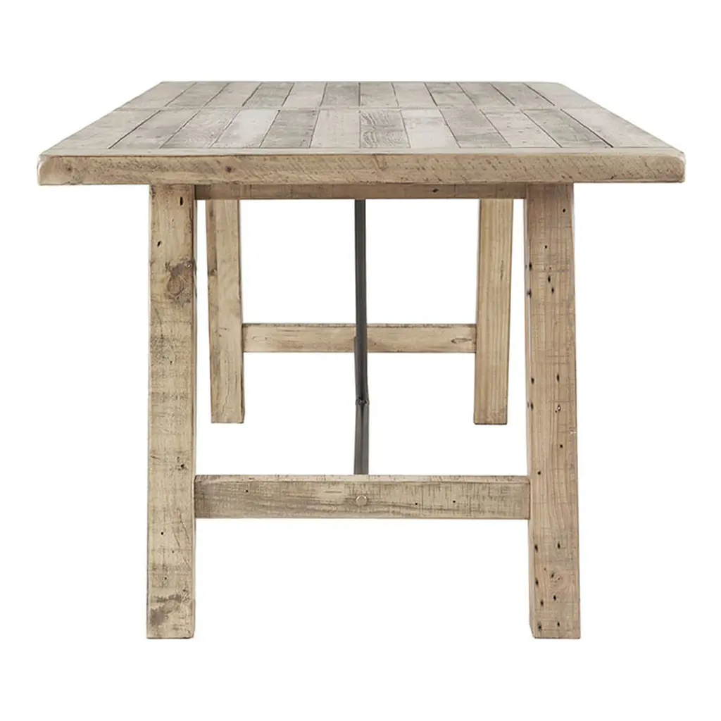 Crafted of weathered natural pine wood with gunmetal stretchers, the Verde dining table unites rustic, industrial and farmhouse design elements. Seating up to six around its solid surface, this charming vintage-inspired dinner table with straight splayed legs complements an array of dining benches and chairs. Its mixed-material craftsmanship and space-saving contours bring French country-style character to dining rooms in a range of sizes.