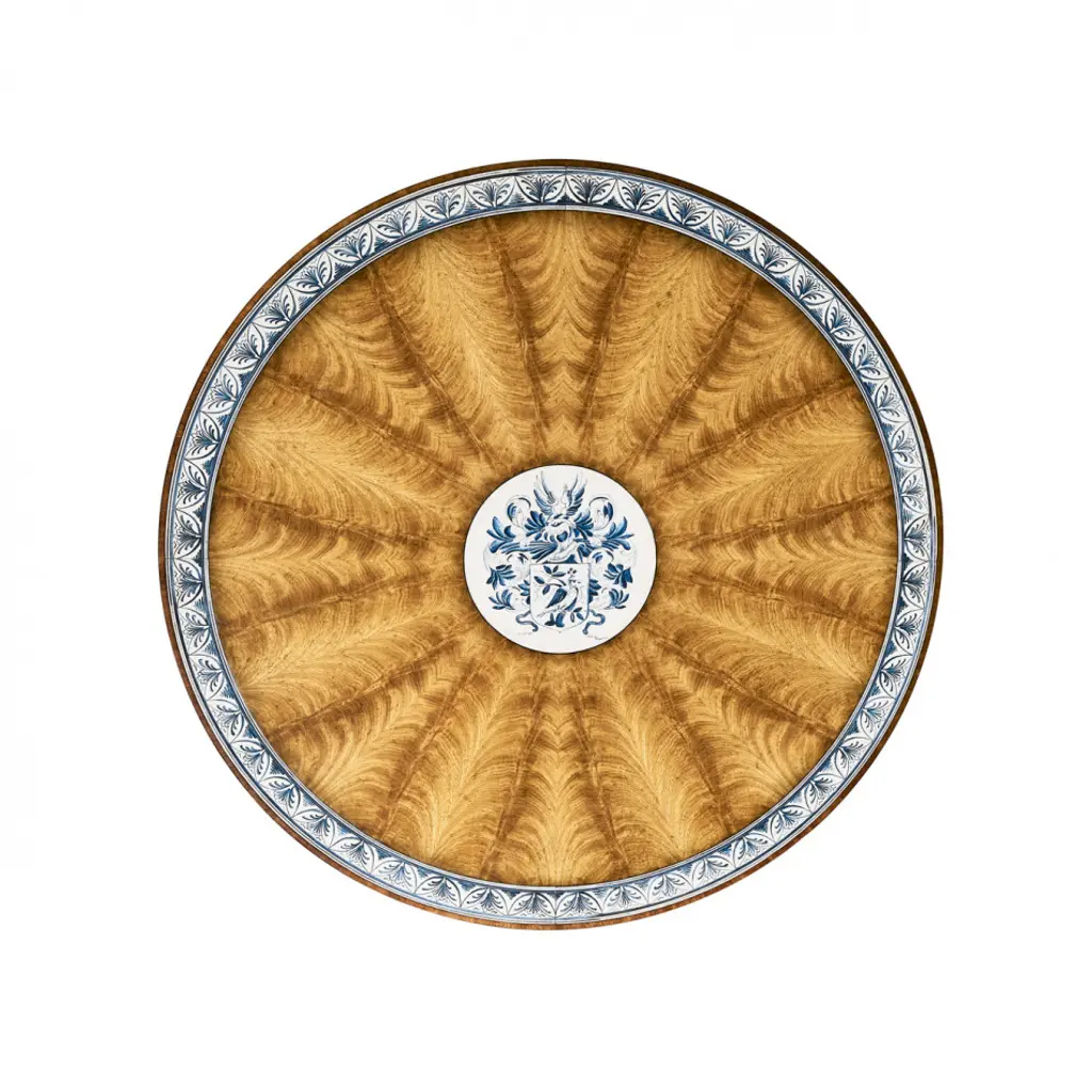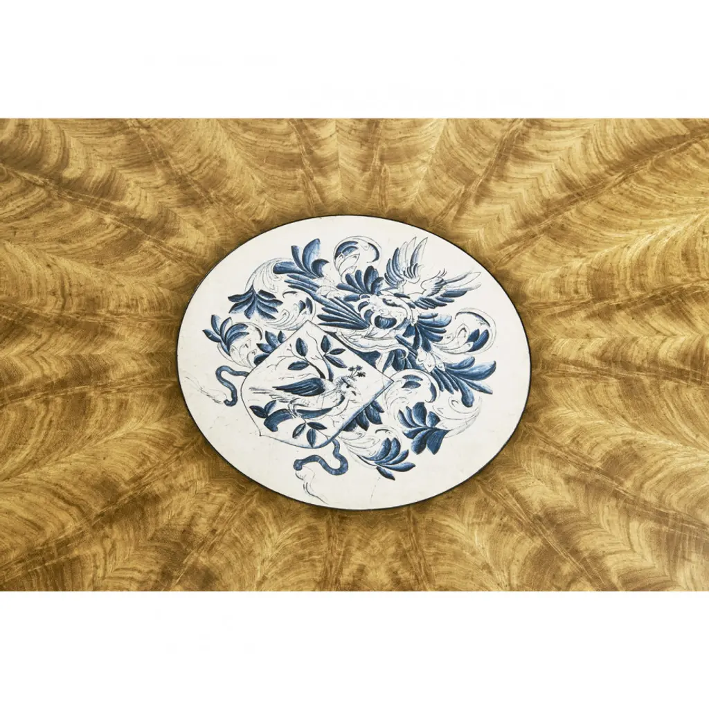 Cerejeira Wood table with delft inspired hand painting along the apron and in the center of the table with crackled lacquer finish.