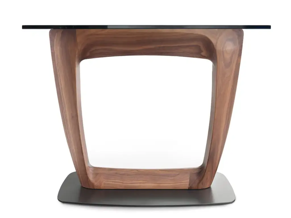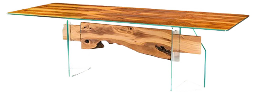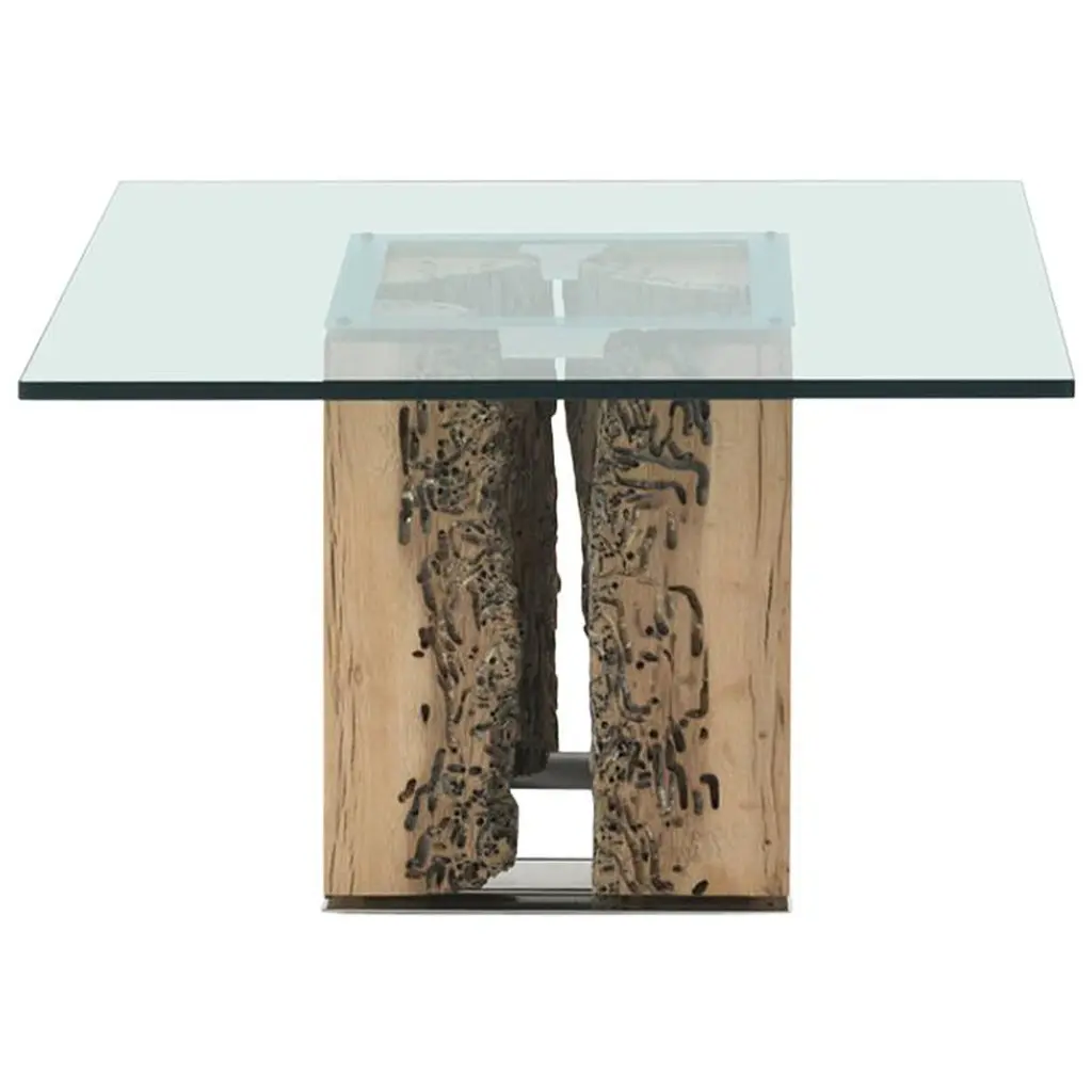 VERSA TABLE is a square dining table made of wood and glass, featuring an extra-clear glass top 1.5 cm thick and legs crafted from solid Briccola wood.