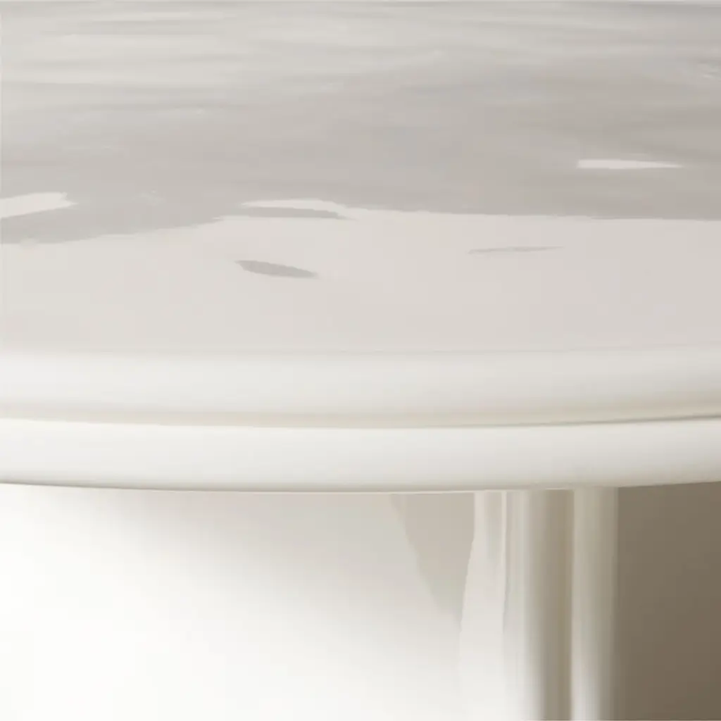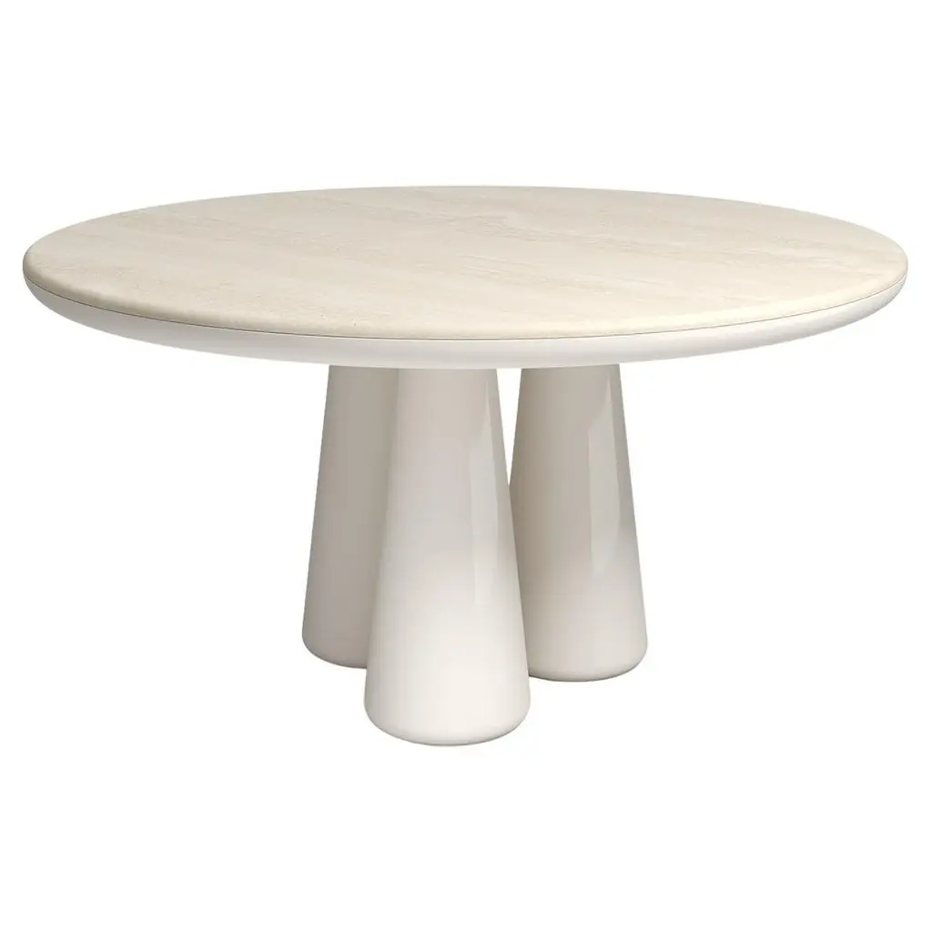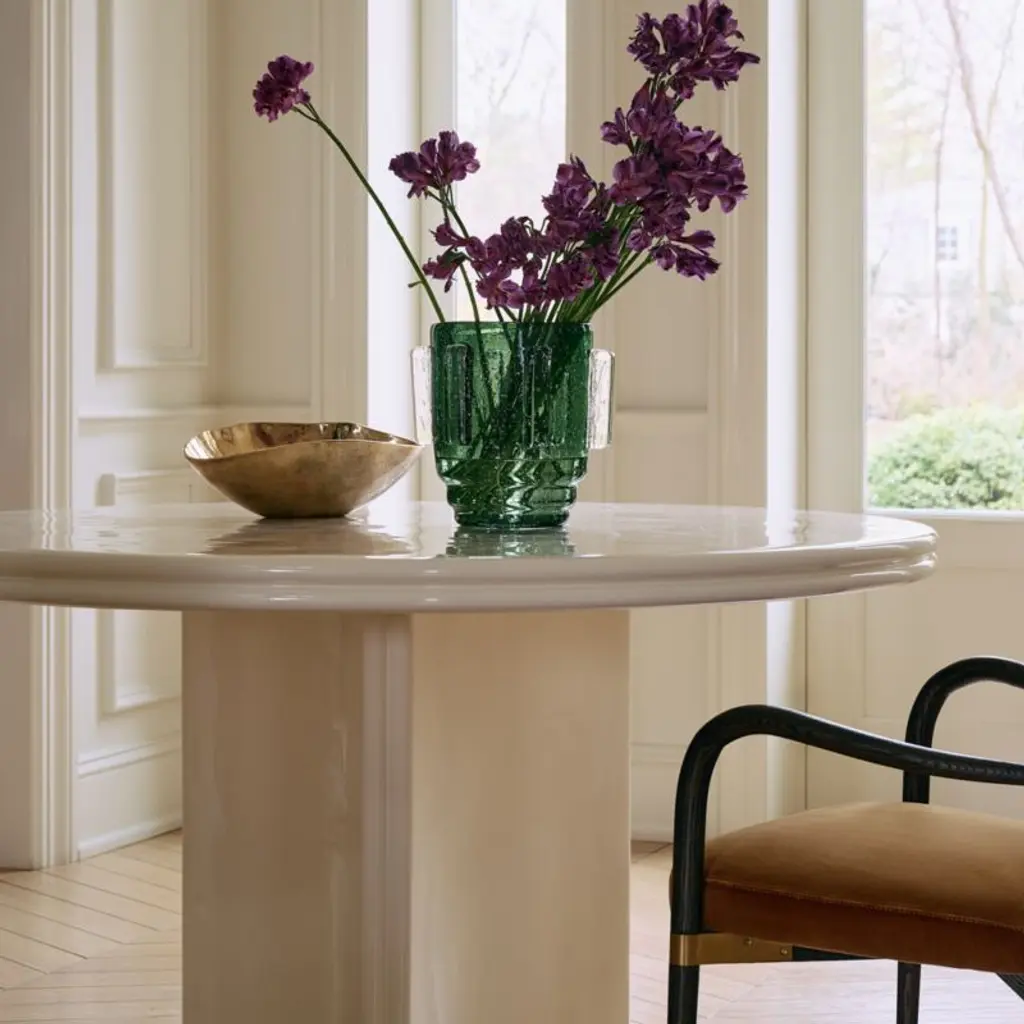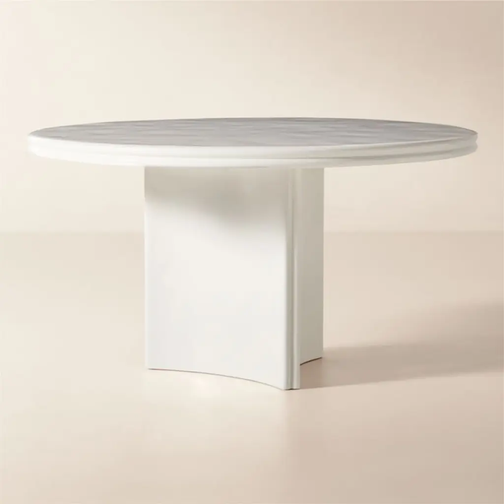 Dining table by Studio ANANSI combines bold form with a refined finish. Designed to seat up to six, the round top is crafted from durable fiberstonea material that blends stone powder for strength and longevityand finished in a high-gloss ivory tone that catches the light beautifully. A smooth, full bullnose edge is stacked for a layered effect. Pedestal base is molded into a star-shaped silhouette that brings unexpected elegance to any dining space. CB2 exclusive.