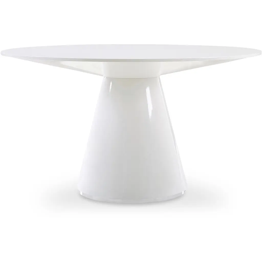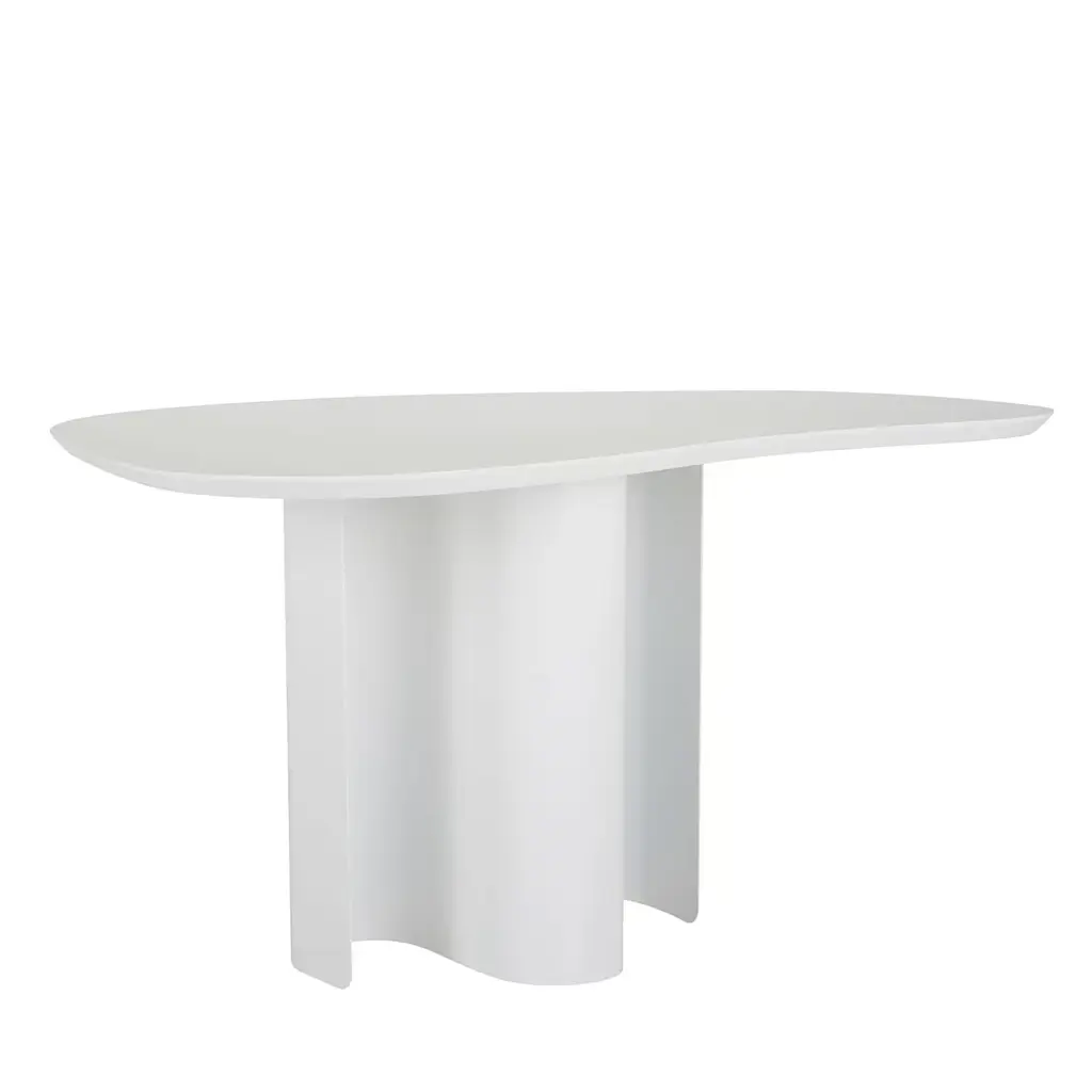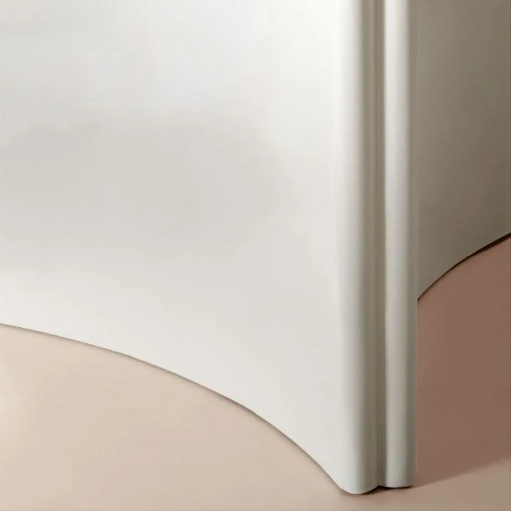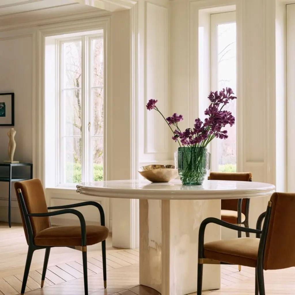 Dining table by Studio ANANSI combines bold form with a refined finish. Designed to seat up to six, the round top is crafted from durable fiberstonea material that blends stone powder for strength and longevityand finished in a high-gloss ivory tone that catches the light beautifully. A smooth, full bullnose edge is stacked for a layered effect. Pedestal base is molded into a star-shaped silhouette that brings unexpected elegance to any dining space. CB2 exclusive.