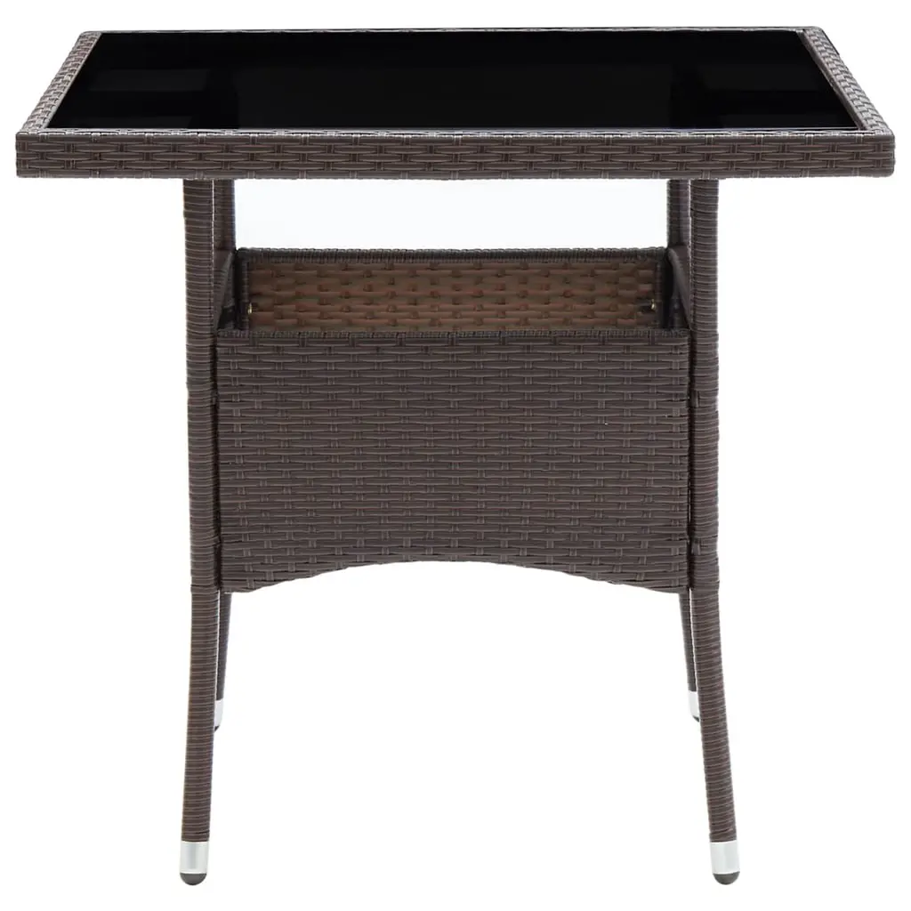 This dining table blends modern design and solid durability, making it a top pick for indoor and outdoor use. Built with a sturdy powder-coated steel frame and eye-catching poly rattan legs, its sleek glass top has loads of room for outdoor meals or small gatherings, fitting perfectly on balconies, patios, or in dining rooms. Durable Build: Made from sturdy materials, with UV-resistant poly rattan and tempered glass, this table can handle outdoor elements while keeping its stylish look. Getting this table means you'll have a lasting piece that doesn't skimp on looks or utility.Modern Style: Its trendy design features clean lines with a lovely brown and black color scheme that fits well with any décor. This table will jazz up your dining area, becoming a central hangout for friends and family.Spacious and Functional: With dimensions of 31.5 in by 31.5 in and a height of 29.5 in, it fits 4 people comfortably, making it perfect for family dinners or hosting friends. Its generous top gives you plenty of space for dishes, drinks, and decorations.Indoor/Outdoor Versatility: Built for both indoor and outdoor fun, this table is spot on for al-fresco dining in your garden or casual breakfasts on the balcony. It's a flexible addition to any home, easily fitting into all settings.Easy Maintenance: The materials used let you clean it with ease; just wipe with a damp cloth, and to keep it lasting, it's a good idea to cover it during rough weather. This feature makes it a top choice for busy households.