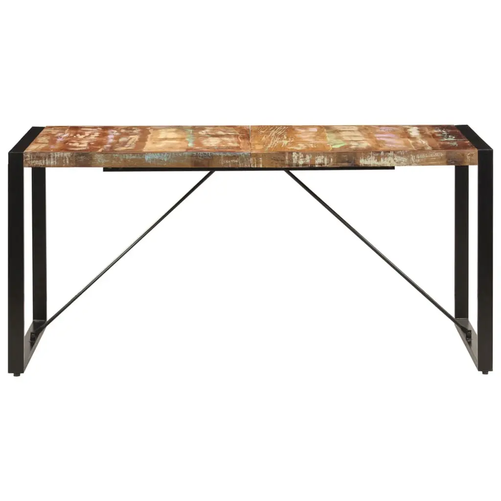 This dining table is a stunning blend of rustic charm and modern strength, catching the eye with its solid reclaimed wood top and sleek black powder-coated steel legs. At 63.0 in long, 31.5 in wide, and 29.5 in high, it's designed to comfortably fit up to six folks, perfect for family get-togethers and dinner parties, with its unique multicoloured wood grain stealing the spotlight and warming up any dining area. Unique Reclaimed Design: Each table is made from reclaimed wood, offering a unique look with lots of textures and hues. This is not just eco-friendly but also guarantees that every piece is one of a kind, adding a special touch to your home.Sturdy Construction: The tough steel legs provide great stability, while the solid wood top ensures the table's built to last. Whether you’re enjoying a casual meal or hosting a fancy dinner, this table has got your back.Versatile Usage: Perfect for both dining rooms and kitchens, this table adds character to any space. Its rustic style goes well with various designs, whether vintage, industrial, or contemporary, making it fit right in.Easy Maintenance: Made for daily life, the polished surface allows easy cleaning with a damp cloth. Just keep it out of direct sunlight and avoid spills to keep it looking fab. This way, your table stays gorgeous, functional, and long-lasting.Generous Size: With dimensions of 63.0 in long, 31.5 in wide, and 29.5 in high, it seats up to six people comfortably. Perfect for family meals, social gatherings, or even as a workspace for your creative projects.
