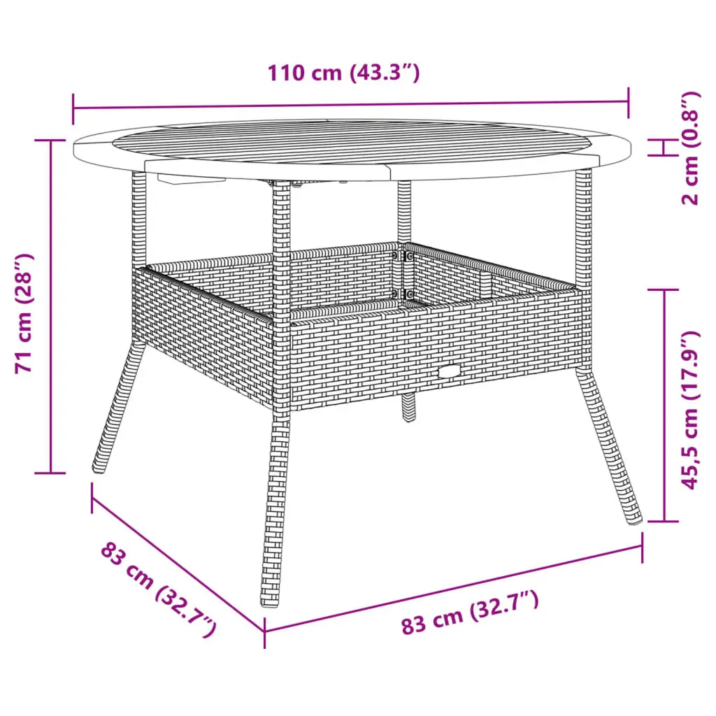This round garden table, topped with acacia wood, is a perfect centerpiece for outdoor dining or hangouts over coffee. Its modern design blends style and practicality, ideal for sprucing up patios, terraces, or balconies. Material Excellence: Solid acacia wood paired with tough poly rattan means it’s built to last, ideal for outdoor spots. Contemporary Elegance: Stylish lines and its modern round shape means it’s not just functional but also fashionable in your outdoor area. Comfortable Seating: With a generous Ø43.3 in diameter, this table welcomes diners or coffee lovers, creating a friendly vibe. Weather-Resistant Design: Ready to face outdoor conditions, it’s great for year-round use, keeping your outdoor area looking fantastic. Effortless Care: With a smooth, oiled surface, this table is easy to clean and maintain, so you can enjoy your outdoor time without hassle.