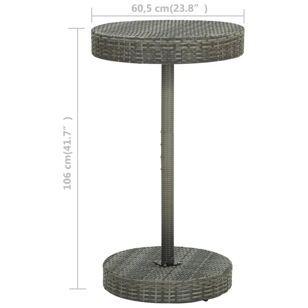 This Grey Poly Rattan Round Garden Table is the perfect mix of style and practicality. It's great for both inside and outside, featuring a sleek surface made from strong synthetic material, making it an excellent pick for coffee or dining setups in different environments. Durable Construction: Made from top-notch, UV-resistant poly rattan, this table can handle different weather conditions, ensuring it lasts in any environment.Lightweight Design: It’s way lighter than your usual tables, making it easy to move around for casual get-togethers or seasonal setups.Compact Size: Measuring 23.8 in across and 41.7 in high, it's designed to fit one person snugly, perfect for intimate meals or casual coffee chats.Stylish Appearance: The modern round design and grey finish go well with all sorts of decor, adding flair to your balcony or patio.Easy Maintenance: The table's surface wipes down easily, keeping it looking fresh with just a quick clean with a damp cloth.